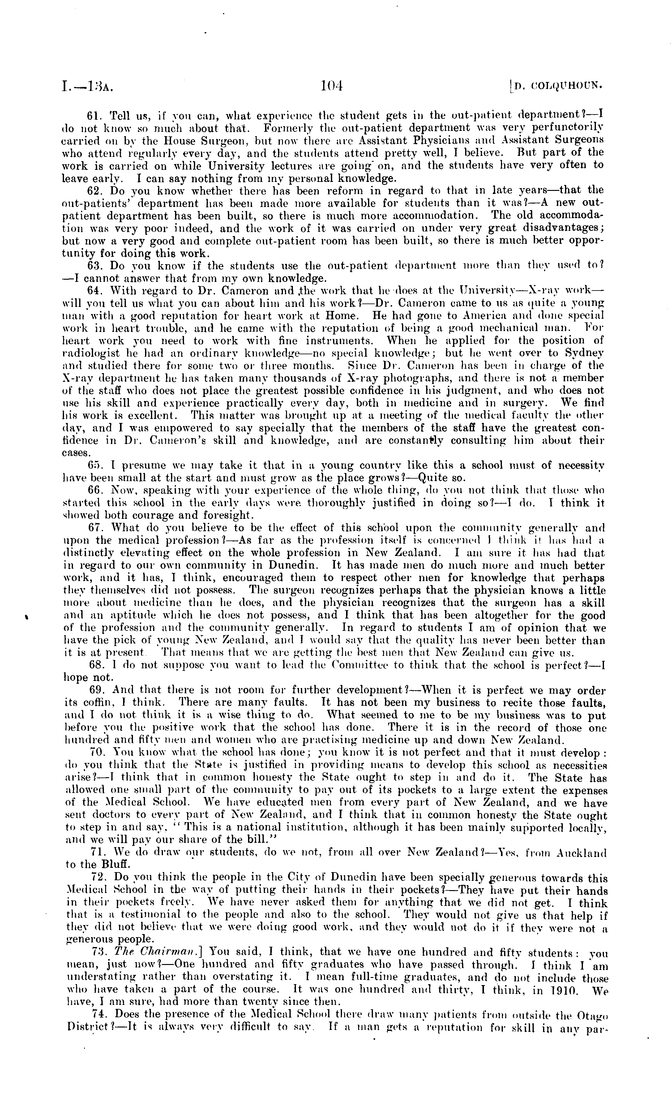 61. Tell us, if you oan, what experience the student gets in the out-patieni department I—l1 — I do not know s<, much aboul that. Formerlj the out-patienl department was very perfunctorily carried on by the House Surgeon, bul now there are Assistant Physicians and Assistant Surgeons who attend regularly every day. and the students attend pretty well, 1 believe. But part of the work is carried on while University lectures are going' on, and the students have very often to leave early. I can say nothing from my personal knowledge. 62. Do you know whether there lias been reform in regard to that in late years — that the out-patients' departmeni has been made more available for students than it was? —A new outpatient department lias been built, so there is much more accommodation. The old accommodation was very poor indeed, and the work of it was carried on under very great disadvantages; but now a very good and complete out-patient room has been built, so there is much better opportunity for doing this work. (1. , !. Do you know if the students use the out-patient department more than they used d>.' —I cannot answer that from my own knowledge. G4. With regard to Dr. Cameron and .the work that he does at the University — X-ray work— will you tell us what you can about him and his work? —Dr. Cameron came to us as quite a young man with a good reputation for heart work at Home. He had gone to America and done special work in heart trouble, and he came with the reputation of being a good mechanical man. For heart work you need to work with fine instruments. When lie applied for the position of radiologist he had an ordinary knowledge—no special knowledge; but he went over to Sydney and studied there for some two or three months. Since Dr. Cameron lias been in charge of the X-ray department he has taken many thousands of X-ray photographs, and there is not a member of the staff whd does not place the greatest possible confidence in his judgment, and who does not use his skill and experience practically every day. both in medicine and in surgery. We linil his work is excellent. This matter was brought up at a meeting of the medical faculty the (it her day, and 1 was empowered to say specially that the members of the staff have the greatest conli'lrnce in Dr. Cameron's skill and knowledge, and are constantly consulting him aboul their cases. (>.">. I presume we may take it that in a young country like this a school must of necessity have been small at the stall and must grow as the place grows?— Quite so. 66. Now, speaking with your experience of the whole thing, do you not think that those who started this school in the early days were thoroughly justified in doing so?— 1 do. I think it showed both courage and foresight. 67. What do vim believe to be the effect of this school upon the community generally and upon tin medical profession I—As1 —As far as the profession itself is concerned I think ii lias had a distinctly elevating effect on the whole profession in New Zealand. 1 am sure it has had that in regard to our own community in Dunedin. It has made men do much mure ami much better work, and it has, 1 think, encouraged them to respect other men for knowledge that perhaps they themselves did not possess. The surgeon recognizes perhaps that the physician knows a little more about medicine than he does, and the physician recognizes that the surgeon has a skill % and an aptitude which he does not possess, and I think that has been altogether for the good of the profession and the community generally. In regard to students 1 am of opinion that we have the pick of young Xew Zealand, and I would say that the quality has never been better than it is at present That means that we are getting the best men that New Zealand can give us. 68. I do not suppose you want to lead the Committee to think that the school is perfect?—l hope not. 69. And that there is not room for further development I —When it is perfect we may order its coffin, I think. There are many faults. It has not been my business to recite those faults, and 1 do not think it is a wise thing to do. What seemed to mi' to be my business was to put before you the positive work that the school has done. There it is in the record of those one hundred and fifty men and women who are practising medicine up and down New Zealand. 70. V»ii know what the school has done; you know it is not perfect and that it must develop : do you think that the State is justified in providing means to develop this school as necessities arise?— l think that in common honesty the State ought to step in and do it. The State has allowed one small part of the community to pay out of its pockets to a large extent the expenses of the Medical School. We have educated men from every part of New Zealand, and we have sent doctors to every parl of New Zealand, and I think that in common honesty the State ought to step in and say, " This is a national institution, although it has been mainly supported locally, and we will pay our share of the bill." 71. We do draw our Students, do we not. from all over Xew Zealand? —Yes, from Auckland to the Bluff. 72. Do you think the people in the City of Dunedin have been specially generous towards this Medical School in the way of putting their hands in their pockets? —They have put their hands in their pockets freely. We have never asked them for anything that we did not get. I think that is a testimonial to the people and also to the school. They would not give us that help if they did not believe that we were doing good work, and they would not do it if they wrvr not a generous people. 7."i. The Chairman.] You said. I think, that we have one hundred and fifty students: you mean, just now? —One hundred and fifty graduates who have passed through. I think I am understating rather thl veistating it. I mean lull-time graduates, and do not include those who have taken a part of the course. It was one hund