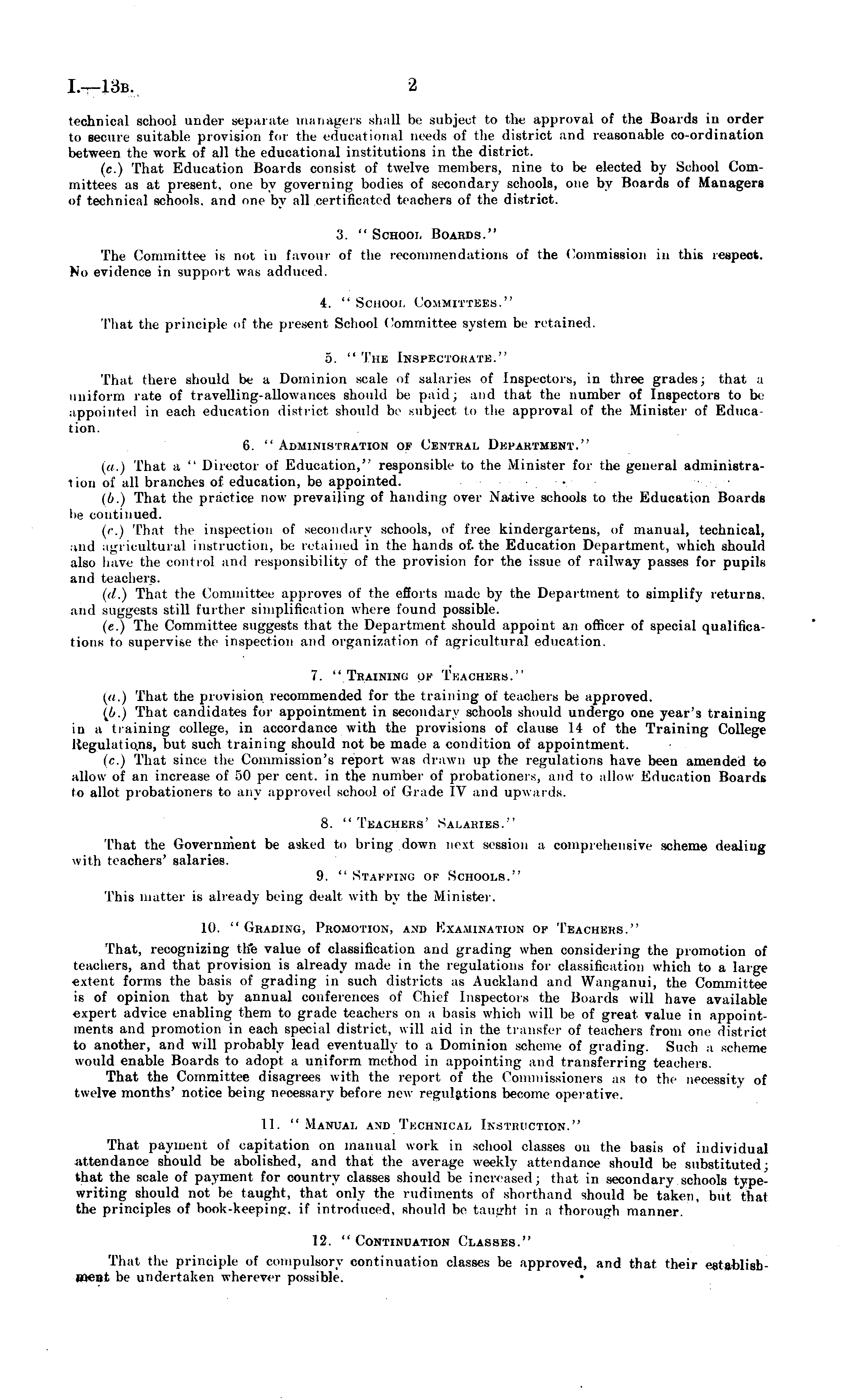 technical school under separate managers shall be subject to the approval of the Boards in order to secure suitable provision for the educational needs of the district and reasonable co-ordination between the work of all the educational institutions in the district. (c.) That Education Boards consist of twelve members, nine to be elected by School Committees as at present, one by governing bodies of secondary schools, one by Boards of Managers of technical schools, and one by all certificated teachers of the district. 3. " School Boards." The Committee is not in favour of the recommendations of the Commission in this respect. No evidence in support was adduced. 4. "School Committees." That the principle of the present School Committee system be retained. 5. " The Inspectorate." That there should be a Dominion scale of salaries of Inspectors, in three grades; that a uniform rate of travelling-allowances should be paid; and that the number of Inspectors to be appointed in each education district should be subject to the approval of the Minister of Education. 6. " Administration of Central Department." («.) That a " Director of Education," responsible to the Minister for the general administration of all branches of education, be appointed. - (6.) That the practice now prevailing of handing over Native schools to the Education Boards he continued. (c.) That the inspection of secondary schools, of free kindergartens, of manual, technical, and agricultural instruction, be retained in the hands of. the Education Department, which should also have the control and responsibility of the provision for the issue of railway passes for pupils and teachers. (>/.) That the Committee approves of the efforts made by the Department to simplify returns, and suggests still further simplification where found possible. (c.) The Committee suggests that the Department should appoint an officer of special qualifications to supervise the inspection and organization of agricultural education. 7. "Training of Teaoheks." (a.) That the provision recommended for the training of teachers be approved. {b.) That candidates for appointment in secondary schools should undergo one year's training in a training college, in accordance with the provisions of clause 14 of the Training College Regulations, but such training should not be made a condition of appointment. (c.) That since the Commission's report was drawn up the regulations have been amended to allow of an increase of 50 per cent, in the number of probationers, and to allow Education Boards to allot probationers to any approved school of Grade IV and upwards. 8. "Teachers' Salaries." That the Government be asked to bring down next session a comprehensive scheme dealing with teachers' salaries. 9. " STAFFING OF Schools." This matter is already being dealt with by the Minister. 10. " Grading, Promotion, and Examination of Teachers." That, recognizing tlfe value of classification and grading when considering the promotion of teachers, and that provision is already made in the regulations for classification which to a large extent forms the basis of grading in such districts as Auckland and Wanganui, the Committee is of opinion that by annual conferences of Chief Inspectors the Boards will have available expert advice enabling them to grade teachers on a basis which will be of great value in appointments and promotion in each special district, will aid in the transfer of teachers from one district to another, and will probably lead eventually to a Dominion scheme of grading. Such a scheme would enable Boards to adopt a uniform method in appointing and transferring teachers. That the Committee disagrees with the report of the Commissioners as to the necessity of twelve months' notice being necessary before new regulations become operative. 11. "Manual and Technical Instruction." That payment of capitation on manual work in school classes on the basis of individual attendance should be abolished, and that the average weekly attendance should be substituted • that the scale of payment for country classes should be increased; that in secondary schools typewriting should not be taught, that only the rudiments of shorthand should be taken, but that the principles of book-keeping, if introduced, should be taught in a thorough manner. 12. " Continuation Classes." That the principle of compulsory continuation classes be approved, and that their establishment be undertaken wherever possible. •