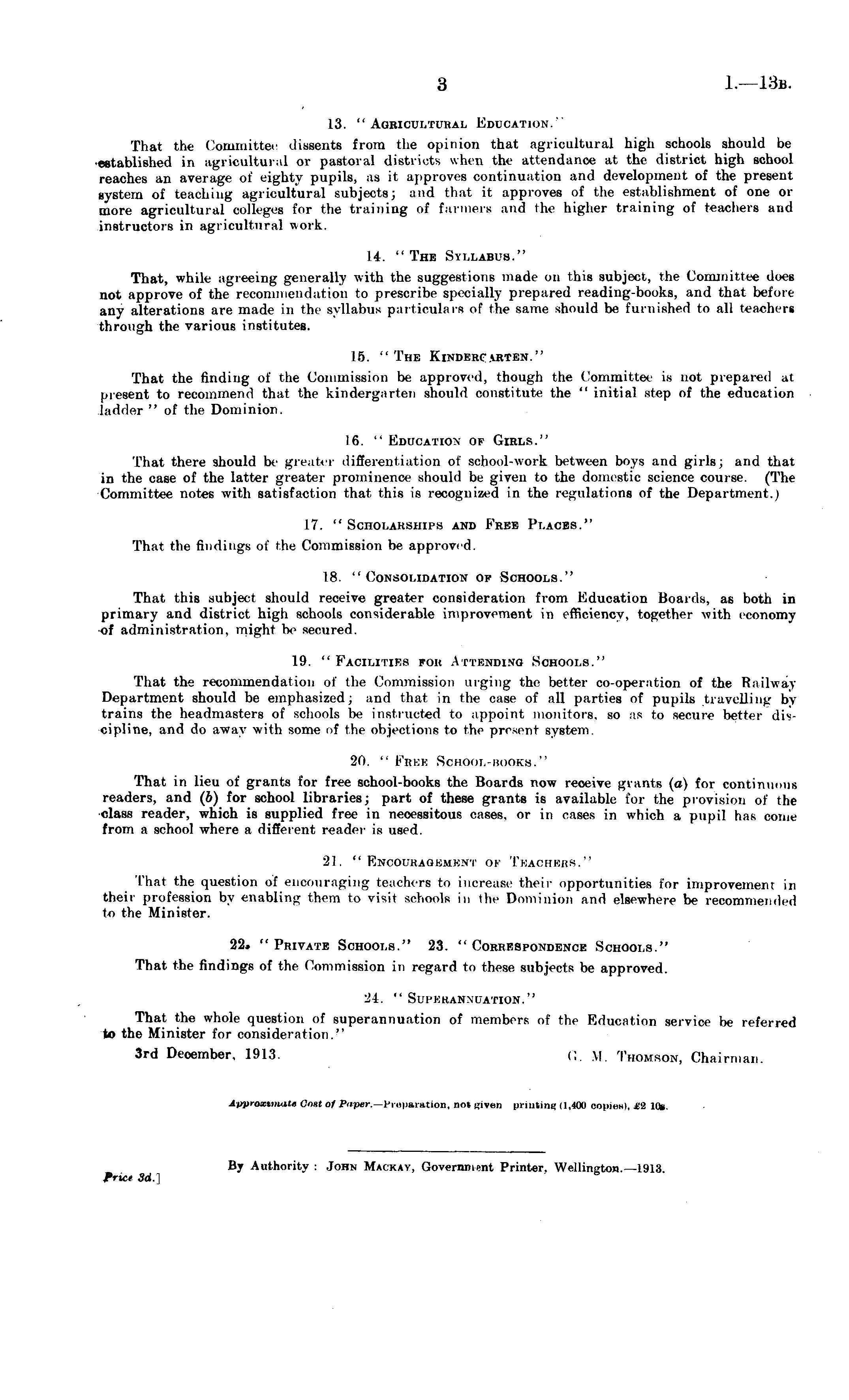 13. "Agricultural Education. That the Committee dissents from the opinion that agricultural high schools should be ■established in agricultural or pastoral districts when the attendance at the district high school reaches an average of eighty pupils, as it approves continuation and development of the present system of teaching agricultural subjects; and that it approves of the establishment of one or more agricultural colleges for the training of farmers and the higher training of teachers and instructors in agricultural work. 14. " The Syllabus." That, while agreeing generally with the suggestions made on this subject, the Committee does not approve of the recommendation to prescribe specially prepared reading-books, and that before any alterations are made in the syllabus particulars of the same should be furnished to all teachers through the various institutes. 15. " The Kindergarten." That the finding of the Commission be approved, though the Committee is not prepared at present to recommend that the kindergarten should constitute the " initial step of the education ladder " of the Dominion. 16. " Education of Girls." That there should be greater differentiation of school-work between boys and girls; and that in the case of the latter greater prominence should be given to the domestic science course. (The Committee notes with satisfaction that this is recognized in the regulations of the Department.) 17. " Scholarships and Free Places." That the findings of the Commission be approved. 18. "Consolidation of Schools." That this subject should receive greater consideration from Education Boards, as both in primary and district high schools considerable improvement in efficiency, together with economy of administration, might bo secured. 19. " Facilities for Attending Schools." That the recommendation of the Commission urging the better co-operation of the Railway Department should be emphasized; and that in the case of all parties of pupils travelling by trains the headmasters of schools be instructed to appoint monitors, so as to secure better discipline, and do away with some of the objections to the present system. 20. " Free School- books." That in lieu of grants for free school-books the Boards now receive giants (a) for continuous readers, and (6) for school libraries; part of these grants is available for the provision of the class reader, which is supplied free in necessitous oases, or in cases in which a pupil has come from a school where a different reader is used. 21. "Encouragement of Teachers." That the question of encouraging teachers to increase their opportunities for improvement in their profession by enabling them to visit schools in the Dominion and elsewhere be recommended to the Minister. 22, " Private Schools." 23. " Correspondence Schools." That the findings of the Commission in regard to these subjects be approved. 24. " Superannuation." That the whole question of superannuation of members of the Education service be referred to the Minister for consideration." 3rd December, 1913. <;. \|. Thomson, Chairman. Approximate Cnxt of Paper.— Preparation, not given printing (1,400 oopieB), ±"2 10b.