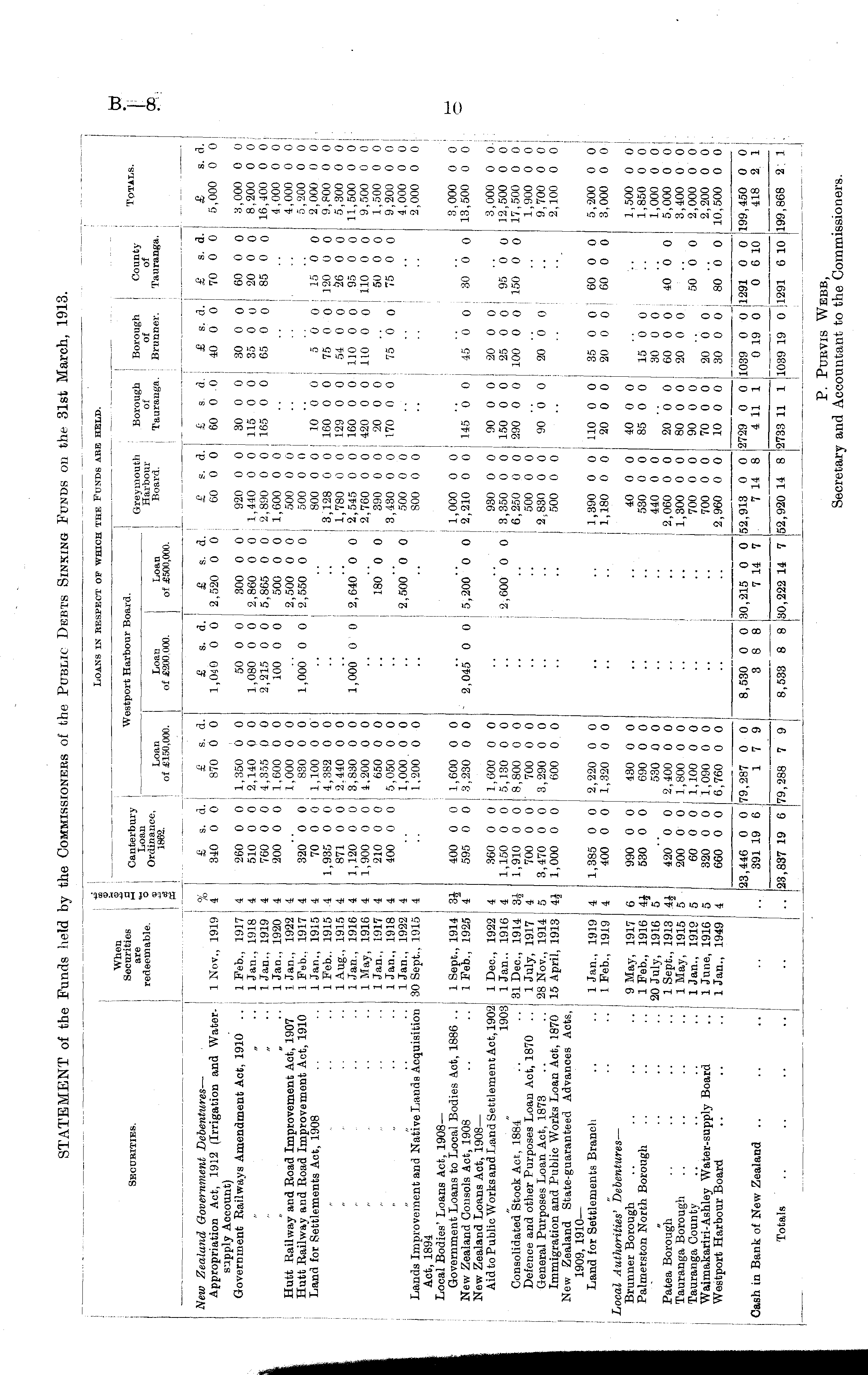 ? ? Loans in respect of which the Funds are held, a 'i:t±Ki r uku» A.n,m timuu. Securities, When Securities are i redeemable. I j 5 Canterbury "5 Loan — a, Ordinance, ; , J « j IBbi I of £150,000. Westport Harbour Board. /estj port Harbour B Loan of £200.000. Board. Loan of £500,000. i Greymouth Borough | Borough County Harbour of of of Board. Tauranga. Brunner. Tauranga. Totals. New Zealand Government Debentures — Appropriation Act, 1912 (Irrigation and Water- 1 Nov., 1919 supply Account) Government Railways Amendment Act, 1910 .. ; 1 Feb., 1917 .. 1 Jan., 1918 .. 1 Jan., 1919 .. 1 Jan., 1920 Hutt Railway and Road Improvement Act, 1907 [ 1 Jan., 1922 Hutt Railway and Road Improvement Act, 1910 ! 1 Feb.. 1917 Land for Settlements Act, 1908 .. ..! 1 Jan., 1915 .. ! 1 Feb.. 1915 .. 1 Aug., 1915 .. 1 Jan., 1916 .. 1 May, 1916 .... 1 Jan., 1917 ..1 Jan., 1918 Uan., 1922 Lands Improvement and Native Lands Acquisition 30 Sept., 1915 Act, 1894 Local Bodies' Loans Act, 1908 — Government Loans to Local Bodies Act, 1886 .. i 1 Sept., 1914 New Zealand Consols Act, 1908 .. .. I 1 Feb., 1925 New Zealand Loans Act, 1908— AidtoPublicWorksandLandSettlementAct,1902 1 Dec, 1922 19031 1 Jan.. 1916 Consolidated Stock Act, 1884 .. .. j 31 Dec, 1914 Defence and other Purposes Loan Act, 1870 .. I 1 July, 1917 General Purposes Loan Act, 1873 .. .. ! 28 Nov., 1914 Immigration and Public Works Loan Act, 1870 I 15 April, 1913 New Zealand State-guaranteed Advanoes Acts, j 1909, 1910— Land for Settlements Branch .. ..I 1 Jan., 1919 .. I 1 Feb., 1919 Local Authorities , Debentures — Brunner Borough .. .. .. .. , 9 May, 1917 Palmerston North Borough .. .. .. 1 Feb., 1916 .. 20 July, 1916 Patea Borough .. .. .. .. | 1 Sept., 1913 Tauranga Borough .. .. .. .. 1 May, 1915 Tauranga County .. .. .. .. 1 Jan., 1919 Waimakariri-Ashley Water-supply Board .. 1 June, 1916 | Westport Harbour Board .. .. .. 1 Jan., 1949 o/ /o 4 4 4 4 4 4 4 4 4 4 4 4 4 4 4 4 £ s. d. 340 0 0 260 0 0 510 0 0 760 0 0 200 0 0 320 0 0 70 0 0 1,935 0 0 871 0 0 1,120 0 0 1,900 0 0 210 0 0 400 0 0 400 0 0 595 0 0 £ s. d. 870 0 0 1,350 0 0 2,140 0 0 4,355 0 0 1,600 0 0 1,000 0 0 830 0 0 1,100 0 0 4,382 0 0 2.440 0 0 3,830 0 0 4,200 0 0 650 0 0 i 5,050 0 0 ! 1,000 0 0 1,200 0 0 1,600 0 0 3 ,230 0 0 £ s. d. £ s. d. £ s. d. S. s. d. & s. d. £ s. d. 1,040 0 0 2,520 0 0 60 0 0 60 0 -0 40 0 0 70 0 0 50 0 0 300 0 0 920 0 0 J 30 0 0 ! 30 0 0 ! 60 0 0 1,080 0 0 2,860 0 0 1,440 0 0 115 0 0 35 0 0 20 0 0 2,215 0 0 5,865 0 0 2,890 0 0 I 165 0 0 ' 65 0 0 85 0 0 100 0 0 500 0 0 1,600 0 0 2,500 0 0 ' 500 0 0 1,000 0 0 2,550 0 0 j 500 0 0 800 0 0 j 10 0 0 5 0 0 15 0 0 3,128 0 0 ' 160 0 0 75 0 0 ! 120 0 0 .. 1,780 0 0 129 0 0 54 0 0 26 0 0 1,000 0 0 2,640 0 0 2,545 0 0 ! 160 0 0 110 0 0 95 0 0 .. 2,760 0 0 j 420 0 0 ] 110 0 0 110 0 0 180 0 0 390 0 0 : 20 0 0 ; .. 50 0 0 ..I 3,430 0 0 170 0 0 75 0 0 75 0 0 2,500 0 0 : 500 0 0 800 0 0 1,000 0 0 ■ 2,045 0 0 j 5,200 0 0 2,210 0 0 ! 145 0 0 ; 45 0 0 30 0 0 930 0 0 90 0 0 20 0 0 I 2,600 0 0 3,350 0 0 j 150 0 0 25 0 0 95 0 0 6,250 0 0 J 290 0 0 100 0 0 150 0 0 500 0 0 2,830 0090O02OOOI 500 0 0 £ s. a. 5,000 0 0 3,000 0 0 i ! 8,200 0 0 I 16,400 0 0 4,000 0 0 4,000 0 Oi 5,200 0 0 2,000 0 0 9,P00 0 0 5,300 0 0 i 11,500 0 0 9,500 0 0 I 1,500 0 0 9,200 0 0 4,000 0 0 ! 2,000 0 0 3,000 0 0 13,500 0 0 4 4 5 360 0 0 1,150 0 0 1,910 0 0 700 0 0 3,470 0 0 1,000 0 0 ! 1,600 0 0 I 5,130 0 0 8,800 0 0 700 0 0 3,290 0 0 600 0 0 3,000 o o. ; 12,500 0 0 17,500 0 0 1,900 0 0 9,700 0 0 2,100 0 0 4 4 1,385 0 0 400 0 0 2,220 0 0 1,320 0 0 : 1,390 0 0 110 0 0 ! 35 0 0 60 0 0 1,180 0 0 20 0 0 I 20 0 0 60 0 0 5,200 0 0 3,000 0 0 6 5 5 5 5 4 990 0 0 530 0 0 430 0 0 690 0 0 530 0 0 2,400 0 0 1,800 0 0 1,100 0 0 1,090 0 0 j 6,760 0 0 ! 40 0 0 40 0 0 : ! 530 0 0 85 0 0 ! 15 0 0 440 0 0 .. 30 0 0 .. 2,060 0 0 20 0 0 60 0 0 40 0 0 ..I 1,300 0 0 80 0 0 j 20 0 0 ; 700 0 0 90 0 0 ! .. 50 0 0 700 0 0 70 0 0 ; 20 0 0 ■ 2,960 0 0 10 0 0 30 0 0 80 0 0 i [_J . ! 8,530 0 0 30,215 0 0 52,913 0 0 2729 0 0 1039 0 0 ! 1291 0 0 388 7 14 7 7 14 8 4 111 0 19 0i06 10 1,500 0 0 ' 1,850 0 oi 1,000 0 0 5,000 0 0! 3,400 0 0 i 2,000 0 0 ! 2,200 0 0 10,500 0 0 420 0 0 200 0 0 60 0 0 320 0 0 660 0 0 j . i 23,446 0 0 391 19 6 79,287 0 0 17 9 8,530 0 0 3 8 8 1039 0 0 1291 0 0 0 19 0 0 6 10 1039 19 0 1291 6 10 199,450 0 0 418 2 1 Cash in Bank of New Zealand .. • 23,837 19 6 79,288 7 9 { 8,533 8 8 . : 8,533 8 8 30,222 14 7 52,920 14 8 2733 11 1 1039 19 0 1291 6 10 199,868 2 1 , Totals .. I i . ; L