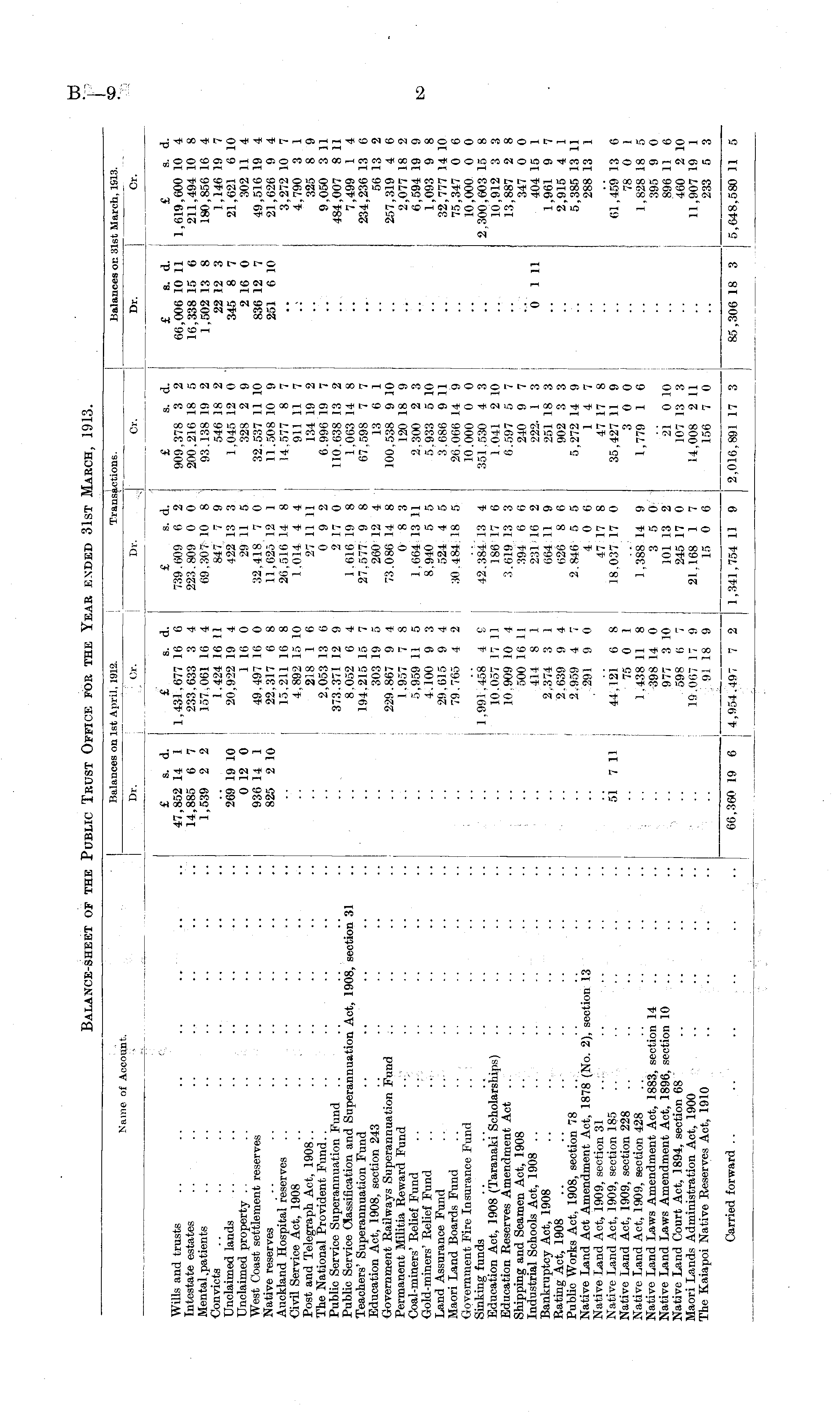 Balances on 1st April, 1912. Transactions. Balances on 31st March, 1913. Dr. Cr. Name of Account. Dr. Or. Dr. Cr. Dr. -M Wills and trusts .. .. .. .. Intestate estates Mental .patients Convicts Unclaimed lands Unclaimed property .. .. .... West Coast settlement reserves Native reserves Auckland Hospital reserves Civil Service Act, 1908 .. ..... Post and Telegraph Act, 1908.. The National Provident Fund.. .. ....... Public Service Superannuation Fund .. .. Public Service Classification and Superannuation Act, 1908, section 31 Teachers' Superannuation Fund Education Act, 1908, section 243 Government Railways Superannuation Fund :. Permanent Militia Reward Fund Coal-miners' Relief Fund Gold-miners' Relief Fund .. .'..' Land Assurance Fund .. ... Maori Land Boards Fund Government Fire Insurance Fund . . : .. Sinking funds Education Act, 1908 (Taranaki Scholarships) Education Reserves Amendment Act ..'" Shipping and Seamen Act, 1908 Industrial Schools Act, 1908 .. .. .. Bankruptcy Act, 1908 Rating Act, 1908 Public Works Act, 1908, section 78 Native Land Act Amendment Act, 1878 (No. 2), section 13 Native Land Act, 1909, section 31 ..;: .. Native Land Act, 1909, section 185 .. . . Native Land Act, 1909, section 228 Native Land Act, 1909, section 428 Native Land Laws Amendment Act, 1883, section 14 Native Land Laws Amendment Act, 1896, section 10 Native Land Court Act, 1894, section 68 " Maori Lands Administration Act, 1900 The Kaiapoi Native Reserves Act, 1910 .. .. £ s. d. 47,852 14 1 14,885 6 7 1,539 2 2 269 19 10 0 12 0 936 14 1 825 2 10 £ s. d. 1,431.677 16 6 233.633 3 4 157,061 16 4 1.424 16 11 20,922 19 4 1 16 0 49.497 16 0 22,317 6 8 15.211 16 8 4.892 15 10 218 1 6 2,053 13 6 373,371 12 9 8.052 6 4 194,215 15 7 303 19 5 229.867 9 4 1.957 7 8 5.959 11 5 4.100 9 3 29,615 9 4 79.765 4 2 £ s. d. 739.609 6 2 223.809 0 0 69.307 10 8 847 7 9 422 13 3 29 11 5 ! 32.418 7 0 11,625 12 1 26,516 14 8 1.014 4 4 27 11 11 0 9 2 2 17 0 1.616 19 8 27,577 9 8 260 12 4 73.086 14 8 0 8 3 1.664 13 11 8.940 5 5 524 4 5 30.484 18 5 £ s. d. 909,378 3 2 200,216 18 5 93.138 19 2 546 18 2 1,045 12 0 328 2 9 32.537 11 10 11.508 10 9 14,577 8 7 911 11 7 134 19 2 6.996 19 7 110.638 13 2 1.063 14 8 67,598 7 7 13 6 1 100.538 9 10 120 18 9 2.300 2 3 5.933 5 10 3.686 9 11 26.066 14 9 10.000 0 0 351,530 4 3 1.041 2 10 6.597 5 7 240 9 7 222. 1 3 251 18 3 902 3 3 5,272 14 9 1 4 7 47 17 8 35,427 11 9 3 0 0 1,779 1 6 £ s. d. 66,006 10 11 16,338 15 6 1,502 13 8 22 12 3 345 8 7 2 16 0 836 12 7 251 6 10 6 1 11 £ s. d. 1,619,600 10 4 211,494 10 8 180,856 16 4 1,146 19 7 21,621 6 10 302 11 4 49,516 19 4 21,626 9 4 3,272 10 7 4,790 3 1 325 8 9 9,050 3 11 484,007 8 11 7,499 1 4 234,236 13 6 56 13 2 257,319 4 6 2,077 18 2 6,594 19 9 1,093 9 8 32,777 14 10 75,347 0 6 10,000 0 0 2,300,603 15 8 10,912 3 3 13,887 2 8 347 0 0 404 15 1 1,961 9 7 2,915 4 1 5,385 13 11 288 13 1 1.991.458 4 £ 10.057 17 11 10.909 10 4 500 16 11 414 8 1 2,374 3 1 2.639 9 4 2,959 4 7 291 9 0 42,384.13 4 186 17 6 3.619 13 3 394 6 6 231 16 2 664 11 9 626 8 6 2.846 5 5 4 0 6 47 17 8 18.037 17 0 si 7 11 44.121 6 8 75 0 1 1.438 11 8 398 14 0 977 3 10 598 6 7 19.067 17 9 91 18 9 1,388 14 9 I 3 5 0 101 13 2 245 17 0 21,168 1 7 15 0 6 21 0 10 107 13 3 14,008 2 11 156 7 0 I 61,459 13 6 78 0 1 1,828 18 5 395 9 0 896 11 6 460 2 10 11,907 19 1 233 5 3 Carried forward .. .. .. 66,360 19 6 4,954.497 7 2 1,341,754 11 9 2,016,891 17 3 85,306 18 3 5,648,580 11 5