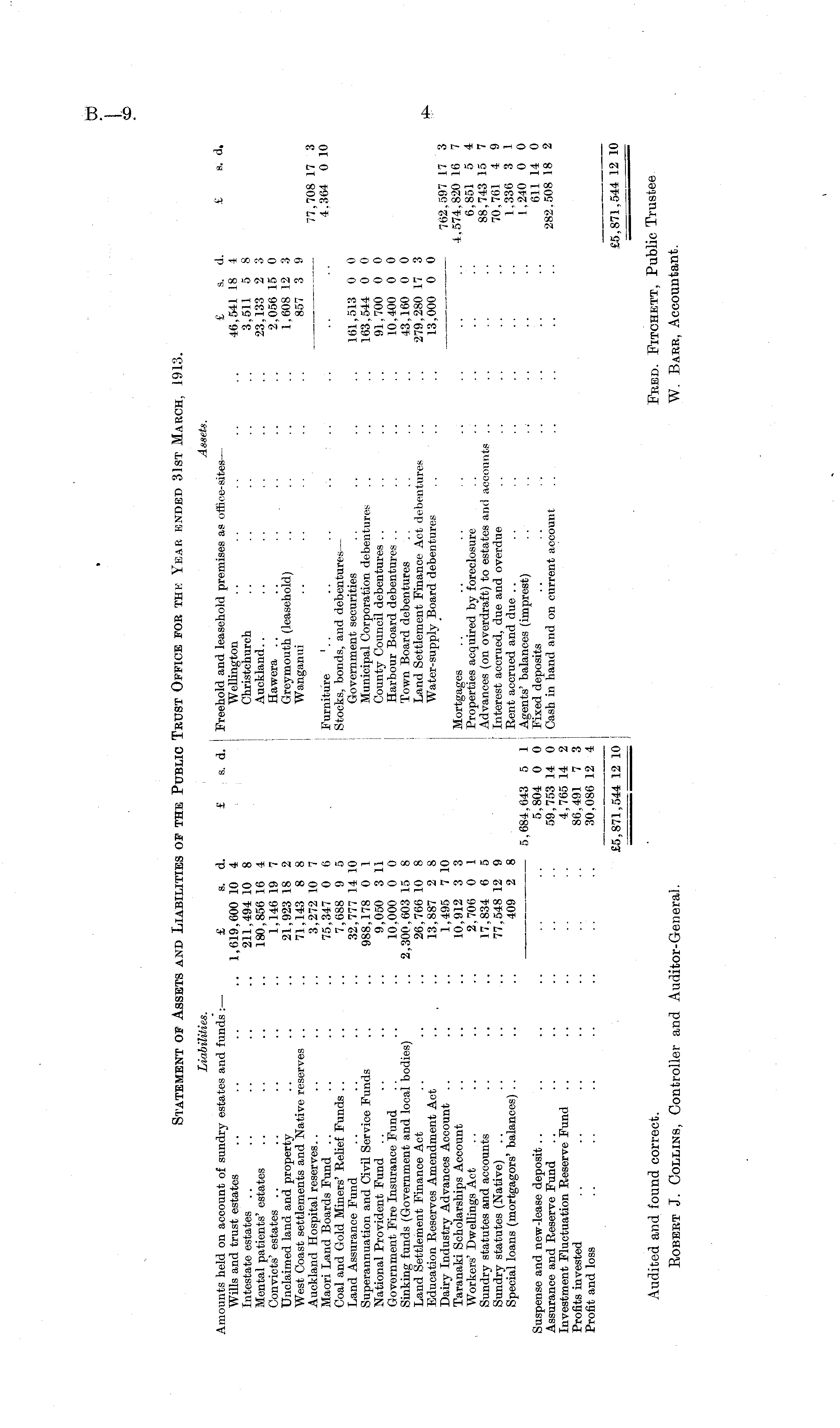 Statement of Assets and Liabilities of the Public Trust Office for the Year ended 31st March, 1913. Liabilities. Assets. Amounts held on account of sundry estates and funds:— £ s. d. £ s. d. Freehold and leasehold premises as office-sites— £ s. d. £ s. d. Wills and trust estates .. .. .. .. 1,619,600 10 4 , Wellington .. .. .. .. .. 46,541 18 4 Intestate estates .. .. .. .. .. 211,494 10 8 Christchurch .. .. .. .. .. 3,511 5 8 Mental patients'estates .. .. .. .. 180,856 16 4 Auckland.. .. .. .. .. .. 23,133 2 3 Convicts' estates .. .. .. .. .. 1,146 19 7 Hawera .. .. ..... .. .. 2,056 15 0 Unclaimed land and property .. .. .. 21,923 18 2 Greymouth (leasehold) .. .. .. .. 1,608 12 3 West Coast settlements and Native reserves .. .. 71,143 8 8 Wanganui .. .. .. .. .. 857 3 9 Auckland Hospital reserves.. .. .. .. 3,272 10 7 77,708 17 3 Maori Land Boards Fund .. .. .. .. 75,347 0 6 Furniture '.. .. .. .. : ..- .. .. .. 4.364 010 Coal and Gold Miners' Relief Funds .. .. .. 7,688 9 5 Stocks, bonds, and debentures— Land Assurance Fund .. .. .. .. 32,777 14 10 Government securities .. .. .. .. 161,513 0 0 Superannuation and Civil Service Funds .. .. 988,178 0 1 Municipal Corporation debentures .. .. .. 163,544 0 0 National Provident Fund .. .. .. .. 9,050 311 County Council debentures .. .. .. .. 91,700 0 0 Government Fire Insurance Fund .. .. .. 10,000 0 0 Harbour Board debentures .. .. .. .. 10,400 0 0 Sinking funds (Government and local bodies) .. 2,300,603 15 8 Town Board debentures .. .. .. .. 43,160 0 0 Land Settlement Finance Act .. .. .. 26,766 10 8 Land Settlement Finance Act debentures .. .. 279,280 17 3 Education Reserves Amendment Act .. ~. 13,887 2 8 Water-supply Board debentures .. .. .. 13,000 0 0 Dairy Industry Advances Account .. .. .. 1,495 710 762,597 17 3 Taranaki Scholarships Account .. .. .. 10,912 3 3 Mortgages .. .. .. .. .. .. .. 4,574,820 16 7 Workers' Dwellings Act .. .. .. .. 2,706 0 1 Properties acquired by foreclosure .. .. .. .. .. 6,851 5 4 Sundry statutes and accounts .. .. .. 17,834 6 5 Advances (on overdraft) to estates and accounts .. .. .. .. 88,743 15 7 Sundry statutes (Native) .. .. .. .. 77,548 12 9 ' Interest accrued, due and overdue .. .. .. .. .. 70,761 4 9 Special loans (mortgagors' balances) .. .. .. 409 2 8 Rent accrued and due .. .. .. .. .. .. .. 1,336 3 1 — 5,684,643 51 : Agents'balances (imprest) .. .. .. .. .. .. 1.240 0 0 Suspense and new -lease deposit .. .. .. .. .. .. 5,804 00 j Fixed deposits .. .. .. .. .. .. .. 611 14 0 Assurance and Reserve Fund .. .. .. .. .. . . 59,753 14 0 | Cash in hand and on current account ... . .. .. .. .. 282.508 18 2 Investment Fluctuation Reserve Fund .. .. .. .. .. 4,765 142 Profits invested .. .. .. .. .. .. .. 86,491 7 3 Profit and loss .. .. .. .. .. .. .. 30,086 12 4 £5,871,544 12 10 £5,871,544 12 10 Audited and found correct. Fred. Pitchett, Public Trustee Bobert J. Collins, Controller and Auditor-General. W. Barr, Accountant.