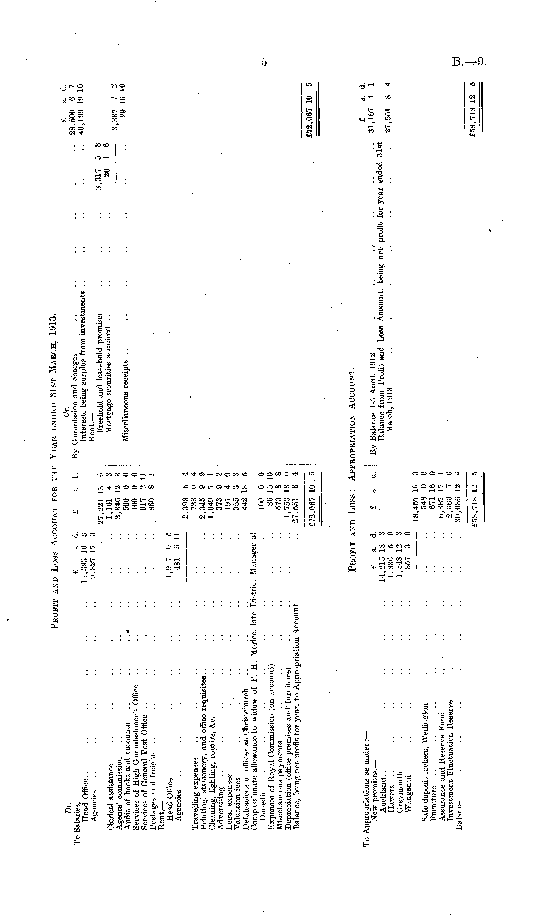 Profit and Loss Account for the Year ended 31st March, 1913. Br O. £ s - d - To Salaries— £ »• d. £ s. d. By Commission and charges .. 28,500 6 7 Head Office.. .. .. .. .. 17,393 16 3 Interest, being surplus from investments .. .. .. .. .. «u,ia» ia iv Agencies '.'. '.'. '.'. '.'. .. .. 9,827 17 3 Rent — 27,221 lo 6 Freehold and leasehold premises .. .. .. rf.dlv o S Clerical assistance 1,161 4 3 Mortgage securities acquired 20 * 6 3 337 7 2 Agents' commission .. .. .. .. .. .. •• 3,346 12 3 > „ Audit of books and accounts .. .. ... .. .. .. 500 0 0 Miscellaneous receipts ..........• • • • '" IO Services of High Commissioner's Office .. .. .. .. ■ ■ 100 0 0 Services of General Post Office .. .. .. .. . • • • 917 211 Postages and freight .. .. .. .. .. •. ... 860 8 4 Rent,— Head Office.. .. .. .. .. .. 1,917 0 3 Agencies .. .. .. .. .. .. 481 511 2,398 6 4 Travelling-expenses .. .. .. .. ■. • • • • 733 0 4 stationery, and office requisites.. .. .. .. .. 2,345 9 9 Cleaning, lighting, repairs, &c. .. .. .. .• • • • ■ 1,049 7 1 Advertising .. .. .. .. .. • • . • • • • 373 9 2 Legal expenses .. .. _.. .. ■• • • ■ ■ 197 40 j Valuation fees .. .. .. .. • ■ • ■ • • 355 33 1 Defalcations of officer at Christchurch .. .. .. . . 442 18 5 i Compassionate allowance to widow of F. H. Morice, late District Manager at Dunedin 100 0 0 Expenses of Royal Commission (on account) .. .. . . .. 86 15 10 j Miscellaneous payments .. .. .. . ■ . • • • 573 8 8 Depreciation (office premises and furniture) .. .. ■■ •• 1,753 18 0 j Balance, being net profit for year, to Appropriation Account .. .. 27,551 84; £72T067~10~.""5 : £72,067 10 5 Profit and Loss : Appropriation Account. £ s d To Appropriations as under :— „. - „_ * " New premises,— £ s. d. £ s. d. By Balance Ist April, 1912 .. .. .. .. .... 31,167 4 1 Auckland 14 215 18 3 Balance from Profit and Loss Account, being net profit for year ended 31st Hawera '.'. '. 1,836 5 0 March, 1913 27,551 8 4 Greymouth .. .. .. .. .. 1,548 12 3 Wanganui .. .. .. • ■ •. 857 3 9 18,457 19 3 Safe-deposit lockers, Wellington . . . . .. .. .. 548 0 0 Furniture .. .. .. .. .. .. .. .. 671 16 9 Assurance and Reserve Fund .. .. .. .. .. 6,887171 Investment Fluctuation Reserve .. .. .. .. .. 2, (i 66 7 0 Balance .. .. 30,086 12 4 £si/nT72~5 I £58,718 12 5