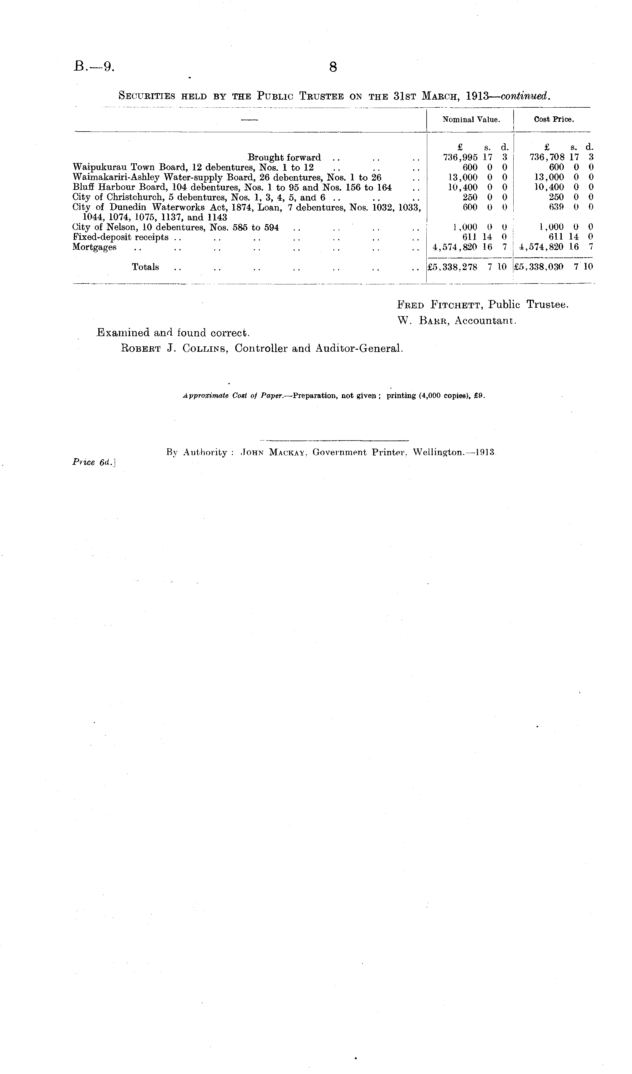 Nominal Value. Cost Price. Brought forward Waipukurau Town Board, 12 debentures, Nos. 1 to 12 Waimakariri-Ashley Water-supply Board, 26 debentures, Nos. 1 to 26 Bluff Harbour Board, 104 debentures, Nos. 1 to 95 and Nos. 156 to 164 City of Christchurch, 5 debentures, Nos. 1, 3, 4, 5, and 6 .. City of Dunedin Waterworks Act, 1874, Loan, 7 debentures, Nos. 1032, 1033. 1044, 1074, 1075, 1137, and 1143 City of Nelson, 10 debentures, Nos. 585 to 594 Fixed-deposit receipts Mortgages £ s. d. | £ s. d. 736,995 17 3 ( 736,708 17 3 600 0 0 600 0 0 13,000 0 0 I 13,000 0 0 10,400 0 0 ! 10,400 0 0 250 0 0 i 250 0 0 600 0 0 639 0 0 1,000 0 0 1,000 0 0 611 14 0 611 14 0 4,574,820 16 7 4,574,820 16 7 Totals £5,338.278 7 10 |£5,338,030 7 10