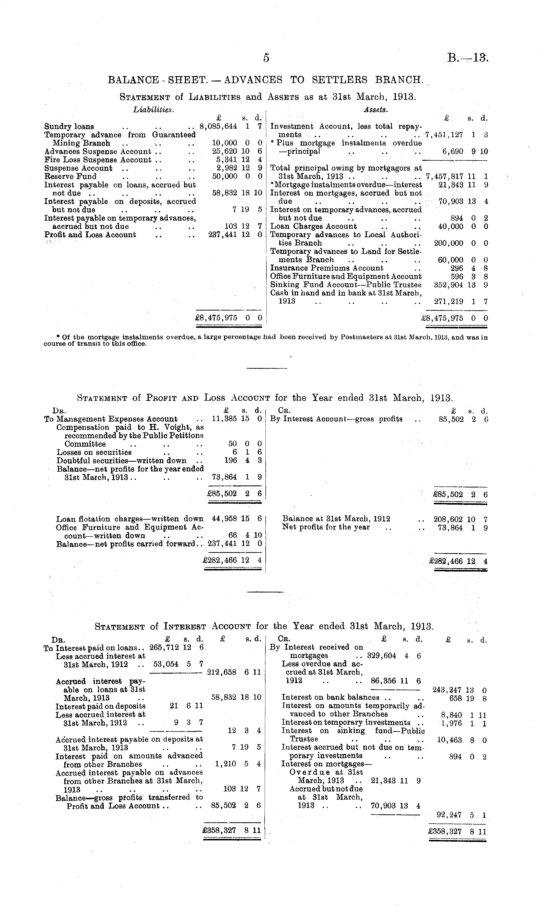 BALANCE-SHEET.— ADVANCES TO SETTLEES BBANCH. Statement of Liabilities and Assets as at 31st March, 1913. Liabilities. ■ Assets. £ ] '-.a. d. £ s. d. Sundry loans .. .. .. 8,085,644 1 7 | Investment Account, less total repayTemporary advance from Guaranteed ments .. .. .. .. 7,451,127 1 3 Mining Branch .. ... .. 10,000 0 0 * Plus mortgage instalments overdue Advances Suspense Account .. .. 25,620 10 6 —principal .. .. .. 6,690 9 10 Pire Loss Suspense Account .. .. 5,341 12 4 Suspense Account .. .. .. 2,982 12 9 Total principal owing by mortgagors at BeserveFund .. .. .. 50,000 0 0 31st March, 1913 .. .. ..7,457,817 11 1 Interest payable on loans, accrued but j 'Mortgage instalments overdue —interest 21,343 11 9 not due .. .. .. .. 58,832 18 10 i Interest on mortgages, accrued but not Interest payable on deposits, accrued due .. .. .. .. 70,903 13 4 but not due .. .. .. 7 19 5 Interest on temporary advances, accrued Interest payable on temporary advances, but not due .. .. .. 894 0 2 acorued but not due .. .. 103 12 7 j Loan Charges Account .. .. 40,000 0 0 Profit and Loss Account .. .. 237,441 12 0 Temporary advances to Local Authorities Branoh .. .. .. 200,000 0 0 Temporary advances to Land for Settlements Branch .. .. .. 60,000 0 0 Insurance Premiums Account .. 296 4 8 Office Furniture and Equipment Account 596 3 8 , ; Sinking Fund Acoount—Public Trustee 352,904 13 9 j Cash in hand and in bank at 31st Maroh, 1913 .. .. .. .. 271,219 1 7 £8,475,975 0 0 ! £8,475,975 0 0 • Oi the mortgage instalments overdue, a large percentage had been received by Postmasters at Blst Maroh, 1913, and was in course of transit to this office.