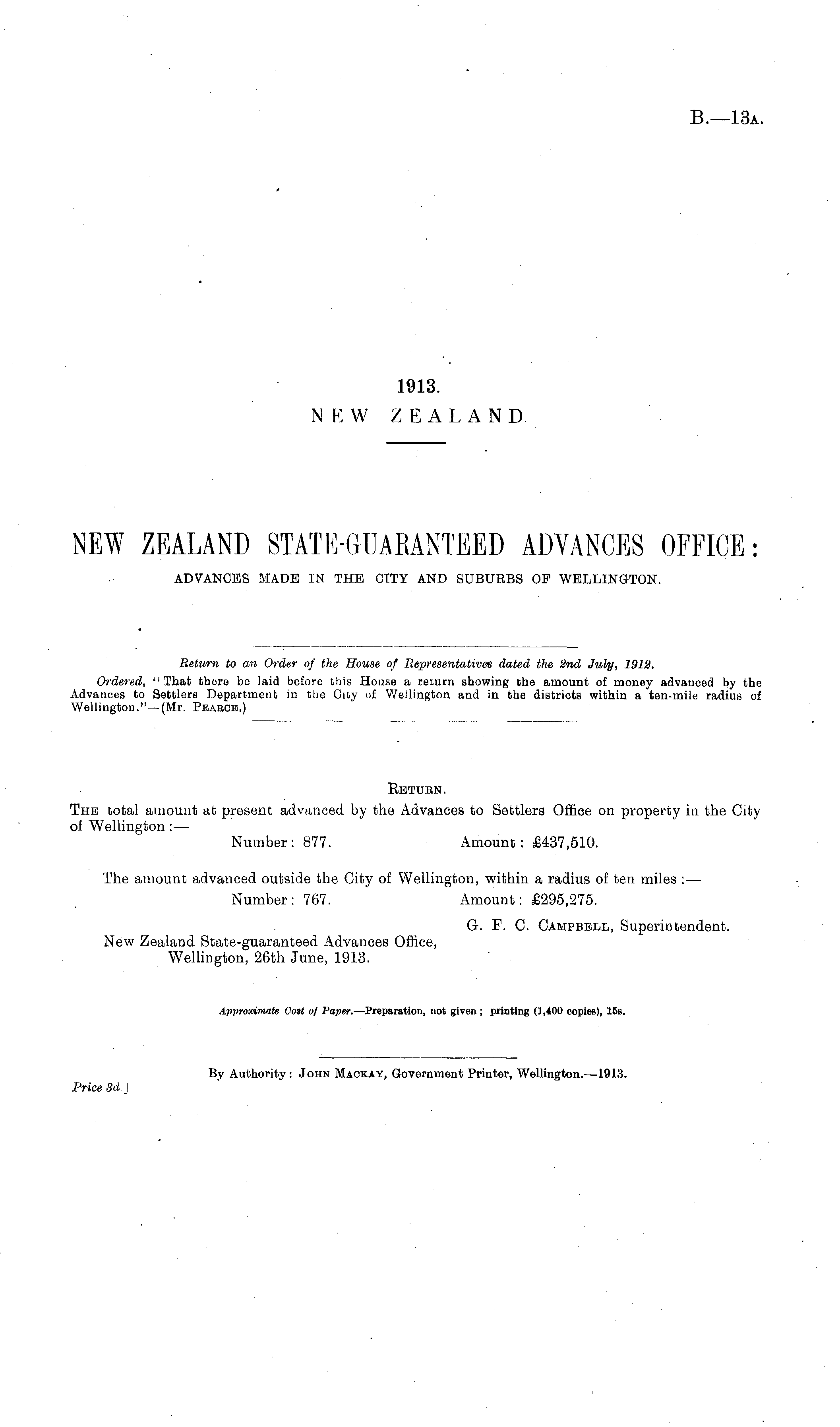Return. The total amount at present advanced by the Advances to Settlers Office on property in the City of Wellington : — Number: 877. Amount: £437,510. The amount advanced outside the City of Wellington, within a radius of ten miles :— Number: 767. Amount: £295,275. G. F. C. Campbell, Superintendent. New Zealand State-guaranteed Advances Office, Wellington, 26th June, 1913. Approximate Cost of Paper. —Preparation, not given; printing (1,400 copies), 15b.