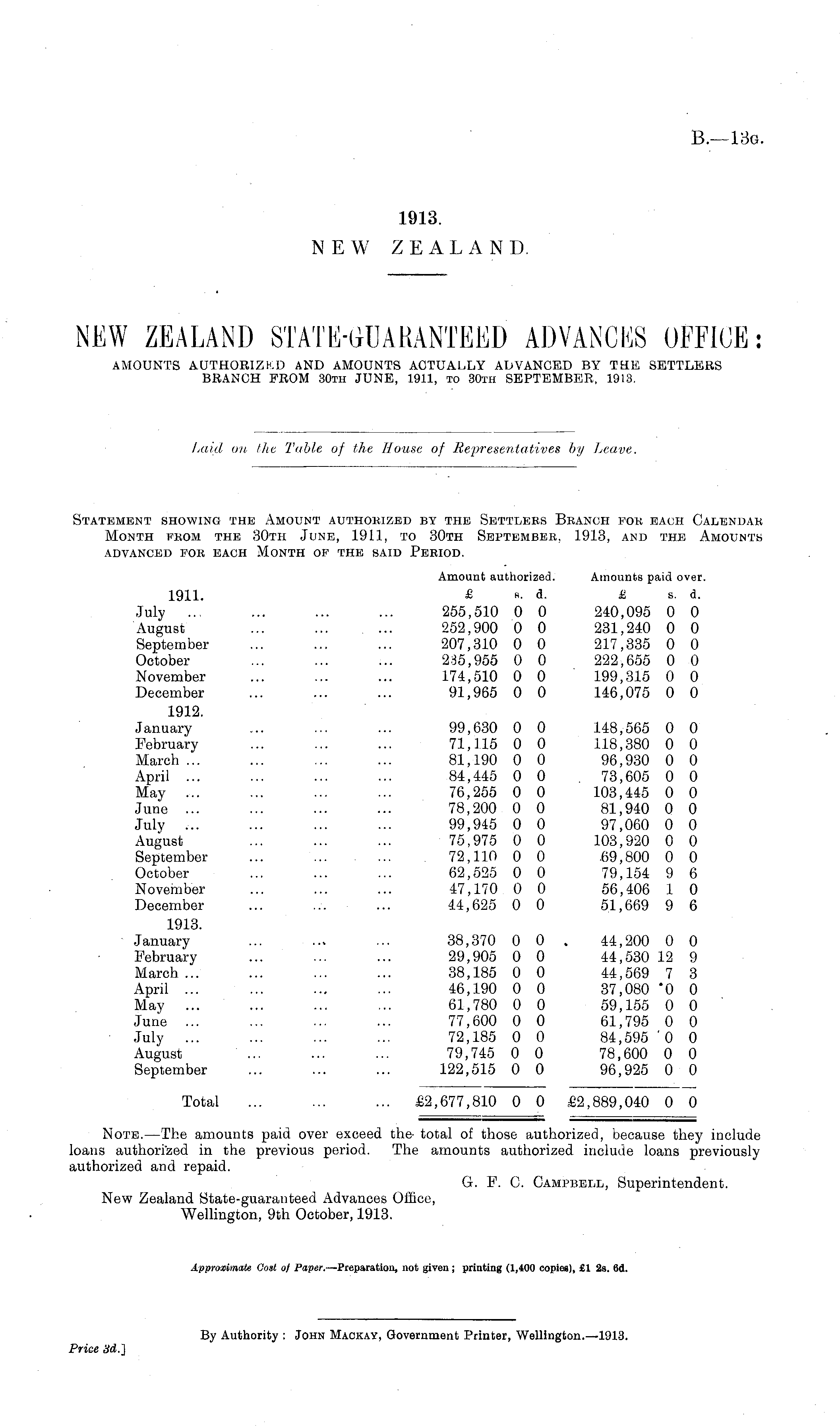 NEW ZEALAND STATE-GUARANTEED ADVANCES OFFICE: AMOUNTS AUTHORIZED AND AMOUNTS ACTUALLY ADVANCED BY THE SETTLERS BRANCH FROM 30th JUNE, 1911, to 30th SEPTEMBER, 1913.