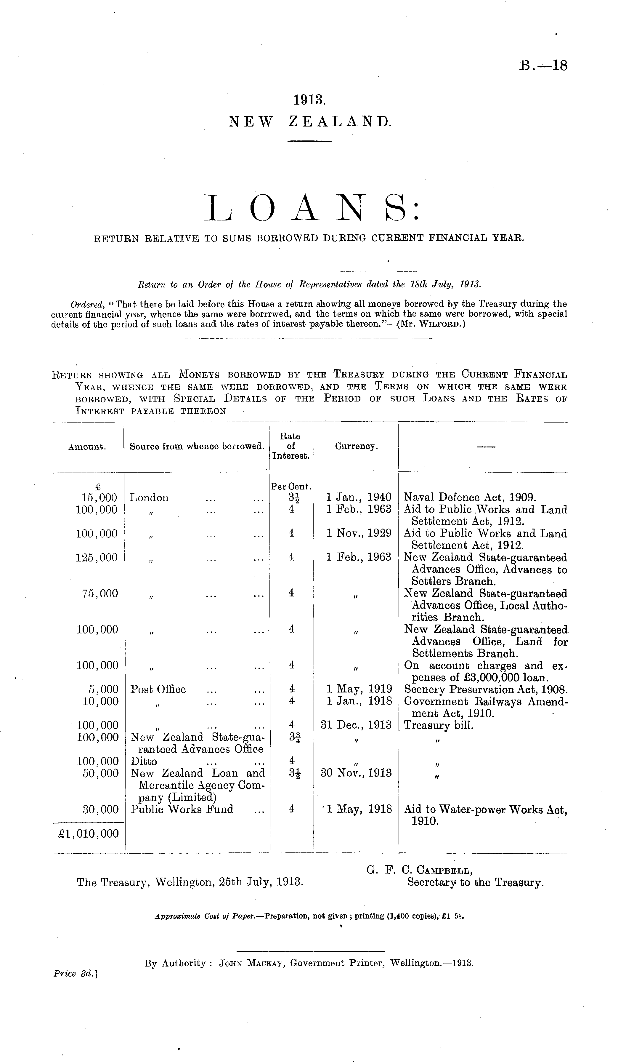 G. F. C. Campbell, The Treasury, Wellington, 25th July, 1913. Secretary to the Treasury. Approximate Cost of Paper. —Preparation, not given ; printing (1,400 copies), £1 ss.