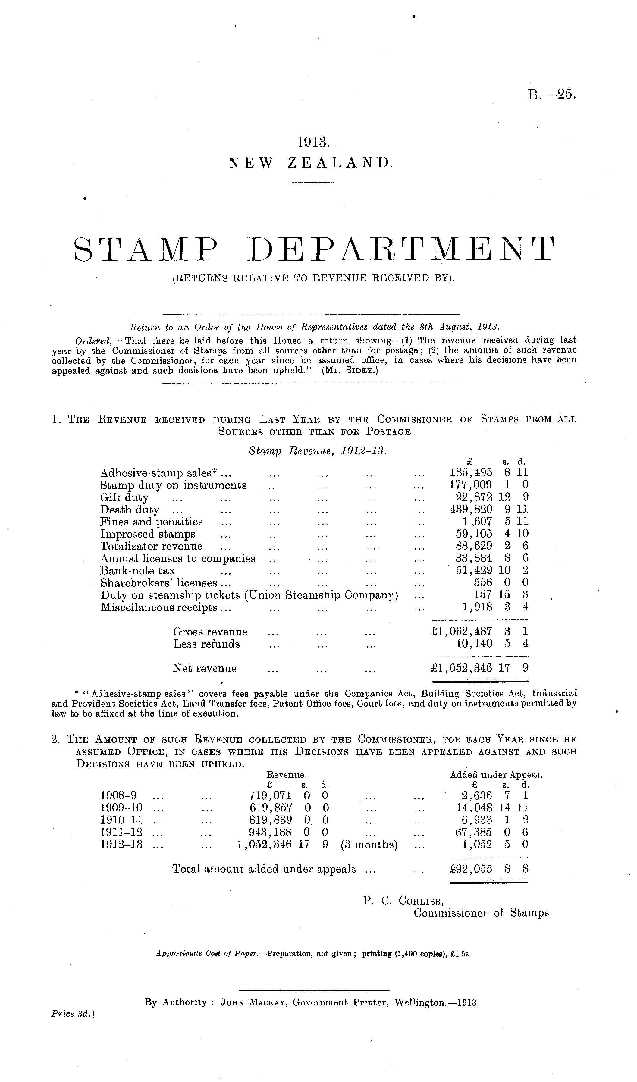 1. The Revenue received during Last Year by the Commissioner of Stamps from all Sources othee than foe Postage. Stamp Bevenue, 1912-13. £ s. d. Adhesive-stamp sales* ... ... ... ... ... 185,495 8 11 Stamp duty on instruments .. ... ... ... 177,009 1 0 Gift duty ... ... ... ... ... ... 22,872 12 9 Death duty ... ... ... ... ... ... 439,820 9 11 Pines and penalties ... ... ... ... ... 1,607 511 Impressed stamps ... ... ... ... ... 59,105 4 10 Totalizator revenue ... ... ... ... ... 88,629 2 6 Annual licenses to companies ... ... ... ... 33,884 8 6 Bank-note tax ... ... ... ... ... 51,429 10 2 Sharebrokers'licenses... ... ... ... ... 558 0 0 Duty on steamship tickets (Union Steamship Company) ... 157 15 3 Miscellaneous receipts... ... ... ... ... 1,918 3 4 Gross revenue ... ... ... £1,062,487 3 1 Less refunds ... ... ... 10,140 5 4 Net revenue ... ... ... £1,052,346 17 9 * " Adhesive-stamp sales " covers fees payable under the Companies Act, Building Societies Act, Industrial and Provident Societies Act, Land Transfer fees, Patent Office fees, Court fees, and duty on instruments permitted by law to be affixed at the time of exeoution. 2. The Amount of such Revenue collected by the Commissioner, for each Yeae since he assumed Office, in cases where his Decisions have been appealed against and such Decisions have been upheld. Revenue. Added under Appeal. & ' s. d. £ s. d. 1908-9 ... ... 719,071 0 0 ... ... ' 2,636 7 1 1909-10 ... ... 619,857 0 0 ... ... 14,048 14 11 1910-11 ... ... 819,839 0 0 ... ... 6,933 1 2 1911-12 ... ... 943,188 0 0 ... ... 67,385 0 6 1912-13 ... ... 1,052,346 17 9 (3 months) ... 1,052 5 0 Total amount added under appeals ... ... £92,055 8 8 P. C. Corliss, Commissioner of Stamps. Approximate (lost of Paper. —Preparation, not given; printing (1,400 copies), £1 6s.
