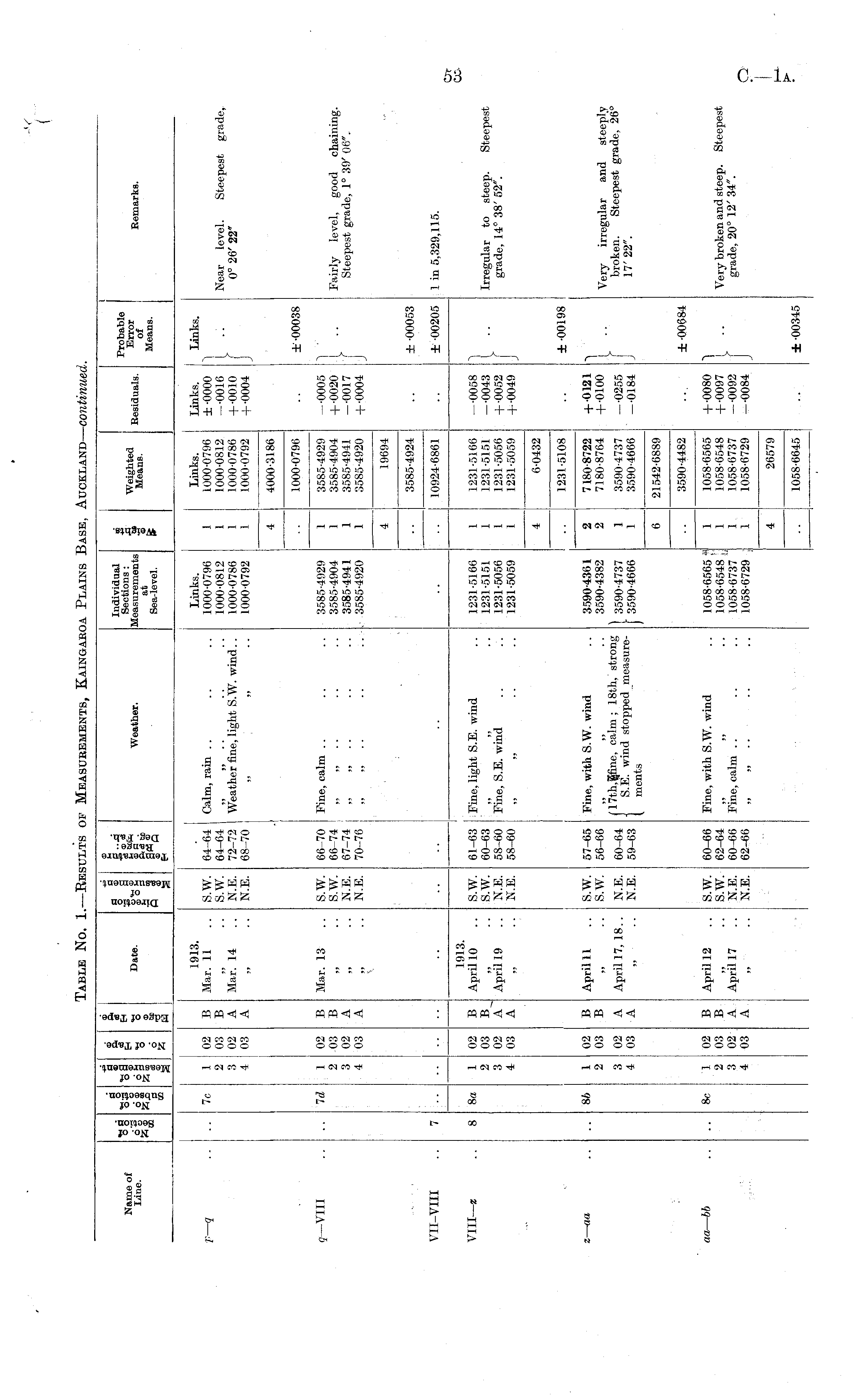 Table No. 1.—Results of Measurements, Kaingaroa Plains Base, Auckland— continued.