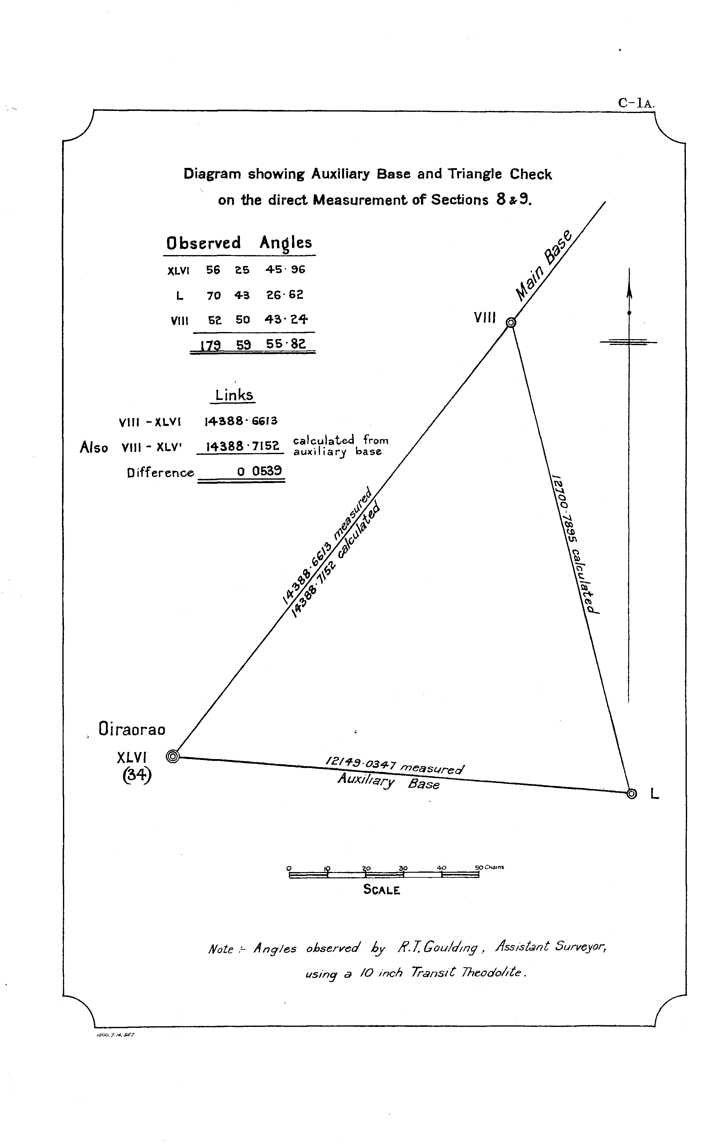 Diagram showing Auxiliary Base and Triangle Check on the direct Measurement of Sections 8 & 9.
