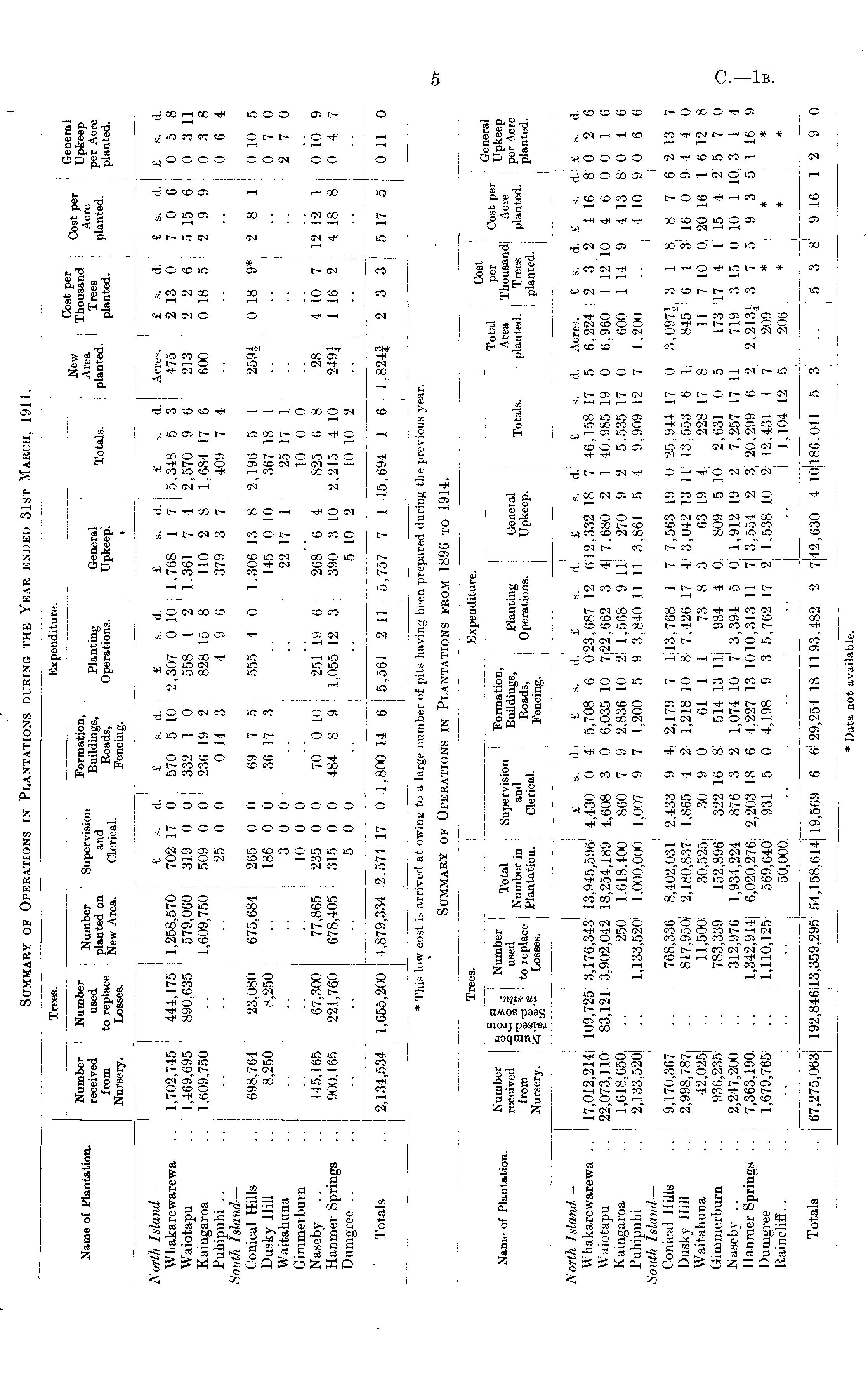 Trees. Expenditure. Trees. : : jt Cost per I f. . Genera 1 Name of Plantation. Numbe , r Nun * er I Number Supervision F °™ a . tion > _ .. J_ 1 Are! Thousand r Upkeep received used lanted on Buildings, Planting General ToUls p l ante d. , Tre f es , planted. Pf f °™ from to replace jj , PI " 1 Koads, Operations. Upkeep. r planted. r planted. Nursery. Losses. j ' Fencing. __ _j_ North Island — £ s. d. £ s. d. £ s. d.. £ s. d. £ s. d. Acres. £ s. d. £ s. d. £ s. d. Whakarewarewa .. 1,702,745 444,175 1,258,570 702 17 0 570 5 10 2,307 0 10 ; 1,768 1 7 5.348 53 475 2 13 0 706 058 Waiotapu .. 1,469,695 890,635 579,060 319 0 0 332 10 558 1 2 j 1,361 7 4 2,570 9 6 213 2 2 6 5 15 6 0 3 11 Kaingaroa .. 1,609,750 .. 1,609,750 509 0 0 236 19 2 828 15 8 i 110 2 8 1,684 17 6 600 0 18 5 2 9 9 0 3 8 Puhipuhi .. .. .. .. .. 25 0 0 0 14 3 I 4 9 6 379 3 7 409 7 4 .. .. .. 0 6 4 South Island — Conical Hills .. 698,764 23,080 675,684 265 0 0 69 7 5 555 4 0 1,306 13 8 2,196 5 1 259-| 0 18 9* 2 8 1 0 10 5 Dusky Hill .. 8,250 8,250 .. 186 0 0 36 17 3 .. 145 0 10 367 18 1 .. .. .. 0 7 0 Waitahuna .. .. .. .. 3 0 0 .. .. 22 17 1 25 17 1 ; .. .. 2 7 0 Gimmerburn .. .. .. .. 10 0 0 .. .. .. 10 0 0 Naseby .. .. 145,165 67.300 77,865 235 0 0 70 0 10 251 19 6 268 6 4 825 6 8 28 4 10 7 12 12 1 0 10 9 Hanmer Springs .. 900,165 221,760 678,405 315 0 0 484 8 9 1,055 12 3 390 3 10 2,245 4 10 249| 1 16 2 4 18 8 0 4 7 Dumgree .. .. .. .. .. 5 0 0 .. .. 5 10 2 10 10 2 Totals .. 2,134,534 1,655,200 4,879,334 2,574 17 0 1,800 14 6 j 5,561 2 11 5,757 7 1 15,694 1 6 l,824f I 2 3 3 5 17 5 0 11 0 * This low cost is arrived at owing to a large number of pits having been prepared during the previous year. Name of Plantation. Summary of Operations in Plantations from 1896 to 1914. Trees. Expenditure. „ a ; rp t i p + General w„~ „*pi„„<_~ Number £ § S . Number „ . , Q .. Formation, "V i™ per . . pCT Upkeep JName ot Plantation. . , »S;s , Total Supervision „ .,,. tm +■ i Area Thousand Acre a received -2 _ S •« use0 - at _ j Buildings, Planting General — . , , . -, — , . , per Acre t + „i„„ Number in and -da r\ *• tt i Totals. planted. : Trees planted. r , . , NuTry. l-ll-S 6 «-«•-■ <*erical. ° Peratl ° nS - Upke6P - | j ?"• Pla " ted - North Island— £ g . _ £ s. d. £ s. d. £ s. d. ; £ s. d. Acres, j £ s. d. £ s. d. £ s. d. Whakarewarewa .. 17,012,214 109,725 3,176,343 13,945,596 4,430 0 4 ; 5,708 6 0 23,687 12 612,332 18 7 46,158 17 5 ! 6,224 2 3 2 4 16 8 0 2 6 Waiotapu .. 22,073,110 83,121 3,902,042 18,254,189 4,608 3 0 ; 6,035 10 7 22,662 3 4 7,680 2 1 40,985 19 0 6,960 ] 1 12 10 4 6 0 0 16 Kaingaroa .. 1,618,650 .. 250 1,618,400 860 7 9! 2,836 10 2 1,568 9 11 270 9 2 5,535 17 Oj 600 : 1 14 9j 4 13 8 0 4 6 Puhipuhi ... 2,133,520 .. 1,133,520, 1,000,000 1,007 9 7! 1,200 5 9 3,840 11 11 3,861 5 4| 9,909 12 7 1,200 ' .. 4 10 9 0 6 6 South Island — Conical Hills .. 9,170,367 .. 768,3361 8,402,031 2,433 9 4 2,179 7 113,768 1 7 7,563 19 0 25,944 17 0 1 8: 8 7 6 2 13 7 Dusky Hill .. 2,998,787 .. 817,950! 2,180,837! 1,865 4 2 1,218 10 8 7,426 17 4 3,042 13 11 13.553 6 1 845 ! 6 4 3: 16 0 9 4 4 0 Waitahuna .. 42,025 .. 11,500 30.525 1 30 9 0. 61 1 1 73 8 3 63 19 4 228 17 8 117 10 0 ! 20 16 1 6 12 8 Gimmerburn .. 936,235 .. 783,339 152,896 322 16 8 1 514 13 11 984 4 0 809 5 10 2,631 0 5 173 17 4 1 15 4 2 5 7 0 Naseby .. .. 2,247,200 .. 312,976 1,934,224 876 3 2 1,074 10 7 3,394 5 0 1,912 19 2 7,257 17 11 719 3 15 0 1 10 110 3 1 4 Hanmer Springs .. 7,363,190 .. 1,342,914 6,020,276 2,203 18 6 4,227 13 1010,313 11 7 3,554 2 3 20,299 6 2 2,213£ 3 7 5' 9 3 5! 1 16 9 Dumgree .. 1,679,765 .. 1,110,125! 569,640i 931 5 0 4,198 9 3 5,762 17 2 1,538 10 2 12,431 1 7 209 * * * RainclifL. .. .. .. .. 50,000: .. .. .. .. 1,104 12 5 206 * * * \ I I 1 i Totals .. 67,275,063 192,846J13,359,295 54,158,614 19,569 6 6 29,254 18 1193,482 2 742,630 4 10186,041 5 3| .. 5 3 8 9 16 1 2 9 0 * Data not available.