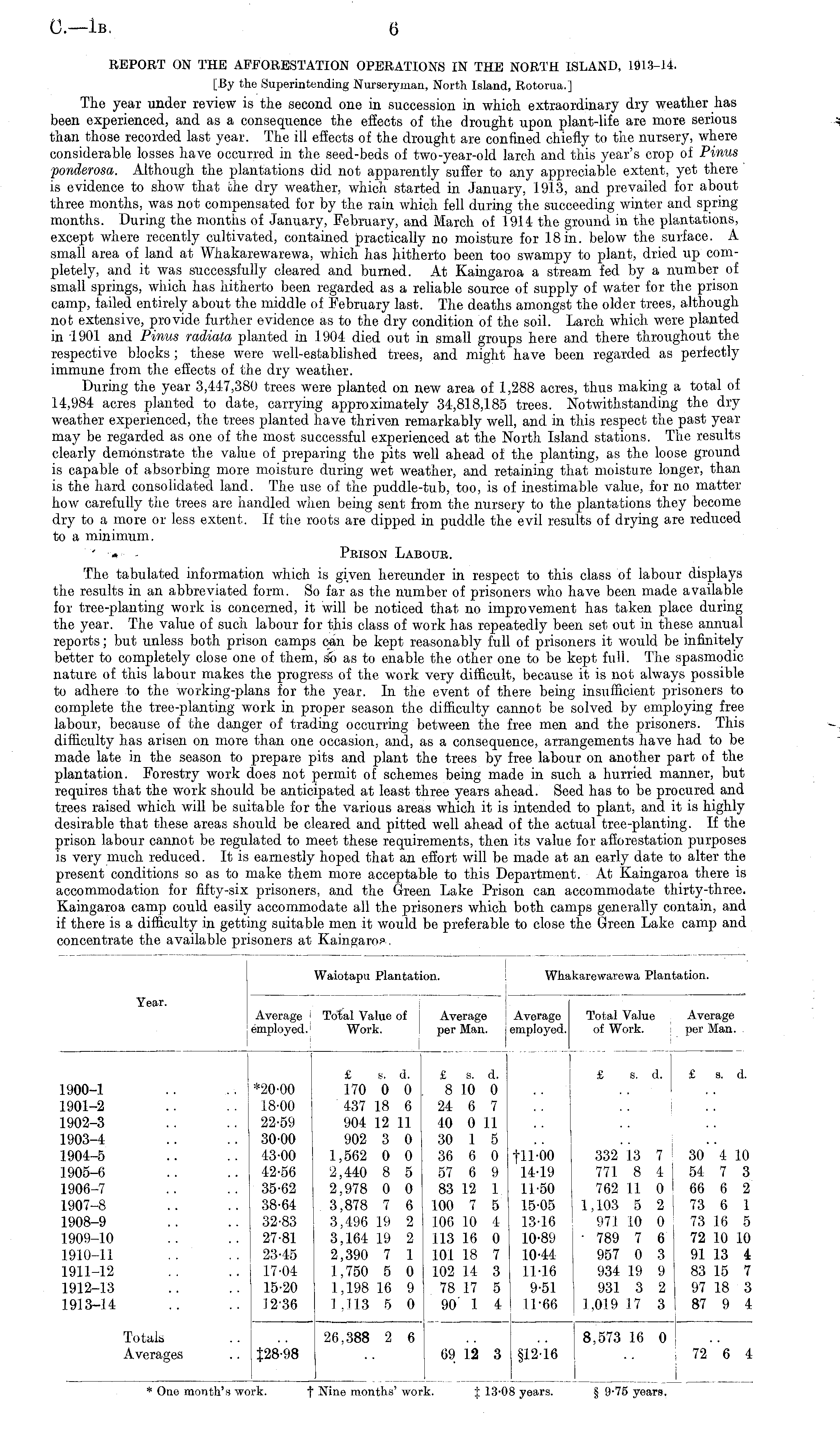 REPORT ON THE AFFORESTATION OPERATIONS IN THE NORTH ISLAND, 1913-14. [By the Superintending Nurseryman, North Island, Rotorua.] The year under review is the second one in succession in which extraordinary dry weather has been experienced, and as a consequence the effects of the drought upon plant-life are more serious than those recorded last year. The ill effects of the drought are confined chiefly to the nursery, where considerable losses have occurred in the seed-beds of two-year-old larch and this year's crop of Pinus fonderosa. Although the plantations did not apparently suffer to any appreciable extent, yet there is evidence to show that the dry weather, which started in January, 1913, and prevailed for about three months, was not compensated for by the rain which fell during the succeeding winter and spring months. During the months of January, February, and March of 1914 the ground in the plantations, except where recently cultivated, contained practically no moisture for 18 in. below the surface. A small area of land at Whakarewarewa, which has hitherto been too swampy to plant, dried up completely, and it was successfully cleared and burned. At Kaingaroa a stream fed by a number of small springs, which has hitherto been regarded as a reliable source of supply of water for the prison camp, tailed entirely about the middle of February last. The deaths amongst the older trees, although not extensive, provide further evidence as to the dry condition of the soil. Larch which were planted in 1901 and Pinus radiata planted in 1904 died out in small groups here and there throughout the respective blocks ; these were well-established trees, and might have been regarded as perfectly immune from the effects of the dry weather. During the year 3,447,380 trees were planted on new area of 1,288 acres, thus making a total of 14,984 acres planted to date, carrying approximately 34,818,185 trees. Notwithstanding the dry weather experienced, the trees planted have thriven remarkably well, and in this respect the past year may be regarded as one of the most successful experienced at the North Island stations. The results clearly demonstrate the value of preparing the pits well ahead of the planting, as the loose ground is capable of absorbing more moisture during wet weather, and retaining that moisture longer, than is the hard consolidated land. The use of the puddle-tub, too, is of inestimable value, for no matter how carefully the trees are handled when being sent from the nursery to the plantations they become dry to a more or less extent. If the roots are dipped in puddle the evil results of drying are reduced to a minimum. Prison Labour. The tabulated information which is given hereunder in respect to this class of labour displays the results in an abbreviated form. So far as the number of prisoners who have been made available for tree-planting work is concerned, it will be noticed that no improvement has taken place during the year. The value of such labour for this class of work has repeatedly been set out in these annual reports; but unless both prison camps can be kept reasonably full of prisoners it would be infinitely better to completely close one of them, so as to enable the other one to be kept full. The spasmodic nature of this labour makes the progress of the work very difficult, because it is not always possible to adhere to the working-plans for the year. In the event of there being insufficient prisoners to complete the tree-planting work in proper season the difficulty cannot be solved by employing free labour, because of the danger of trading occurring between the free men and the prisoners. This difficulty has arisen on more than one occasion, and, as a consequence, arrangements have had to be made late in the season to prepare pits and plant the trees by free labour on another part of the plantation. Forestry work does not permit of schemes being made in such a hurried manner, but requires that the work should be anticipated at least three years ahead. Seed has to be procured and trees raised which will be suitable for the various areas which it is intended to plant, and it is highly desirable that these areas should be cleared and pitted well ahead of the actual tree-planting. If the prison labour cannot be regulated to meet these requirements, then its value for afforestation purposes is very much reduced. It is earnestly hoped that an effort will be made at an early date to alter the present conditions so as to make them more acceptable to this Department. At Kaingaroa there is accommodation for fifty-six prisoners, and the Green Lake Prison can accommodate thirty-three. Kaingaroa camp could easily accommodate all the prisoners which both camps generally contain, and if there is a difficulty in getting suitable men it would be preferable to close the Green Lake camp and concentrate the available prisoners at Kaingaroa.