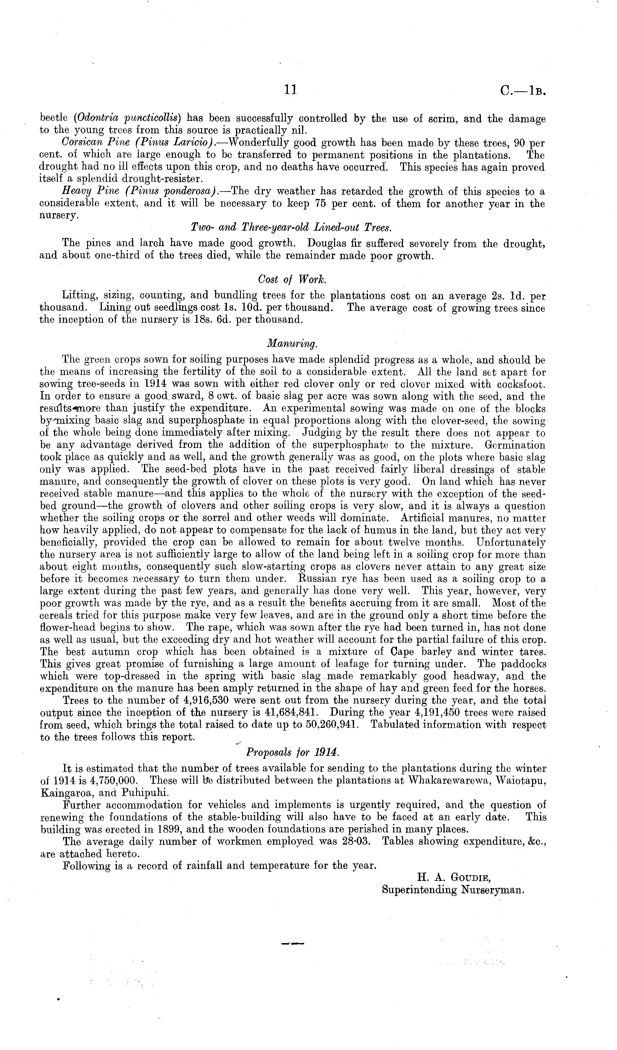 beetle (Odontria puncticollis) has been successfully controlled by the use of scrim, and the damage to the young trees from this source is practically nil. Corsican Pine (Pinus Laricio). —- Wonderfully good growth has been made by these trees, 90 per cent, of which are large enough to be transferred to permanent positions in the plantations. The drought had no ill effects upon this crop, and no deaths have occurred. This species has again proved itself a splendid drought-resister. Heavy Pine (Pinus ponderosa). —The dry weather has retarded the growth of this species to a considerable extent, and it will be necessary to keep 75 per cent, of them for another year in the nursery. Two- and Three-year-old Lined-out Trees. The pines and larch have made good growth. Douglas fir suffered severely from the drought, and about one-third of the trees died, while the remainder made poor growth. Cost of Work. Lifting, sizing, counting, and bundling trees for the plantations cost on an average 2s. Id. per thousand. Lining out seedlings cost Is. lOd. per thousand. The average cost of growing trees since the inception of the nursery is 18s. 6d. per thousand. Manuring. The green crops sown for soiling purposes have made splendid progress as a whole, and should be the means of increasing the fertility of the soil to a considerable extent. All the land set apart for sowing tree-seeds in 1914 was sown with either red clover only or red clover mixed with cocksfoot. In order to ensure a good, sward, 8 cwt. of basic slag per acre was sown along with the seed, and the results more than justify the expenditure. An experimental sowing was made on one of the blocks by mixing basic slag and superphosphate in equal proportions along with the clover-seed, the sowing of the whole being done immediately after mixing. Judging by the result there does not appear to be any advantage derived from the addition of the superphosphate to the mixture. Germination took place as quickly and as well, and the growth generally was as good, on the plots where basic slag only was applied. The seed-bed plots have in the past received fairly liberal dressings of stable manure, and consequently the growth of clover on these plots is very good. On land which has never received stable manure —and this applies to the whole of the nursery with the exception of the seedbed ground —the growth of clovers and other soiling crops is very slow, and it is always a question whether the soiling crops or the sorrel and other weeds will dominate. Artificial manures, no matter how heavily applied, do not appear to compensate for the lack of humus in the land, but they act very beneficially, provided the crop can be allowed to remain for about twelve months. Unfortunately the nursery area is not sufficiently large to allow of the land being left in a soiling crop for more than about eight months, consequently such slow-starting crops as clovers never attain to any great size before it becomes necessary to turn them under. Russian rye has been used as a soiling crop to a large extent during the past few years, and generally has done very well. This year, however, very poor growth was made by the rye, and as a result the benefits accruing from it are small. Most of the cereals tried for this purpose make very few leaves, and are in the ground only a short time before the flower-head begins to show. The rape, which was sown after the rye had been turned in, has not done as well as usual, but the exceeding dry and hot weather will account for the partial failure of this crop. The best autumn crop which has been obtained is a mixture of Cape barley and winter tares. This gives great promise of furnishing a large amount of leafage for turning under. The paddocks which were top-dressed in the spring with basic slag.made remarkably good headway, and the expenditure on the manure has been amply returned in the shape of hay and green feed for the horses. Trees to the number of 4,916,530 were sent out from the nursery during the year, and the total output since the inception of the nursery is 41,684,841. During the year 4,191,450 trees were raised from seed, which brings the total raised to date up to 50,260,941. Tabulated information with respect to the trees follows this report. Proposals for 1914. It is estimated that the number of trees available for sending to the plantations during the winter of 1914 is 4,750,000. These will b"e distributed between the plantations at Whakarewarewa, Waiotapu, Kaingaroa, and Puhipuhi. Further accommodation for vehicles and implements is urgently required, and. the question of renewing the foundations of the stable-building will also have to be faced at an early date. This building was erected in 1899, and the wooden foundations are perished in many places. The average daily number of workmen employed was 28-03. Tables showing expenditure, &c., are attached hereto. Following is a record of rainfall and temperature for the year. H. A. Goudie, Superintending Nurseryman.