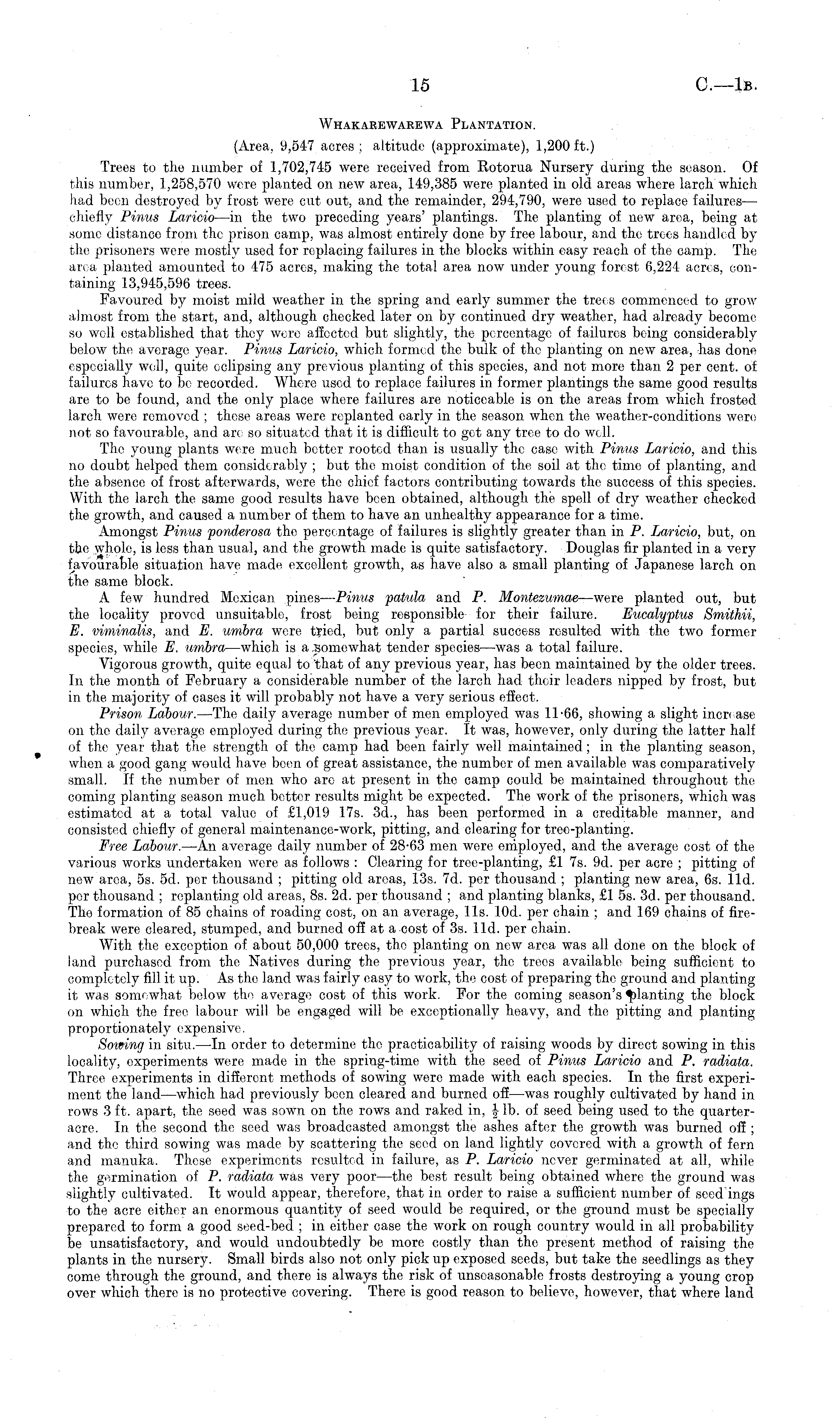 Whakarewarewa Plantation. (Area, 9,547 acres ; altitude (approximate), 1,200 ft.) Trees to the number of 1,702,745 were received from Rotorua Nursery during the season. Of this number, 1,258,570 were planted on new area, 149,385 were planted in old areas where larch which had been destroyed by frost were cut out, and the remainder, 294,790, were used to replace failures — chiefly Pinus Laricio —in the two preceding years' plantings. The planting of new area, being at some distance from the prison camp, was almost entirely done by free labour, and the trees handled by the prisoners were mostly used for replacing failures in the blocks within easy reach of the camp. The area planted amounted to 475 acres, making the total area now under young forest 6,224 acres, containing 13,945,596 trees. Favoured by moist mild weather in the spring and early summer the trees commenced to grow almost from the start, and, although checked later on by continued dry weather, had already become so well established that they were affected but slightly, the percentage of failures being considerably below the average year. Pinus Laricio, which formed the bulk of the planting on new area, has done especially well, quite eclipsing any previous planting of this species, and not more than 2 per cent, of failures have to be recorded. Where used to replace failures in former plantings the same good results are to be found, and the only place where failures are noticeable is on the areas from which frosted larch were removed ; these areas were replanted early in the season when the weather-conditions were not so favourable, and arc so situated that it is difficult to got any tree to do well. Tho young plants were much better rooted than is usually the case with Pinus Laricio, and this no doubt helped them considerably ; but the moist condition of the soil at the time of planting, and the absence of frost afterwards, were tho chief factors contributing towards tho success of this species. With the larch the same good results have been obtained, although the spell of dry weather checkod the growth, and caused a number of them to have an unhealthy appearance for a time. Amongst Pinus ponderosa the percentage of failures is slightly greater than in P. Laricio, but, on the whole, is less than usual, and the growth made is quite satisfactory. Douglas fir planted in a very favourable situation have made excellent growth, as have also a small planting of Japanese larch on the same block. A few hundred Mexican pines— Pinus patula and P. Montezumae —were planted out, but the locality proved unsuitable, frost being responsible for their failure. Eucalyptus Smithii, E. viminalis, and E. umbra were tried, but only a partial success resulted with the two former species, while E. umbra —which is a somewhat tender species—was a total failure. Vigorous growth, quite equal to that of any previous year, has been maintained by the older trees. In the month of February a considerable number of the larch had their leaders nipped by frost, but in the majority of cases it will probably not have a very serious effect. Prison Labour. —The daily average number of men employed was 11-66, showing a slight increase on the daily average employed during the previous year. It was, however, only during the latter half of the year that the strength of the camp had been fairly well maintained; in the planting season, when a good gang would have been of great assistance, the number of men available was comparatively small. If the number of men who arc at present in tho camp could be maintained throughout the coming planting season much better results might be expected. The work of the prisoners, which was estimated at a total value of £1,019 17s. 3d., has been performed in a creditable manner, and consisted chiefly of general maintenance-work, pitting, and clearing for tree-planting. Free Labour. —An average daily number of 28-63 men were employed, and the average cost of the various works undertaken were as follows : Clearing for tree-planting, £1 7s. 9d. per acre ; pitting of new area, ss. sd. per thousand ; pitting old areas, 13s. 7d. per thousand ; planting new area, 6s. lid. per thousand ; replanting old areas, Bs. 2d. per thousand ; and planting blanks, £1 ss. 3d. per thousand. The formation of 85 chains of roading cost, on an average, lis. lOd. per chain ; and 169 chains of firebreak were cleared, stumped, and burned off at a cost of 3s. lid. per chain. With the exception of about 50,000 trees, tho planting on new area was all done on the block of land purchased from the Natives during the previous year, the trees available being sufficient to completely fill it up. As the land was fairly easy to work, the cost of preparing the ground and planting it was somewhat below the average cost of this work. For the coming season's planting the block on which the free labour will be engaged will be exceptionally heavy, and the pitting and planting proportionately expensive. Sowing in situ. —In order to determine the practicability of raising woods by direct sowing in this locality, experiments were made in the spring-time with the seed of Pinus Laricio and P. radiata. Three experiments in different methods of sowing were made with each species. In the first experiment the land —which had previously been cleared and burned off —was roughly cultivated by hand in rows 3 ft. apart, the seed was sown on the rows and raked in, \ lb. of seed being used to the quarteracre. In the second the seed was broadcasted amongst the ashes after tho growth was burned off ; and the third sowing was made by scattering the seed on land lightly covered with a growth of fern and manuka. These experiments resulted in failure, as P. Laricio never germinated at all, while the germination of P. radiata was very poor —the best result being obtained where the ground was slightly cultivated. It would appear, therefore, that in order to raise a sufficient numbe