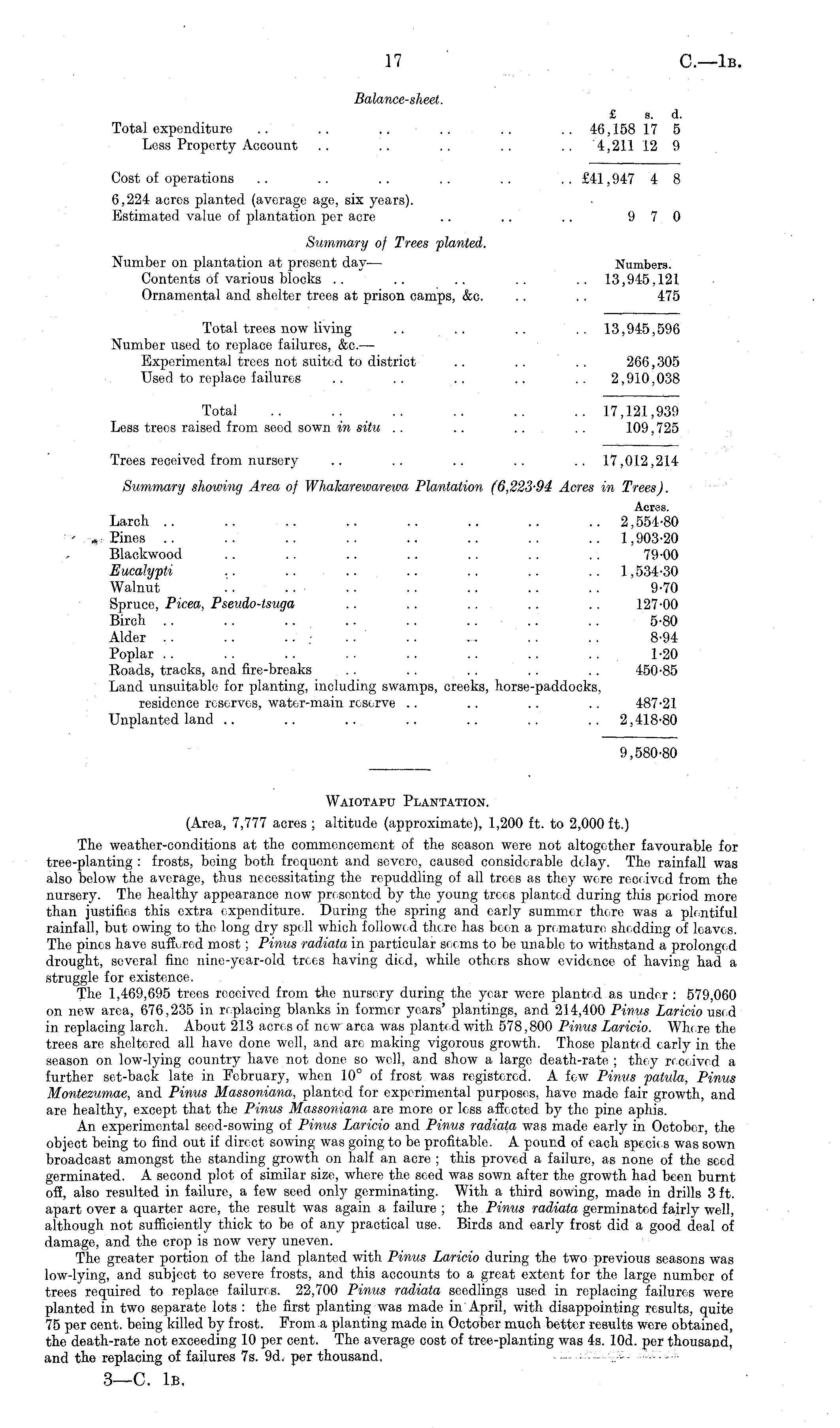 Balance-sheet. £ s. d. Total expenditure .... .. .. .. .. 46,158 17 5 Less Property Account .. .. .. .. .. 4,211 12 9 Cost of operations .. .. .. .. . . . . £41,947 4 8 6,224 acres planted (average age, six years). Estimated value of plantation per acre .. .. .. 9 7 0 Summary of Trees planted. Number on plantation at present day.— Numbers. Contents of various blocks .. .. .. .. .. 13,945,121 Ornamental and shelter trees at prison camps, &c. .. . . 475 Total trees now living .. .. .. ..13,945,596 Number used to replace failures, &c. — Experimental trees not suited to district .. .. .. 266,305 Used to replace failures .. .. .. .. .. 2,910,038 Total .. .. .. .. .. .. 17,121,939 Less trees raised from sood sown in situ . . .. . . . . 109,725 Trees received from nursery .. .. .. .. .. 17,012,214 Summary showing Area of Whakarewarewa Plantation (6,223-94 Acres in Trees). Larch .. .. .. .. .. .. .. .. 2,554-80 Pines .. .. .. .. .. .. .. .. 1,903-20 Blackwood .. .. .. .. .. .. .. 79-00 Eucalypti ~ .. .. .. .. 1,534-30 Walnut . . . . .. .. .. .. .. 9-70 Spruce, Picea, Pseudo-tsuga .. .. .. .. .. 127-00 Birch . . .. .. .. . . .. .. . . 5-80 Alder . . . . .. .. .. .. .. .. 8-94 Poplar . . . . .. .. .. .. .. . . 1-20 Roads, tracks, and fire-breaks . . . . . . . . .. 450-85 Land unsuitable for planting, including swamps, creeks, horse-paddocks, residence reserves, water-main reserve .. . . .. .. 487-21 Unplanted land .. ..' .. .. .. .. .. 2,418-80 9,580-80