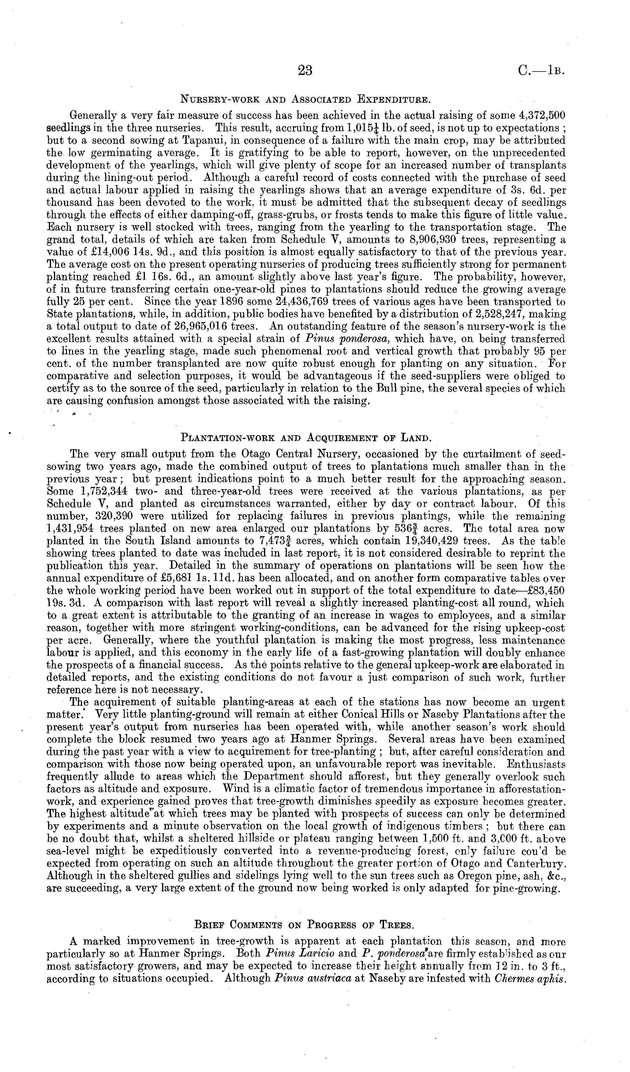 Nursery-work and Associated Expenditure. Generally a very fair measure of success has been achieved in the actual raising of some 4,372,500 seedlings in the three nurseries. This result, accruing from 1,015|r lb. of seed, is not up to expectations ; but to a second sowing at Tapanui, in consequence of a failure with the main crop, may be attributed the low germinating average. It is gratifying to be able to report, however, on the unprecedented development of the yearlings, which will give plenty of scope for an increased number of transplants during the lining-out period. Although a careful record of costs connected with the purchase of seed and actual labour applied in raising the yearlings shows that an average expenditure of 3s. 6d. per thousand has been devoted to the work, it must be admitted that the subsequent decay of seedlings through the effects of either damping-off, grass-grubs, or frosts tends to make this figure of little value. Each nursery is well stocked with trees, ranging from the yearling to the transportation stage. The grand total, details of which are taken from Schedule V, amounts to 8,906,930 trees, representing a value of £14,006 14s. 9d., and this position is almost equally satisfactory to that of the previous year. The average cost on the present operating nurseries of producing trees sufficiently strong for permanent planting reached £1 16s. 6d., an amount slightly above last year's figure. The probability, however, of in future transferring certain one-year-old pines to plantations should reduce the growing average fully 25 per cent. Since the year 1896 some 24,436,769 trees of various ages have been transported to State plantations, while, in addition, public bodies have benefited by a distribution of 2,528,247, making a total output to date of 26,965,016 trees. An outstanding feature of the season's nursery-work is the excellent results attained with a special strain of Pinus ponderosa, which have, on being transferred to lines in the yearling stage, made such phenomenal root and vertical growth that probably 95 per cent, of the number transplanted are now quite robust enough for planting on any situation. For comparative and selection purposes, it would be advantageous if the seed-suppliers were obliged to certify as to the source of the seed, particularly in relation to the Bull pine, the several species of which are causing confusion amongst those associated with the raising. Plantation-work and Acquirement op Land. The very small output from the Otago Central Nursery, occasioned by the curtailment of seedsowing two years ago, made the combined output of trees to plantations much smaller than in the previous year ; but present indications point to a much better result for the approaching season. Some 1,752,344 two- and three-year-old trees were received at the various plantations, as per Schedule V, and planted as circumstances warranted, either by day or contract labour. Of this number, 320,390 were utilized for replacing failures in previous plantings, while the remaining 1,431,954 trees planted on new area enlarged our plantations by 536f acres. The total area now planted in the South Island amounts to 7,473f acres, which contain 19,340,429 trees. As the table showing trees planted to date was included in last report, it is not considered desirable to reprint the publication this year. Detailed in the summary of operations on plantations will be seen how the annual expenditure of £5,681 Is. lid. has been allocated, and on another form comparative tables over the whole working period have been worked out in support of the total expenditure to date—£B3,4so 19s. 3d. A comparison with last report will reveal a slightly increased planting-cost all round, which to a great extent is attributable to the granting of an increase in wages to employees, and a similar reason, together with more stringent working-conditions, can be advanced for the rising upkeep-cost per acre. Generally, where the youthful plantation is making the most progress, less maintenance labour is applied, and this economy in the early life of a fast-growing plantation will doubly enhance the prospects of a financial success. As the points relative to the general upkeep-work are elaborated in detailed reports, and the existing conditions do not favour a just comparison of such work, further reference here is not necessary. The acquirement of suitable planting-areas at each of the stations has now become an urgent matter." Very little planting-ground will remain at either Conical Hills or Naseby Plantations after the present year's output from nurseries has been operated with, while another season's work should complete the block resumed two years ago at Hanmer Springs. Several areas have been examined during the past year with a view to acquirement for tree-planting ; but, after careful consideration and comparison with those now being operated upon, an unfavourable report was inevitable. Enthusiasts frequently allude to areas which the Department should afforest, but they generally overlook such factors as altitude and exposure. Wind is a climatic factor of tremendous importance in afforestationwork, and experience gained proves that tree-growth diminishes speedily as exposure becomes greater. The highest altitude r at which trees may be planted with prospects of success can only be determined by experiments and a minute observation on the local growth of indigenous timbers ; but there can be no doubt that, whilst a sheltered hillside or plateau ranging between 1,500 ft. and 3,C00 ft. above sea-level might be expeditiously converted into a revenue-producing forest, only failure cou'd be expected from operating on such an altitude throughout the greater portion of Otago and Canterbury. Although in the sheltered gullies and sidelings lying well to the sun trees such as Oregon pine, ash, &c, are succeeding, a very large extent of the ground now being worked is only adapted for pine-gr
