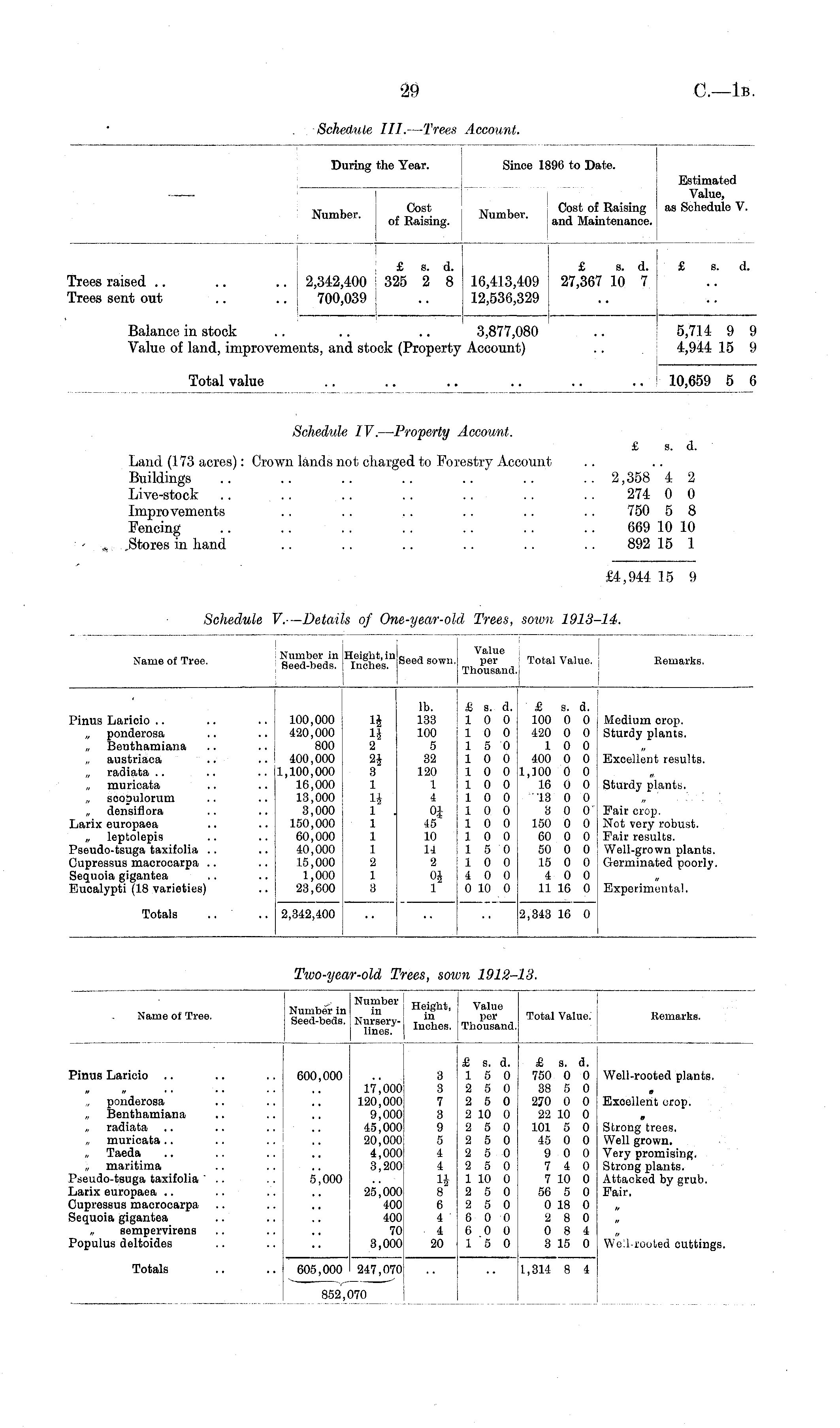 During the Year. Since 1896 to Date. Number. Cost of Raising. Number. Cost of Raising and Maintenance. Estimated Value, as Schedule V. £ s. d. "rees raised .. .. .. 2,342,400 325 2 8 16,413,409 'rees sent out .. .. 700,039 \ .. 12,536,329 £ 27,31 £ s. d. 27,367 10 7 167 £ s. d. 16,413,409 12,536,329 Balance in stock .. .. .. 3,877,080 Value of land, improvements, and stock (Property Account) 5,714 9 4,944 15 9 9 Total value 10,659 5 6