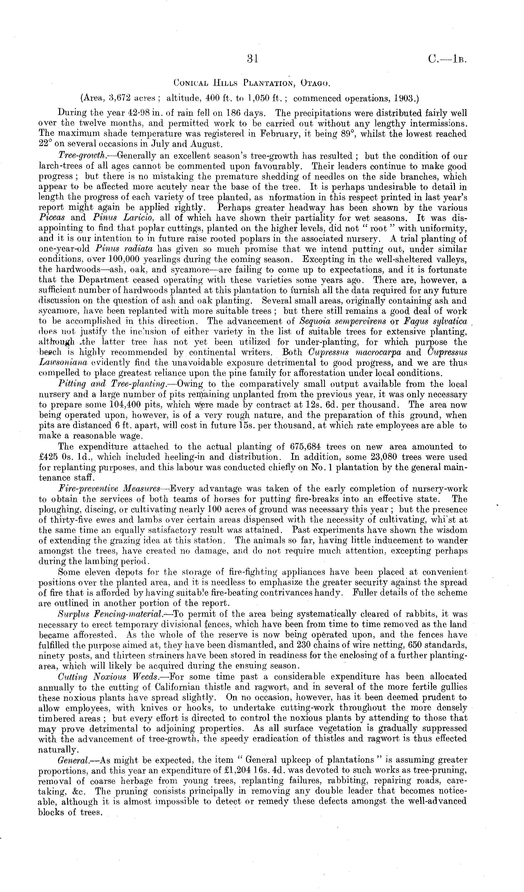 Conical Hills Plantation, Otago. (Area, 3,672 acres ; altitude, 400 ft. to 1,050 ft. ; commenced operations, 1903.) During the year 42-98 in. of rain fell on 186 days. The precipitations were distributed fairly well over the twelve months, and permitted work to be carried out without any lengthy intermissions. The maximum shade temperature was registered in February, it being 89°, whilst the lowest reached 22° on several occasions in July and August. Tree-growth. —Generally an excellent season's tree-growth has resulted ; but the condition of our larch-trees of all ages cannot be commented upon favourably. Their leaders continue to make good progress ; but there is no mistaking the premature shedding of needles on the side branches, which appear to be affected more acutely near the base of the tree. It is perhaps undesirable to detail in length the progress of each variety of tree planted, as nformation in this respect printed in last year's report might again be applied rightly. Perhaps greater headway has been shown by the various Piceas and Pinus Laricio, all of which have shown their partiality for wet seasons. It was disappointing to find that poplar cutting's, planted on the higher levels, did not " root " with uniformity, and it is our intention to in future raise rooted poplars in the associated nursery. A trial planting of one-year-old Pinus radiata has given so much promise that we intend putting out, under similar conditions, over 100,000 yearlings during the coming season. Excepting in the well-sheltered valleys, the hardwoods—ash, oak, and sycamore—are failing to come up to expectations, and it is fortunate that the Department ceased operating with these varieties some years ago. There are, however, a sufficient number of hardwoods planted at this plantation to furnish all the data required for any future discussion on the question of ash and oak planting. Several small areas, originally containing ash and sycamore, iiave been replanted with more suitable trees ; but there still remains a good deal of work to be accomplished in this direction. The advancement of Sequoia sentpervirens or Fagus sylvatica does not justify the inclusion of either variety in the list of suitable trees for extensive planting, although the latter tree has not yet been utilized for under-planting, for which purpose the beech is highly recommended by continental writers. Both Cupressus macroearpa and Cupressus Lawsoniana evidently find the unavoidable exposure detrimental to good progress, and we are thus compelled to place greatest reliance upon the pine family for afforestation under local conditions. Pitting and Tree-planting. —Owing to the comparatively small output available from the local nursery and a large number of pits remaining implanted from the previous year, it was only necessary to prepare some 104,400 pits, which were made by contract at 12s. 6d. per thousand. The area now being operated upon, however, is of a very rough nature, and the preparation of this ground, when pits are distanced 6 ft. apart, will cost in future 15s. per thousand, at which rate employees are able to make a reasonable wage. The expenditure attached to the actual planting of 675,684 trees on new area amounted to £425 os. Id., which included heeling-in and distribution. In addition, some 23,080 trees were used for replanting purposes, and this labour was conducted chiefly on No. 1 plantation by the general maintenance staff. Fire-preventive Measures —Every advantage was taken of the early completion of nursery-work to obtain the services of both teams of horses for putting fire-breaks into an effective state. The ploughing, discing, or cultivating nearly 100 acres of ground was necessary this year ; but the presence of thirty-five ewes and lambs over certain areas dispensed with the necessity of cultivating, whist at the same time an equally satisfactory result was attained. Past experiments have shown the wisdom of extending the grazing idea at this station. The animals so far, having little inducement to wander amongst the trees, have created no damage, and do not require much attention, excepting perhaps during the lambing period. Some eleven depots for the storage of fire-fighting appliances have been placed at convenient positions over the planted area, and it is needless to emphasize the greater security against the spread of fire that is afforded by having suitable fire-beating contrivances handy. Fuller details of the scheme are outlined in another portion of the report. Surplus Fencing-material. —To permit of the area being systematically cleared of rabbits, it was necessary to erect temporary divisional fences, which have been from time to time removed as the land became afforested. As the whole of the reserve is now being operated upon, and the fences have fulfilled the purpose aimed at, they have been dismantled, and 230 chains of wire netting, 650 standards, ninety posts, and thirteen strainers have been stored in readiness for the enclosing of a further plantingarea, which will likely be acquired during the ensuing season. Cutting Noxious Weeds. —For some time past a considerable expenditure has been allocated annually to the cutting of Californian thistle and ragwort, and in several of the more fertile gullies these noxious plants have spread slightly. On no occasion, however, has it been deemed prudent to allow employees, with knives or hooks, to undertake cutting-work throughout the more densely timbered areas ; but every effort is directed to control the noxious plants by attending to those that may prove detrimental to adjoining properties. As all surface vegetation is gradually suppressed with the advancement of tree-growth, the speedy eradication of thistles and ragwort is thus effected naturally. General. —-As might be expected, the item " General upkeep of plantations " is assuming greater proportions, and this year an expenditure of £1,204 1 6s. 4d. was devoted to such 