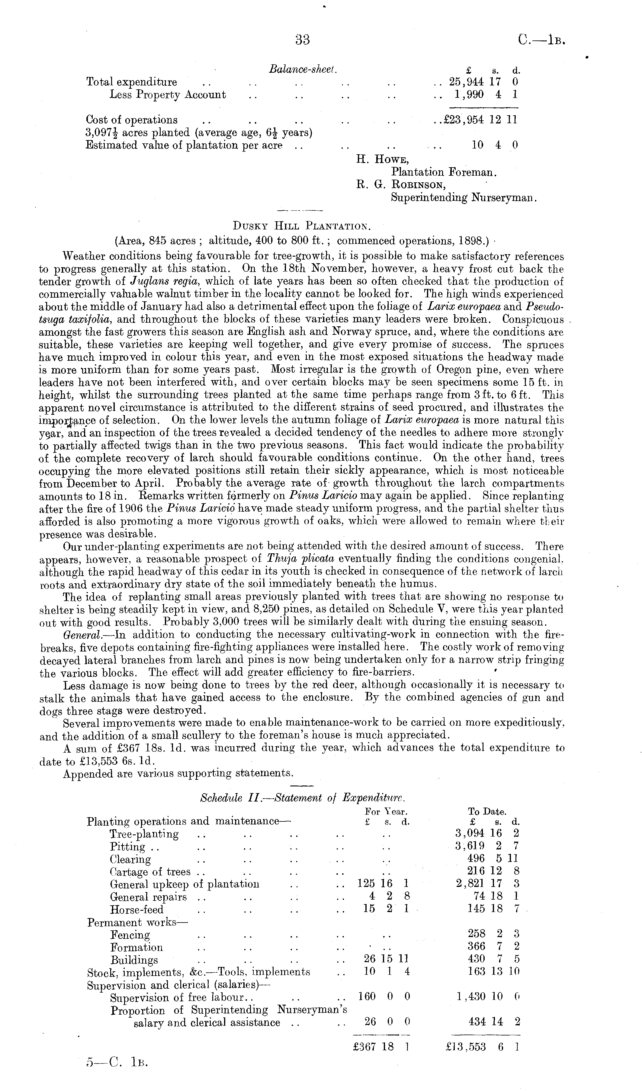 Dusky Hill Plantation. (Area, 845 acres ; altitude, 400 to 800 ft. ; commenced operations, 1898.) Weather conditions being favourable for tree-growth, it is possible to make satisfactory references to progress generally at this station. On the 18th November, however, a heavy frost cut back the tender growth of Juglans regia, which of late years has been so often checked that the production of commercially valuable walnut timber in the locality cannot be looked for. The high winds experienced about the middle of January had also a detrimental effect upon the foliage of Larix europaea and Pseudotsuga taxifolia, and throughout the blocks of these varieties many leaders were broken. Conspicuous amongst the fast growers this season are English ash and Norway spruce, and, where the conditions are suitable, these varieties are keeping well together, and give every promise of success. The spruces have much improved in colour this year, and even in the most exposed situations the headway made is more uniform than for some years past. Most irregular is the growth of Oregon pine, even where leaders have not been interfered with, and over certain blocks may be seen specimens some 15 ft. in height, whilst the surrounding trees planted at the same time perhaps range from 3 ft. to 6 ft. This apparent novel circumstance is attributed to the different strains of seed procured, and illustrates the importance of selection. On the lower levels the autumn foliage of Larix europaea is more natural this year, and an inspection of the trees revealed a decided tendency of the needles to adhere more strongly to partially affected twigs than in the two previous seasons. This fact would indicate the probability of the complete recovery of larch should favourable conditions continue. On the other hand, trees occupying the more elevated positions still retain their sickly appearance, which is most noticeable from December to April. Probably the average rate of growth throughout the larch compartments amounts to 18 in. Remarks written formerly on Pinus Laricio may again be applied. Since replanting after the fire of 1906 the Pinus Laricio have made steady uniform progress, and the partial shelter thus afforded is also promoting a more vigorous growth of oaks, which were allowed to remain where their presence was desirable. Our under-planting experiments are not being attended with the desired amount of success. There appears, however, a reasonable prospect of Thuja plicata eventually finding the conditions congenial, although the rapid headway of this cedar in its youth is checked in consequence of the network of larch roots and extraordinary dry state of the soil immediately beneath the humus. The idea of replanting small areas previously planted with trees that are showing no response to shelter is being steadily kept in view, and 8,250 pines, as detailed on Schedule V, were this year planted out with good results. Probably 3,000 trees will be similarly dealt with during the ensuing season. General. —In addition to conducting the necessary cultivating-work in connection with the firebreaks, five depots containing fire-fighting appliances were installed here. The costly work of removing decayed lateral branches from larch and pines is now being undertaken only for a narrow strip fringing the various blocks. The effect will add greater efficiency to fire-barriers. ' Less damage is now being done to trees by the red deer, although occasionally it is necessary to stalk the animals that have gained access to the enclosure. By the combined agencies of gun and dogs three stags were destroyed. Several improvements were made to enable maintenance-work to be carried on more expeditiously, and the addition of a small scullery to the foreman's house is much appreciated. A sum of £367 18s. Id. was incurred during the year, which advances the total expenditure to date to £13,553 6s. Id. Appended are various supporting statements. Schedule II. — Statement of Expenditure. For Year. To Date. Planting operations and maintenance — £ s. d. £ s. d. Tree-planting .. .. .. .. .. 3,094 16 2 Pitting .. .. .. .. .. .. 3,619 2 7 Clearing .. .. .. .. ;/. 496 511 Cartage of trees .. .. .. .. .. 216 12 8 General upkeep of plantation .. .. 125 16 1 2,821 17 3 General repairs .. .. .. .. 428 74 181 Horse-feed .. .. .. .. 15 2 1 145 18 7 Permanent works — Fencing . . . . .. .. .. 258 2 3 Formation . . .. .. .. - -. 366 7 2 Buildings .. .. .. .. 26 15 11 430 7 5 Stock, implements, &c. —Tools, implements .. 10 1 4 1631310 Supervision and clerical (salaries) — Supervision of free labour.. . . . . 160 0 0 1,430 10 0 Proportion of Superintending Nurseryman's salary and clerical assistance .. . . 26 0 0 434 14 2 £367 18 1 £13,553 6 1
