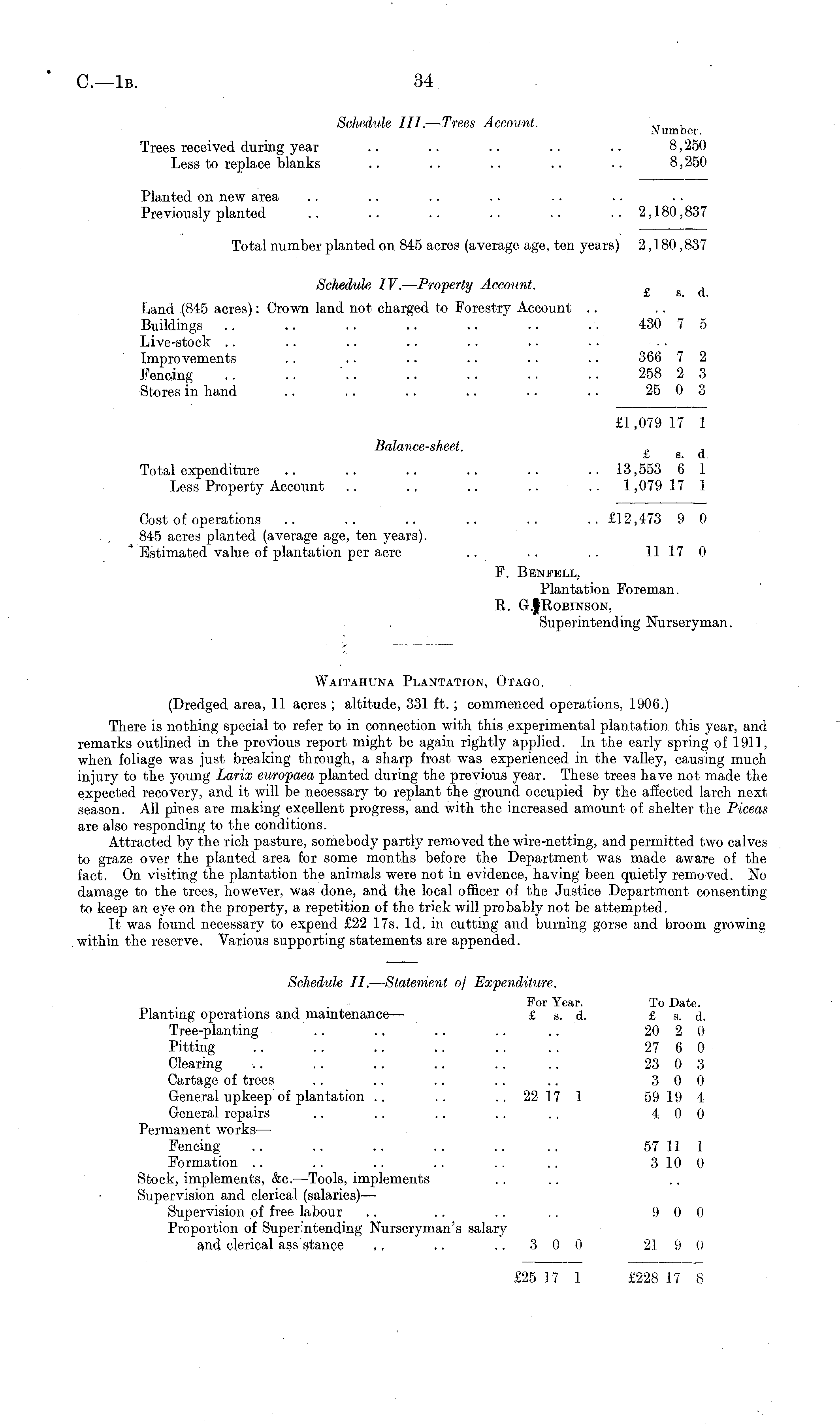 Schedule 111. — Trees Account. ~ .Number. Trees received during year .. .. .. .. .. 8,250 Less to replace blanks .. .. .. .. .. 8, 250 Planted on new area Previously planted .. .. .. .. .. .. 2,180,837 Total number planted on 845 acres (average age, ten years) 2 ,180 ,837 Schedule IV. — Property Account. , Land (845 acres): Crown land not charged to Forestry Account Buildings .. .. .. .. .. .. . • 430 7 5 Live-stock Improvements .. .. .. .. .. .. 366 7 2 Fencing .. .. " 258 2 3 Stores in hand .. .. .. .. .. .. 25 0 3 £1,079 17 1 Balance-sheet. . , £ s. d Total expenditure .. .. .. .. .. .. 13,553 6 1 Less Property Account .. .. .. .. .. 1,079 17 1 Cost of operations .. .. .. .. .. ..£12,473 9 0 845 acres planted (average age, ten years). Estimated value of plantation per acre .. .. .. 11 17 0 F. Benfell, Plantation Foreman. R. G.|Robinson, Superintending Nurseryman.