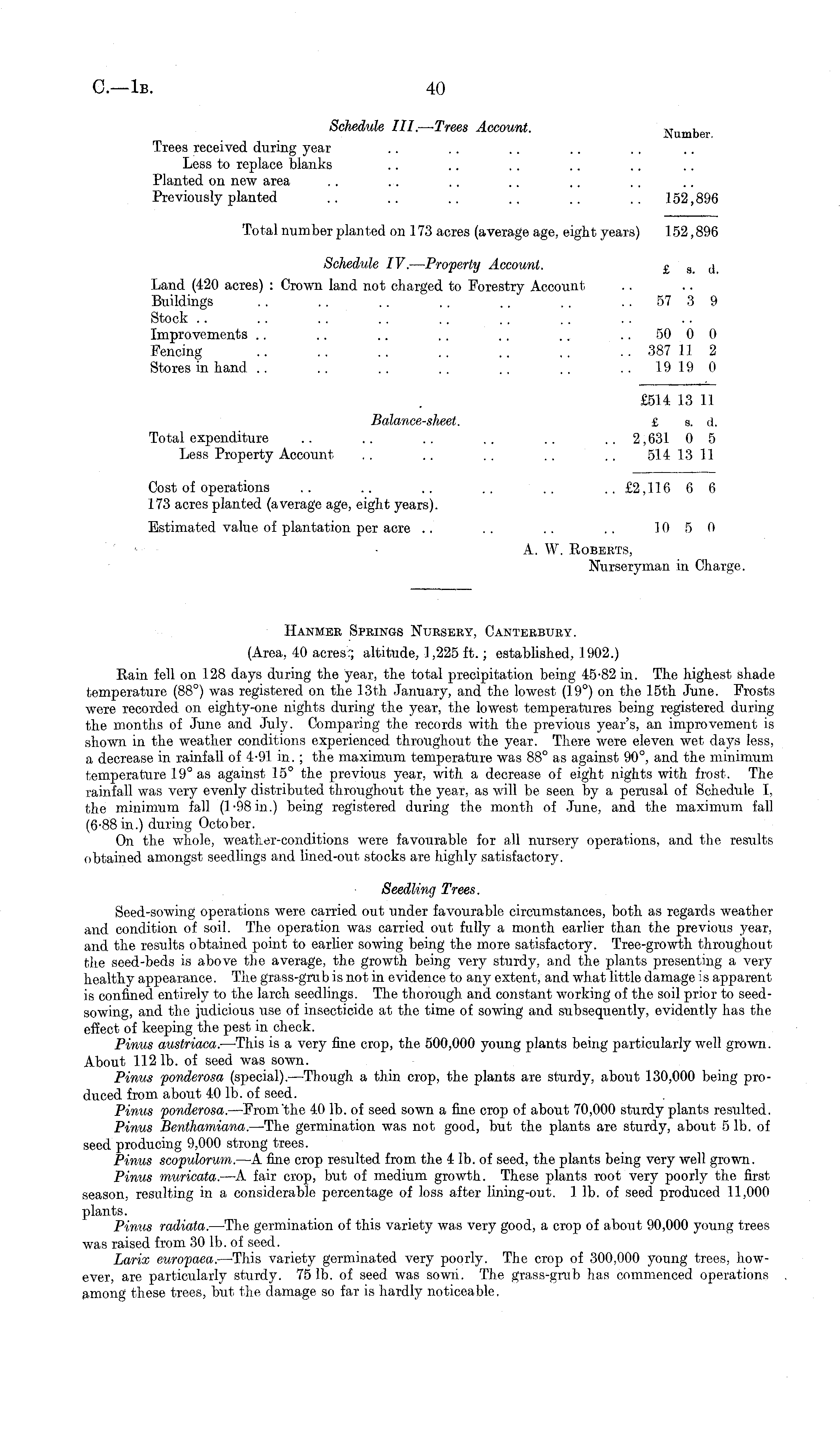 Schedule 111. — Trees Account. Number Trees received during year Less to replace blanks Planted on new area Previously planted .. .. .. .. .. ..152,896 Total number planted on 173 acres (average age, eight years) 152,896 Schedule IV. — Property Account. £ s _ j. Land (420 acres) : Crown land not charged to Forestry Account Buildings .. .. .. .. .. .. 57 3 9 Stock Improvements .. .. .. .. .. ~ 50 0 0 Fencing .. . . . . .. . . .. .. 387 11 2 Stores in hand .. .. .. .. ..19190 £514 13 11 Balance-sheet. £ s. d. Total expenditure .. .. .. .. .. .. 2,631 0 5 Less Property Account . . .. .. .. .. 514 13 1.1 Cost of operations .. .. .. .. .. .. £2,116 6 6 173 acres planted (average age, eight years). Estimated value of plantation per acre .. . . . . .. 10 5 0 A. W. Roberts, Nurseryman in Charge.