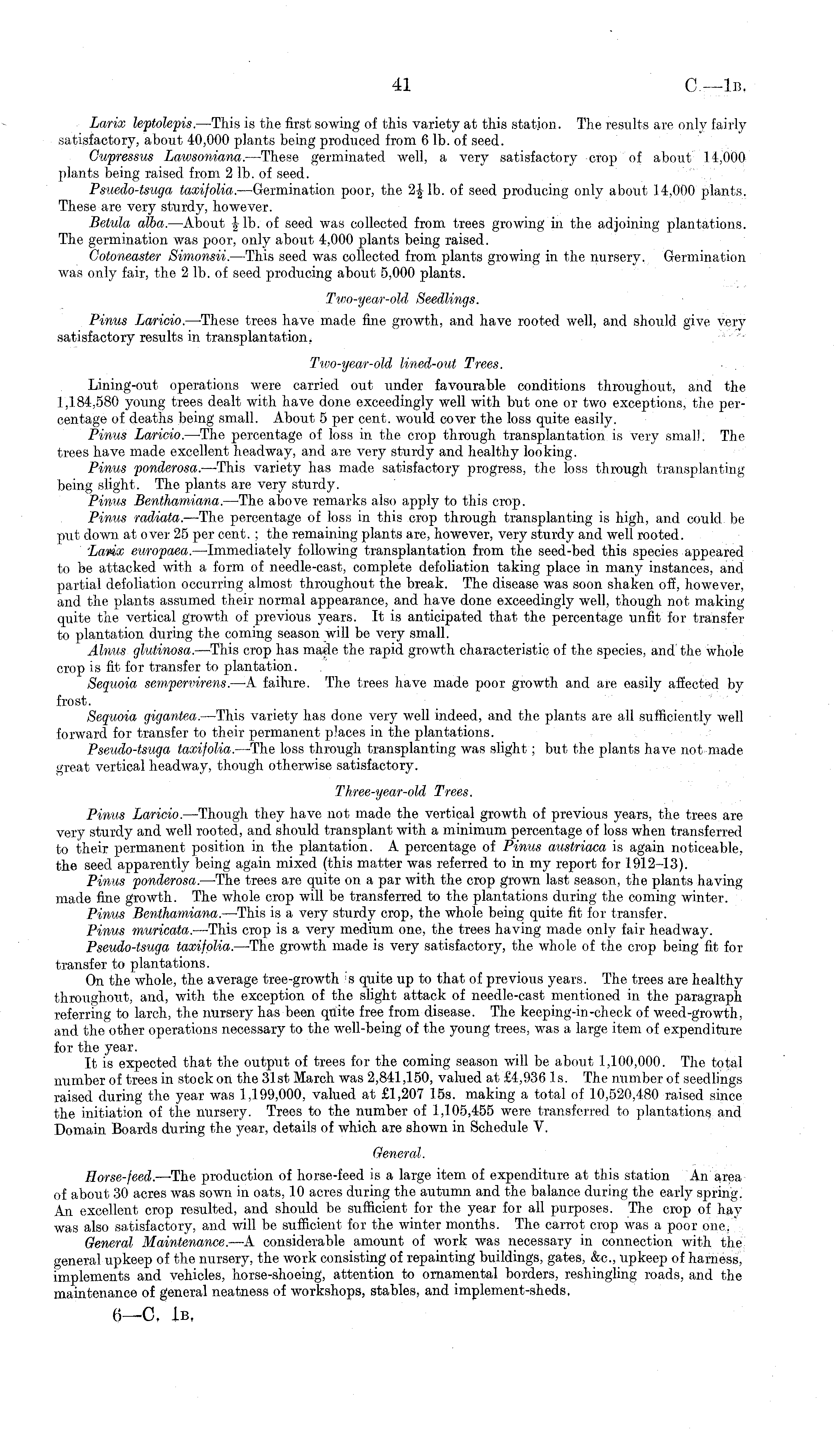 Larix leptolepis. —-This is the first sowing of this variety at this station. The results are only fairly satisfactory, about 40,000 plants being produced from 6 lb. of seed. Cupressus Lawsoniana. —These germinated well, a very satisfactory crop of about 14,000 plants being raised from 2 lb. of seed. Psuedo-tsuga taxifolia. —Germination poor, the lb. of seed producing only about 14,000 plants. These are very sturdy, however. Betula alba. —About fib, of seed was collected from trees growing in the adjoining plantations. The germination was poor, only about 4,000 plants being raised. Cotoneaster Simonsii. —This seed was collected from plants growing in the nursery. Germination was only fair, the 2 lb. of seed producing about 5,000 plants. Two-year-old Seedlings. Pinus Laricio. —These trees have made fine growth, and have rooted well, and should give very satisfactory results in transplantation. Two-year-old lined-out Trees. Lining-out operations were carried out under favourable conditions throughout, and the 1,184,580 young trees dealt with have done exceedingly well with but one or two exceptions, the percentage of deaths being small. About 5 per cent, would cover the loss quite easily. Pinus Laricio. —-The percentage of loss in the crop through transplantation is very small. The trees have made excellent headway, and are very sturdy and healthy looking. Pinus ponderosa. —This variety has made satisfactory progress, the loss through transplanting being slight. The plants are very sturdy. Pinus Benthamiana. —The above remarks also apply to this crop. Pinus radiata. —The percentage of loss in this crop through transplanting is high, and could be put down at over 25 per cent. ; the remaining plants are, however, very sturdy and well rooted. Larix europaea. —Immediately following transplantation from the seed-bed this species appeared to be attacked with a form of needle-cast, complete defoliation taking place in many instances, and partial defoliation occurring almost throughout the break. The disease was soon shaken off, however, and the plants assumed their normal appearance, and have done exceedingly well, though not making quite the vertical growth of previous years. It is anticipated that the percentage unfit for transfer to plantation during the coming season will be very small. Alnus glutinosa. —This crop has made the rapid growth characteristic of the species, and the whole crop is fit for transfer to plantation. Sequoia sempervirens. —A failure. The trees have made poor growth and are easily affected by frost. Sequoia gigantea. —This variety has done very well indeed, and the plants are all sufficiently well forward for transfer to their permanent places in the plantations. Pseudo-tsuga taxifolia. —The loss through transplanting was slight; but the plants have not made great vertical headway, though otherwise satisfactory. Three-year-old Trees. Pinus Laricio. —Though they have not made the vertical growth of previous years, the trees are very sturdy and well rooted, and should transplant with a minimum percentage of loss when transferred to their permanent position in the plantation. A percentage of Pinus austriaca is again noticeable, the seed apparently being again mixed (this matter was referred to in my report for 1912-13). Pinus ponderosa. —The trees are quite on a par with the crop grown last season, the plants having made fine growth. The whole crop will be transferred to the plantations during the coming winter. Pinus Benthamiana. —This is a very sturdy crop, the whole being quite fit for transfer. Pinus muricata. —This crop is a very medium one, the trees having made only fair headway. Pseudo-tsuga taxifolia. —The growth made is very satisfactory, the whole of the crop being fit for transfer to plantations. On the whole, the average tree-growth s quite up to that of previous years. The trees are healthy throughout, and, with the exception of the slight attack of needle-cast mentioned in the paragraph referring to larch, the nursery has been quite free from disease. The keeping-in-check of weed-growth, and the other operations necessary to the well-being of the young trees, was a large item of expenditure for the year. It is expected that the output of trees for the coming season will be about 1,100,000. The total number of trees in stock on the 31st March was 2,841,150, valued at £4,936 Is. The number of seedlings raised during the year was 1,199,000, valued at £1,207 15s. making a total of 10,520,480 raised since the initiation of the nursery. Trees to the number of 1,105,455 were transferred to plantations and Domain Boards during the year, details of which are shown in Schedule V. General. Horse-feed. —-The production of horse-feed is a large item of expenditure at this station An area of about 30 acres was sown in oats, 10 acres during the autumn and the balance during the early spring. An excellent crop resulted, and should be sufficient for the year for all purposes. The crop of hay was also satisfactory, and will be sufficient for the winter months. The carrot crop was a poor one. General Maintenance. —A considerable amount of work was necessary in connection with the general upkeep of the nursery, the work consisting of repainting buildings, gates, &c, upkeep of harness, implements and vehicles, horse-shoeing, attention to ornamental borders, reshingling roads, and the maintenance of general neatness of workshops, stables, and implement-sheds.