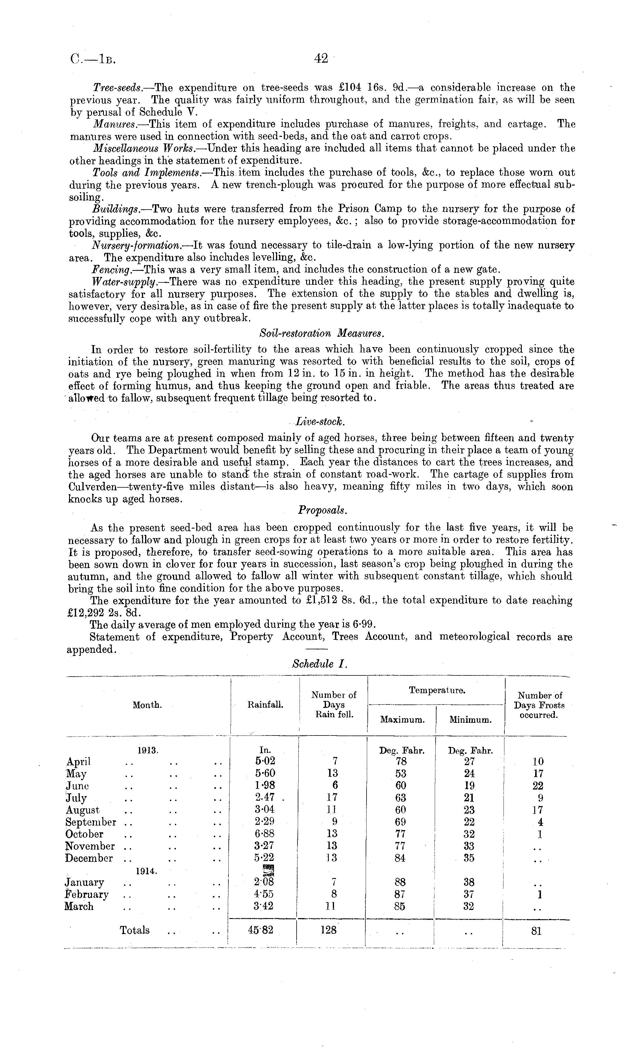 Tree-seeds. —The expenditure on tree-seeds was £104 16s. 9d. —a considerable increase on the previous year. The quality was fairly uniform throughout, and the germination fair, as will be seen by perusal of Schedule V. Manures. —This item of expenditure includes purchase of manures, freights, and cartage. The manures were used in connection with seed-beds, and the oat and carrot crops. Miscellaneous Works. —'Under this heading are included all items that cannot be placed under the other headings in the statement of expenditure. Tools and Implements. —This item includes the purchase of tools, &c, to replace those worn out during the previous years. A new trench-plough was procured for the purpose of more effectual subsoiling. Buildings. —Two huts were transferred from the Prison Camp to the nursery for the purpose of providing accommodation for the nursery employees, &c. ; also to provide storage-accommodation for tools, supplies, &c. Nursery-formation. —-It was found necessary to tile-drain a low-lying portion of the new nursery area. The expenditure also includes levelling, &c. Fencing. —This was a very small item, and includes the construction of a new gate. Water-supply. —There was no expenditure under this heading, the present supply proving quite satisfactory for all nursery purposes. The extension of the supply to the stables and dwelling is, however, very desirable, as in case of fire the present supply at the latter places is totally inadequate to successfully cope with any outbreak. Soil-restoration Measures. In order to restore soil-fertility to the areas which have been continuously cropped since the initiation of the nursery, green manuring was resorted to with beneficial results to the soil, crops of oats and rye being ploughed in when from 12 in. to 15 in. in height. The method has the desirable effect of forming humus, and thus keeping the ground open and friable. The areas thus treated are allowed to fallow, subsequent frequent tillage being resorted to. Live-stock. Our teams are at present composed mainly of aged horses, three being between fifteen and twenty years old. The Department would benefit by selling these and procuring in their place a team of younghorses of a more desirable and useful stamp. Each year the distances to cart the trees increases, and the aged horses are unable to stand the strain of constant road-work. The cartage of supplies from Culverden —twenty-five miles distant—is also heavy, meaning fifty miles in two days, which soon knocks up aged horses. Proposals. As the present seed-bed area has been cropped continuously for the last five years, it will be necessary to fallow and plough in green crops for at least two years or more in order to restore fertility. It is proposed, therefore, to transfer seed-sowing operations to a more suitable area. This area has been sown down in clover for four years in succession, last season's crop being ploughed in during the autumn, and the ground allowed to fallow all winter with subsequent constant tillage, which should bring the soil into fine condition for the above purposes. The expenditure for the year amounted to £1,512 Bs. 6d., the total expenditure to date reaching £12,292 2s. Bd. The daily average of men employed during the year is 6-99. Statement of expenditure, Property Account, Trees Account, and meteorological records are appended.