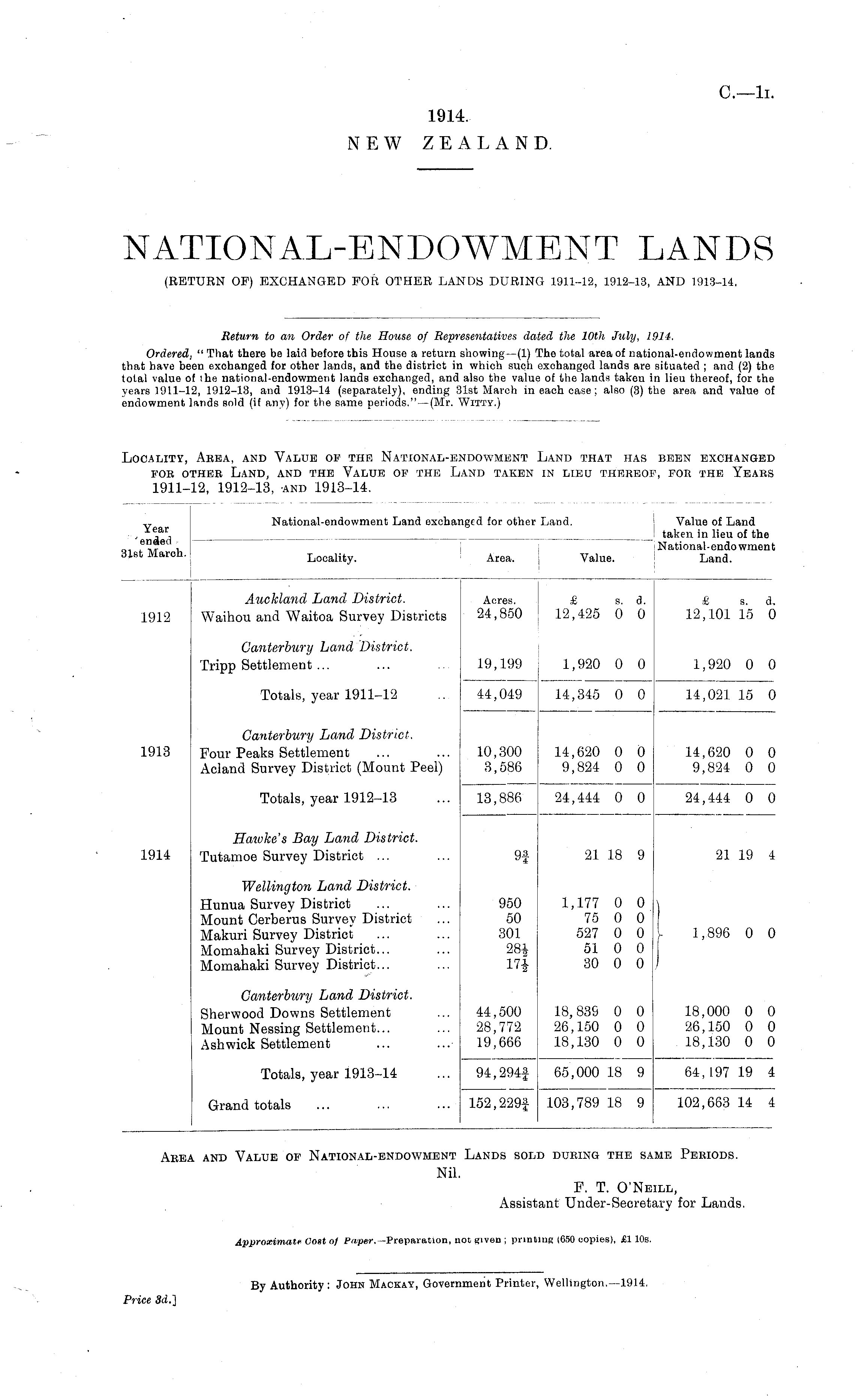 Return to an Order of the House of Representatives dated the 10th July, 1914. Ordered. " That there be laid before this House a return showing—(l) The total area of national-endowment lands that have been exchanged for other lands, and the district in which such exohanged lands are situated ; and (2) the total value of the national-endowment lands exchanged, and also the value of the lands taken in lieu thereof, for the years 1911-12, 1912-18, and 1913-14 (separately), ending 31st March in each case; also (3) the area and value of endowment lands sold (if any) for the same periods."—(Mr. Witty.)