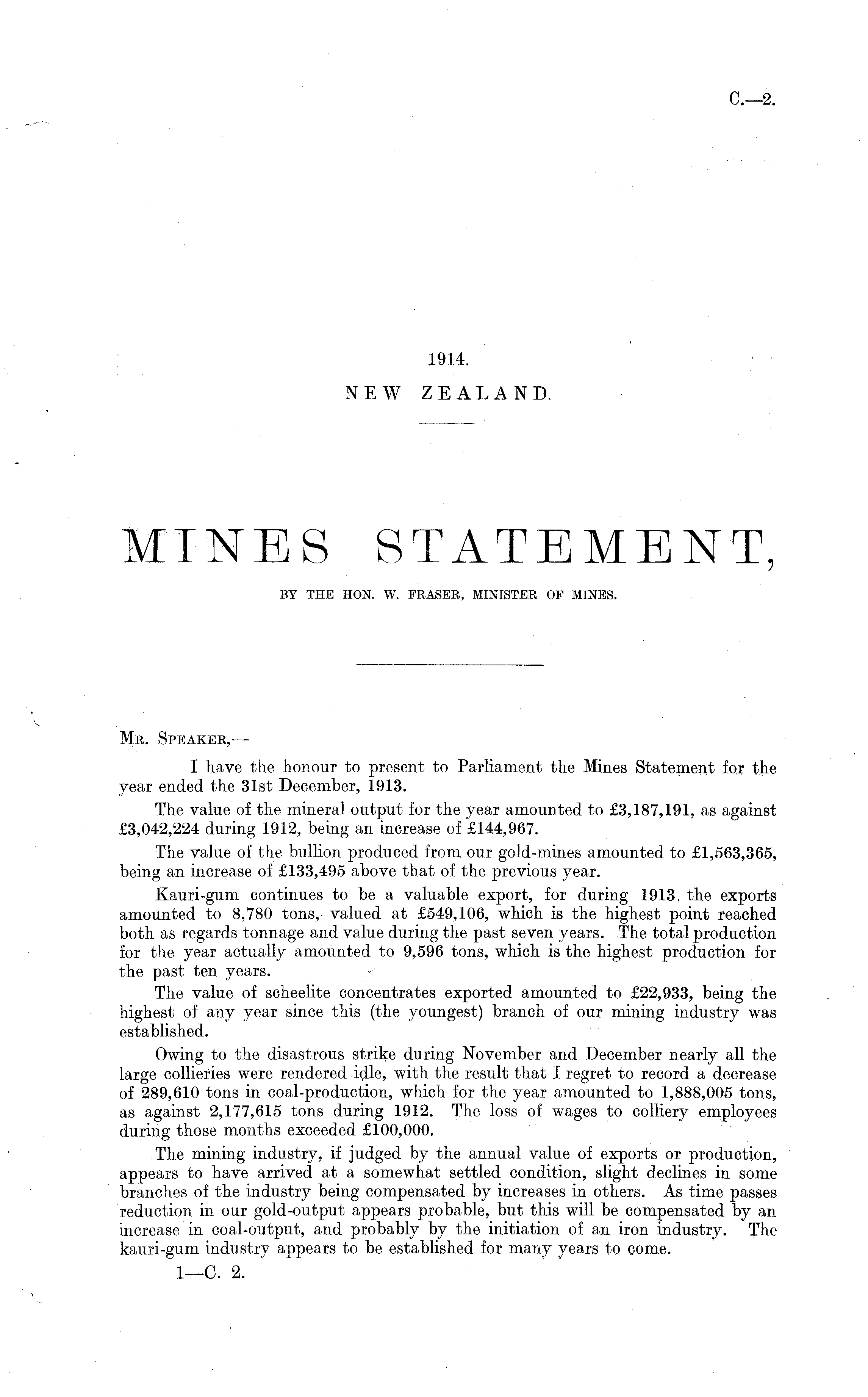 Mr. Speaker,— I have the honour to present to Parliament the Mines Statement for the year ended the 31st December, 1913. The value of the mineral output for the year amounted to £3,187,191, as against £3,042,224 during 1912, being an increase of £144,967. The value of the bullion produced from our gold-mines amounted to £1,563,365, being an increase of £133,495 above that of the previous year. Kauri-gum continues to be a valuable export, for during 1913, the exports amounted to 8,780 tons, valued at £549,106, which is the highest point reached both as regards tonnage and value during the past seven years. The total production for the year actually amounted to 9,596 tons, which is the highest production for the past ten years. The value of scheelite concentrates exported amounted to £22,933, being the highest of any year since this (the youngest) branch of our mining industry was established. Owing to the disastrous strike during November and December nearly all the large collieries were rendered idle, with the result that I regret to record a decrease of 289,610 tons in coal-production, which for the year amounted to 1,888,005 tons, as against 2,177,615 tons during 1912. The loss of wages to colliery employees during those months exceeded £100,000. The mining industry, if judged by the annual value of exports or production, appears to have arrived at a somewhat settled condition, slight declines in some branches of the industry being compensated by increases in others. As time passes reduction in our gold-output appears probable, but this will be compensated by an increase in coal-output, and probably by the initiation of an iron industry. The kauri-gum industry appears to be established for many years to come.