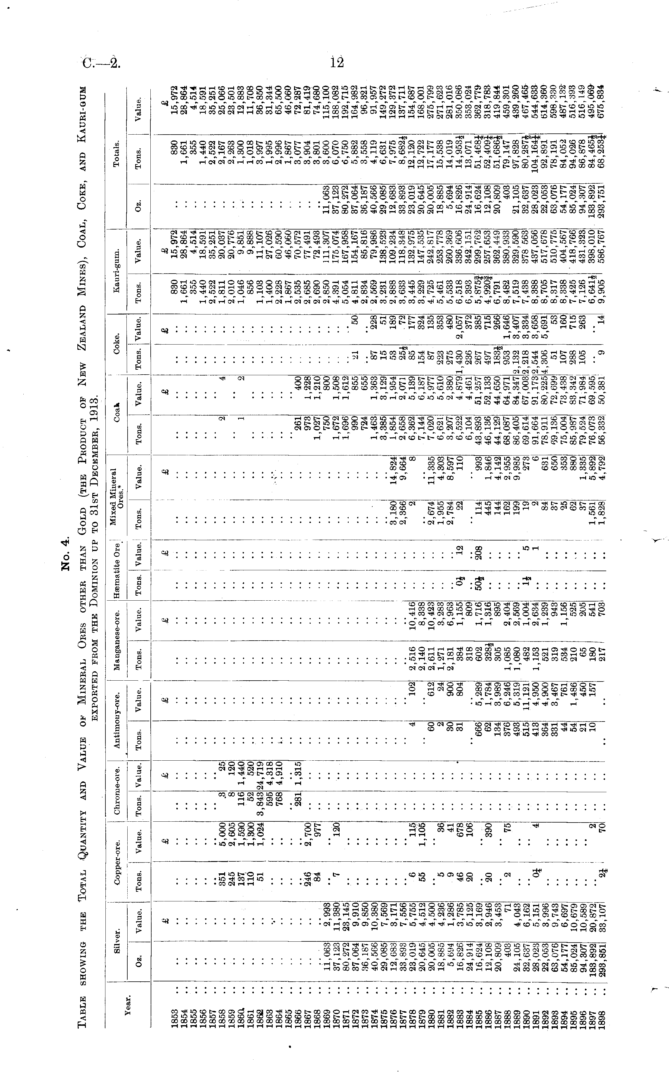 No. 4. Table showing the Total Quantity and Value of Mineral Ores other than Gold (the Product of New Zealand Mines), Coal, Coke, and Kauri-gum exported from the Dominion up to 31st December, 1913.
