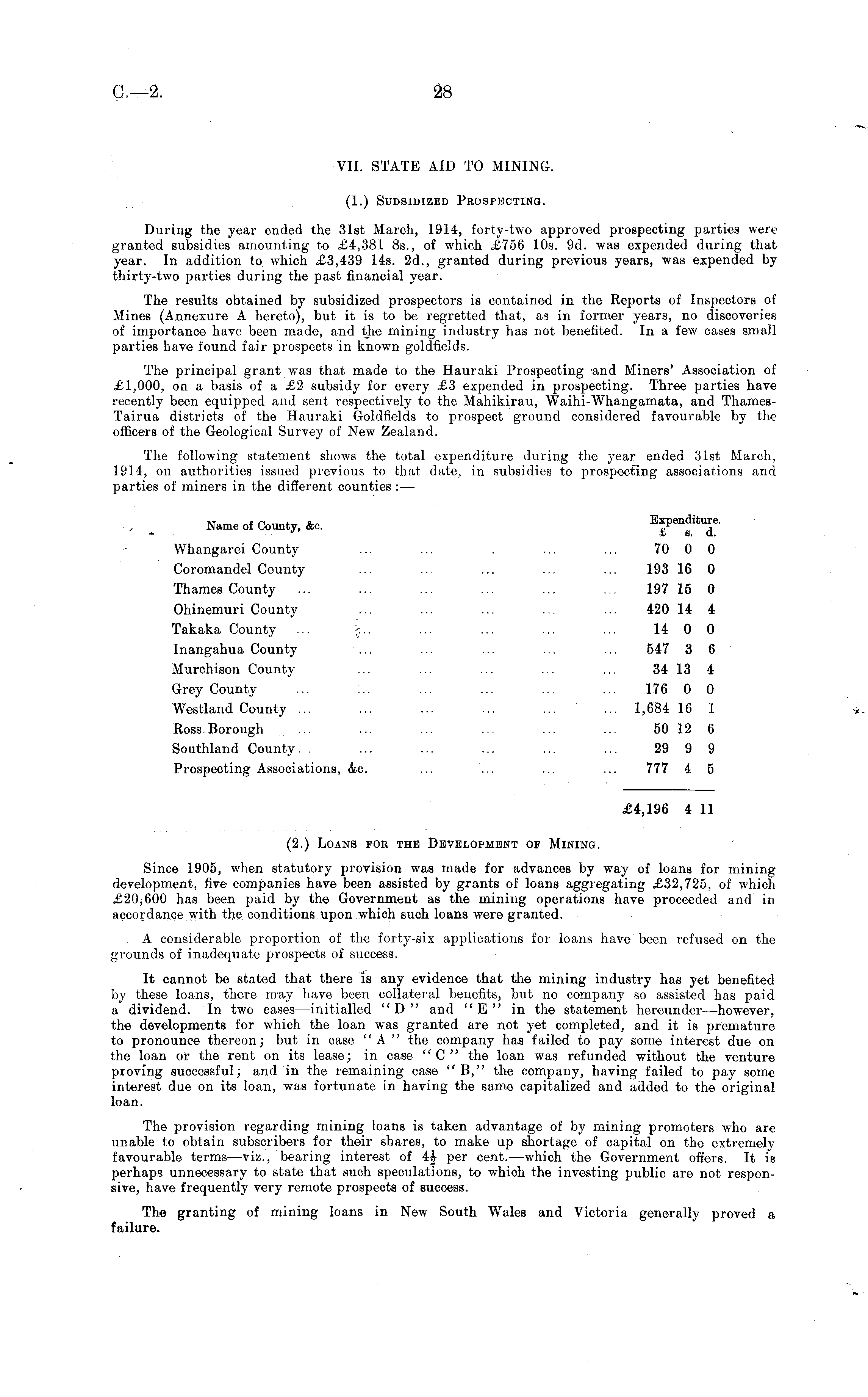 VII. STATE AID TO MINING. (1.) Sudsidizbd Prospecting. During the year ended the 31st March, 1914, forty-two approved prospecting parties were granted subsidies amounting to £4,381 Bs., of which £756 10s. 9d. was expended during that year. In addition to which £3,439 14s. 2d., granted during previous years, was expended by thirty-two parties during the past financial year. The results obtained by subsidized prospectors is contained in the Reports of Inspectors of Mines (Annexure A hereto), but it is to be regretted that, as in former years, no discoveries of importance have been made, and the mining industry has not benefited. In a few cases small parties have found fair prospects in known goldfields. The principal grant was that made to the Hauraki Prospecting and Miners' Association of £1,000, on a basis of a £2 subsidy for every £3 expended in prospecting. Three parties have recently been equipped and sent respectively to the Mahikirau, Waihi-Whangamata, and ThamesTairua districts of the Hauraki Goldfields to prospect ground considered favourable by the officers of the Geological Surve}' of New Zealand. The following statement shows the total expenditure during the year ended 31st March, 1914, on authorities issued previous to that date, in subsidies to prospecting associations and parties of miners in the different counties : — Name of County, &c. Expenditure. Whangarei County ... ... ... ... 70 0 0 Coromandel County ... ... ... ... ... 193 16 0 Thames County ... ... ... ... ... ... 197 15 0 Ohinemuri County ... ... ... ... ... 420 14 4 Takaka County ... ... ... ... ... ... 14 0 0 Inangahua County ... ... ... ... ... 547 3 6 Murchison County ... ... ... ... .... 34 13 4 Grey County ... :.. ... ... ... ... 176 0 0 Westland County ... ... ... ... ... ... 1,684 16 1 Ross Borough ... ... ... ... ... ... 50 12 6 Southland County. . ... ... ... ... ... 29 9 9 Prospecting Associations, &c. ... ... ... ... 777 4 5 £4,196 4 11 (2.) Loans for the Development of Mining. Since 1905, when statutory provision was made for advances by way of loans for mining development, five companies have been assisted by grants of loans aggregating £32,725, of which £20,600 has been paid by the Government as the mining operations have proceeded and in accordance with the conditions upon which such loans were granted. A considerable proportion of the forty-six applications for loans have been refused on the grounds of inadequate prospects of success. It cannot be stated that there is any evidence that the mining industry has yet benefited by these loans, there may have been collateral benefits, but no company so assisted has paid a dividend. In two cases —initialled "D " and "E " in the statement hereunder—however, the developments for which the loan was granted are not yet completed, and it is premature to pronounce thereon; but in case "A" the company has failed to pay some interest due on the loan or the rent on its lease; in case "C" the loan was refunded without the venture proving successful; and in the remaining case " B," the company, having failed to pay some interest due on its loan, was fortunate in having the same capitalized and added to the original loan. The provision regarding mining loans is taken advantage of by mining promoters who are unable to obtain subscribers for their shares, to make up shortage of capital on the extremely favourable terms —viz., bearing interest of 4J per cent.—which the Government offers. It is perhaps unnecessary to state that such speculations, to which the investing public are not responsive, have frequently very remote prospects of success. The granting of mining loans in New South Wales and Victoria generally proved a failure.