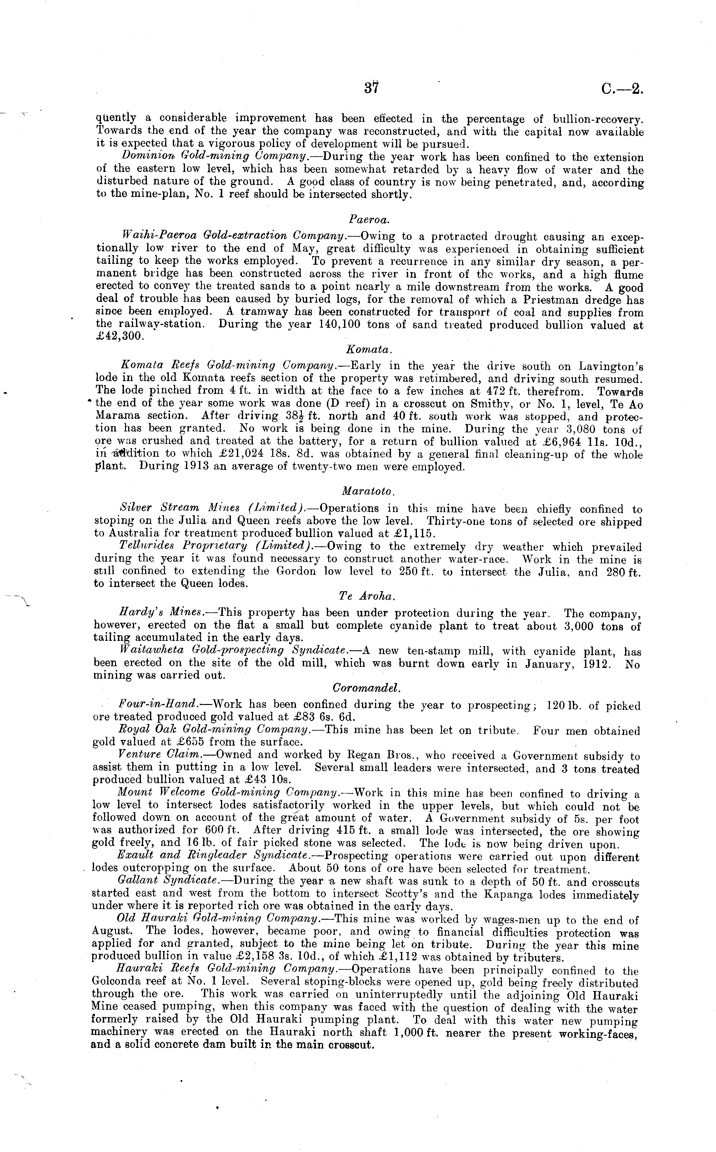 quently a considerable improvement has been effected in the percentage of bullion-recovery. Towards the end of the year the company was reconstructed, and with the capital now available it is expected that a vigorous policy of development will be pursued. Dominion Gold-mining Company. —During the year work has been confined to the extension of the eastern low level, which has been somewhat retarded by a heavy flow of water and the disturbed nature of the ground. A good class of country is now being penetrated, and, according to the mine-plan, No. 1 reef should be intersected shortly. Paeroa. Waihi-Paeroa Gold-extraction Company. —Owing to a protracted drought causing an exceptionally low river to the end of May, great difficulty was experienced in obtaining sufficient tailing to keep the works employed. To prevent a recurrence in any similar dry season, a permanent bridge has been constructed across the river in front of the works, and a high flume erected to convey the treated sands to a point nearly a mile downstream from the works. A good deal of trouble has been caused by buried logs, for the removal of which a Priestman dredge has since been employed. A tramway has been constructed for transport of coal and supplies from the railway-station. During the year 140,100 tons of sand treated produced bullion valued at £42,300. Komata. Komata Beefs Gold-mining Company. —Early in the year the drive south on Lavington's lode in the old Komata reefs section of the property was retimbered, and driving south resumed. The lode pinched from 4 ft. in width at the face to a few inches at 472 ft. therefrom. Towards ' the end of the year some work was done (D reef) in a crosscut on Smithy, or No. 1, level, Te Ao Marama section. After driving 38$ ft. north and 40 ft. south work was stopped, and protection has been granted. No work is being done in the mine. During the year 3,080 tons of ore was crushed and treated at the battery, for a return of bullion valued at £6,964 lis. 10d., in addition to which £21,024 18s. Bd. was obtained by a general final cleaning-up of the whole plant. During 1913 an average of twenty-two men were employed. Mara to to. Silver Stream Mines (Limited). —Operations in this mine have been chiefly confined to stoping on the Julia and Queen reefs above the low level. Thirty-one tons of selected ore shipped to Australia for treatment produced bullion valued at £1,115. Tellnrides Proprietary (Limited). —Owing to the extremely dry weather which prevailed during the year it was found necessary to construct another water-race. Work in the mine is still confined to extending the Gordon low level to 250 ft, to intersect the Julia, and 280 ft. to intersect the Queen lodes. Te Aroha. Hardy's Mines. —This property has been under protection during the year. The company, however, erected on the flat a small but complete cyanide plant to treat about 3,000 tons of tailing accumulated in the early days. Waitawheta Gold-prospecting Syndicate. —A new ten-stamp mill, with cyanide plant, has been erected on the site of the old mill, which was burnt down early in January, 1912. No mining was carried out. Coromandel. Four-in-Hand. —Work has been confined during the year to prospecting; 1201b. of picked ore treated produced gold valued at £83 6s. 6d. Boyal Oak Gold-mining Company. —This mine has been let on tribute. Four men obtained gold valued at £655 from the surface. Venture Claim. —Owned and worked by Regan Bros., who received a Government subsidy to assist them in putting in a low level. Several small leaders were intersected, and 3 tons treated produced bullion valued at £43 10s. Mount Welcome Gold-mining Company. —Work in this mine has been confined to driving a low level to intersect lodes satisfactorily worked in the upper levels, but which could not be followed down on account of the great amount of water. A Government subsidy of ss. per foot was authorized for 600 ft. After driving 415 ft. a small lode was intersected, the ore showing gold freely, and 161b. of fair picked stone was selected. The lode is now being driven upon. Exault and Bingleader Syndicate. —Prospecting operations were carried out upon different lodes outcropping on the surface. About 50 tons of ore have been selected for treatment. Gallant Syndicate. —During the year a new shaft was sunk to a depth of 50 ft. and crosscuts started east and west from the bottom to intersect Scotty's and the Kapanga lodes immediately under where it is reported rich ore was obtained in the early days. Old Hauraki Gold-mining Company. —This mine was worked by wages-men up to the end of August. The lodes, however, became poor, and owing to financial difficulties protection was applied for and granted, subject to the mine being let on tribute. During the year this mine produced bullion in value £2,158 3s. 10d., of which £1,112 was obtained by tributers. Hauraki Beefs Gold-mining Company. —Operations have been principally confined to the Golconda reef at No. 1 level. Several stoping-blocks were opened up, gold being' freely distributed through the ore. This work was carried on uninterruptedly until the adjoining Old Hauraki Mine ceased pumping, when this company was faced with the question of dealing with the water formerly raised by the Old Hauraki pumping plant. To deal with this water new pumping machinery was erected on the Hauraki north shaft 1,000 ft. nearer the present working-faces, and a solid concrete dam built in the main crosscut.