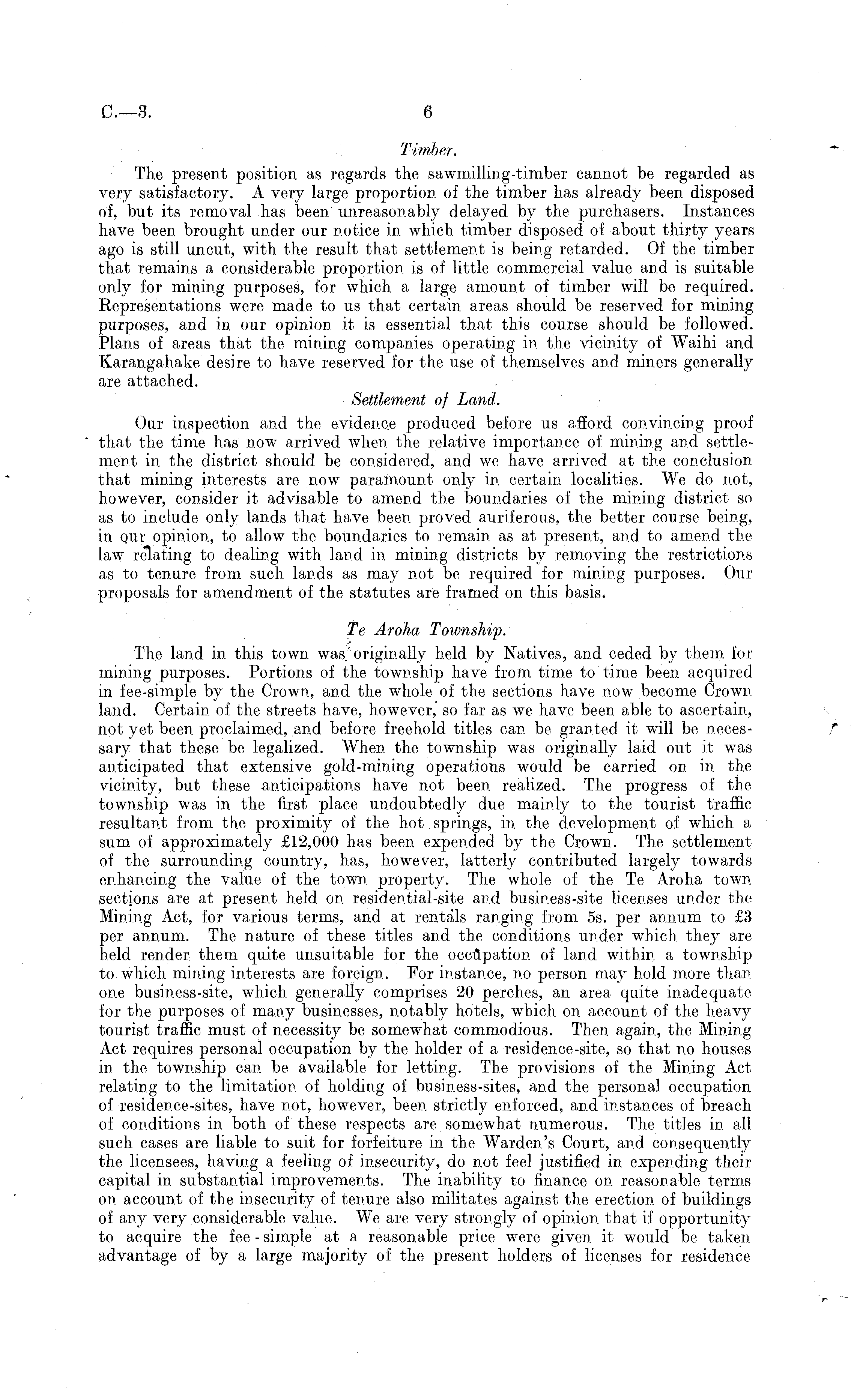 Timber. The present position as regards the sawmilling-timber cannot be regarded as very satisfactory. A very large proportion of the timber has already been disposed of, but its removal has been unreasonably delayed by the purchasers. Instances have been brought under our notice in which timber disposed of about thirty years ago is still uncut, with the result that settlement is being retarded. Of the timber that remains a considerable proportion is of little commercial value and is suitable only for mining purposes, for which a large amount of timber will be required. Representations were made to us that certain areas should be reserved for mining purposes, and in our opinion it is essential that this course should be followed. Plans of areas that the mining companies operating in the vicinity of Waihi and Karangahake desire to have reserved for the use of themselves and miners generally are attached. Settlement of Land. Our inspection and the evidence produced before us afford convincing proof that the time has now arrived when the relative importance of mining and settlement in. the district should be considered, and we have arrived at the conclusion that mining interests are now paramount only in certain localities. We do not, however, consider it advisable to amend the boundaries of the mining district so as to include only lands that have been proved auriferous, the better course being, in our opinion, to allow the boundaries to remain as at present, and to amend the law relating to dealing with land in mining districts by removing the restrictions as to tenure from such lands as may not be required for mining purposes. Our proposals for amendment of the statutes are framed on this basis. Te Aroha Township. The land in this town was originally held by Natives, and ceded by them for mining purposes. Portions of the township have from time to time been acquired in fee-simple by the Crown, and the whole of the sections have now become Crown land. Certain of the streets have, however, so far as we have been able to ascertain, not yet been proclaimed, and before freehold titles can be granted it will be necessary that these be legalized. When the township was originally laid out it was anticipated that extensive gold-mining operations would be carried on in the vicinity, but these anticipations have not been realized. The progress of the township was in the first place undoubtedly due mainly to the tourist traffic resultant from the proximity of the hot springs, in the development of which a sum of approximately £12,000 has been expended by the Crown. The settlement of the surrounding country, has, however, latterly contributed largely towards enhancing the value of the town property. The whole of the Te Aroha town sections are at present held on residential-site and business-site licenses under the Mining Act, for various terms, and at rentals ranging from ss. per annum to £3 per annum. The nature of these titles and the conditions under which they are held render them quite unsuitable for the occupation of land within a township to which mining interests are foreign. For instance, no person may hold more than one business-site, which generally comprises 20 perches, an area quite inadequate for the purposes of many businesses, notably hotels, which on account of the heavy tourist traffic must of necessity be somewhat commodious. Then again, the Mining Act requires personal occupation by the holder of a residence-site, so that no houses in the township can be available for letting. The provisions of the Mining Act relating to the limitation of holding of business-sites, and the personal occupation, of residence-sites, have not, however, been strictly enforced, and instances of breach of conditions in both of these respects are somewhat numerous. The titles in all such cases are liable to suit for forfeiture in the Warden's Court, and consequently the licensees, having a feeling of insecurity, do not feel justified in expending their capital in substantial improvements. The inability to finance on reasonable terms on account of the insecurity of tenure also militates against the erection of buildings of any very considerable value. We are very strongly of opinion that if opportunity to acquire the fee - simple at a reasonable price were given it would be taken advantage of by a large majority of the present holders of licenses for residence
