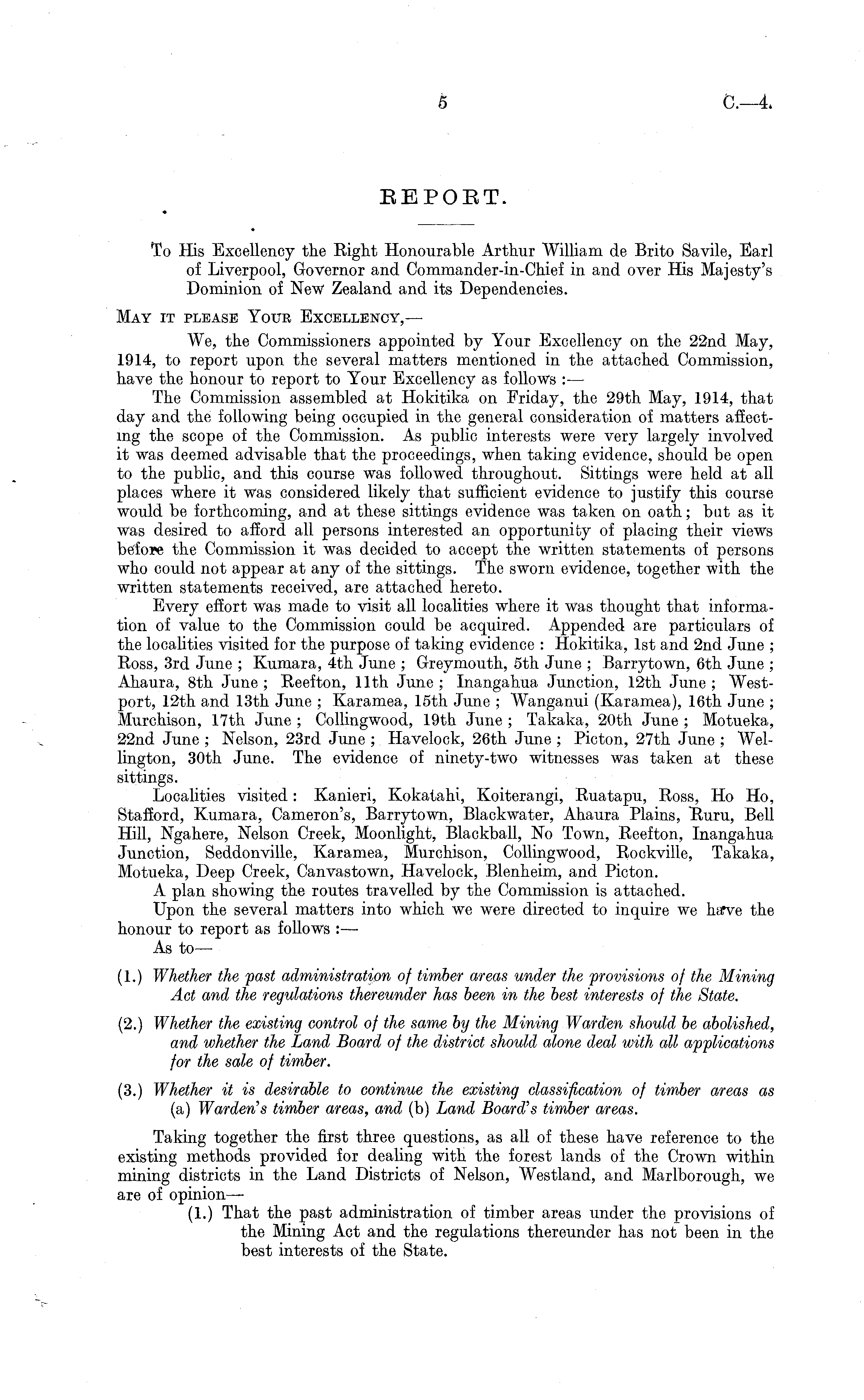 To His Excellency the Right Honourable Arthur William de Brito Savile, Earl of Liverpool, Governor and Commander-in-Chief in and over His Majesty's Dominion of New Zealand and its Dependencies. May it please Your Excellency,— We, the Commissioners appointed by Your Excellency on the 22nd May, 1914, to report upon the several matters mentioned in the attached Commission, have the honour to report to Your Excellency as follows : — The Commission assembled at Hokitika on Friday, the 29th May, 1914, that day and the following being occupied in the general consideration of matters affecting the scope of the Commission. As public interests were very largely involved it was deemed advisable that the proceedings, when taking evidence, should be open to the public, and this course was followed throughout. Sittings were held at all places where it was considered likely that sufficient evidence to justify this course would be forthcoming, and at these sittings evidence was taken on oath; but as it was desired to afford all persons interested an opportunity of placing their views before the Commission it was decided to accept the written statements of persons who could not appear at any of the sittings. The sworn evidence, together with the written statements received, are attached hereto. Every effort was made to visit all localities where it was thought that information of value to the Commission could be acquired. Appended are particulars of the localities visited for the purpose of taking evidence : Hokitika, Ist and 2nd June ; Ross, 3rd June ; Kumara, 4th June ; Greymouth, sth June ; Barrytown, 6th June ; Ahaura, Bth June ; Reefton, 11th June ; Inangahua Junction, 12th June ; Westport, 12th and 13th June ; Karamea, 15th June ; Wanganui (Karamea), 16th June ; Murchison, 17th June ; Collingwood, 19th June ; Takaka, 20th June ; Motueka, 22nd June ; Nelson, 23rd June ; Havelock, 26th June ; Picton, 27th June ; Wellington, 30th June. The evidence of ninety-two witnesses was taken at these sittings. Localities visited: Kanieri, Kokatahi, Koiterangi, Ruatapu, Ross, Ho Ho, Stafford, Kumara, Cameron's, Barrytown, Blackwater, Ahaura Plains, Ruru, Bell Hill, Ngahere, Nelson Creek, Moonlight, Blackball, No Town, Reefton, Inangahua Junction, Seddonville, Karamea, Murchison, Collingwood, Rockville, Takaka, Motueka, Deep Creek, Canvastown, Havelock, Blenheim, and Picton. A plan showing the routes travelled by the Commission is attached. Upon the several matters into which we were directed to inquire we harve the honour to report as follows :— As to — (1.) Whether the fast administration of timber areas under the provisions of the Mining Act and the regulations thereunder has been in the best interests of the State. (2.) Whether the existing control of the same by the Mining Warden should be abolished, and whether the Land Board of the district should alone deal with all applications for the sale of timber. (3.) Whether it is desirable to continue the existing classification of timber areas as (a) Warden's timber areas, and (b) Land Board's timber areas. Taking together the first three questions, as all of these have reference to the existing methods provided for dealing with the forest lands of the Crown within mining districts in the Land Districts of Nelson, Westland, and Marlborough, we are of opinion— (1.) That the past administration of timber areas under the provisions of the Mining Act and the regulations thereunder has not been in the best interests of the State.