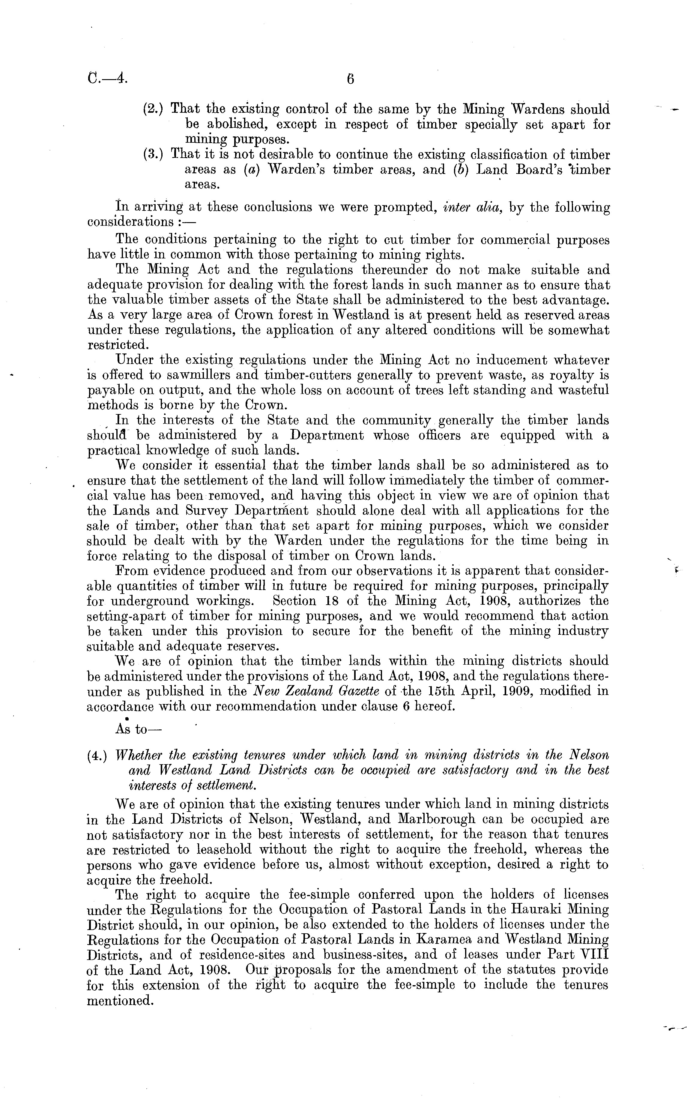 (2.) That the existing control of the same by the Mining Wardens should be abolished, except in respect of timber specially set apart for mining purposes. (3.) That it is not desirable to continue the existing classification of timber areas as (a) Warden's timber areas, and (&) Land Board's 'timber areas. In arriving at these conclusions We were prompted, inter alia, by the following considerations :— The conditions pertaining to the right to cut timber for commercial purposes have little in common with those pertaining to mining rights. The Mining Act and the regulations thereunder do not make suitable and adequate provision for dealing with the forest lands in such manner as to ensure that the valuable timber assets of the State shall be administered to the best advantage. As a very large area of Crown forest in Westland is at present held as reserved areas under these regulations, the application of any altered conditions will be somewhat restricted. Under the existing regulations under the Mining Act no inducement whatever is offered to sawmillers and timber-cutters generally to prevent waste, as royalty is payable on output, and the whole loss on account of trees left standing and wasteful methods is borne by the Crown. In the interests of the State and the community generally the timber lands should be administered by a Department whose officers are equipped with a practical knowledge of such lands. We consider it essential that the timber lands shall be so administered as to ensure that the settlement of the land will follow immediately the timber of commercial value has been removed, and having this object in view we are of opinion that the Lands and Survey Department should alone deal with all applications for the sale of timber, other than that set apart for mining purposes, which we consider should be dealt with by the Warden under the regulations for the time being in force relating to the disposal of timber on Crown lands. From evidence produced and from our observations it is apparent that considerable quantities of timber will in future be required for mining purposes, principally for underground workings. Section 18 of the Mining Act, 1908, authorizes the setting-apart of timber for mining purposes, and we would recommend that action be taken under this provision to secure for the benefit of the mining industry suitable and adequate reserves. We are of opinion that the timber lands within the mining districts should be administered under the provisions of the Land Act, 1908, and the regulations thereunder as published in the New Zealand Gazette of the 15th April, 1909, modified in accordance with our recommendation under clause 6 hereof. As to — (4.) Whether the existing tenures under which land in mining districts in the Nelson and Westland Land Districts can be occupied are satisfactory and in the best interests of settlement. We are of opinion that the existing tenures under which land in mining districts in the Land Districts of Nelson, Westland, and Marlborough can be occupied are not satisfactory nor in the best interests of settlement, for the reason that tenures are restricted to leasehold without the right to acquire the freehold, whereas the persons who gave evidence before us, almost without exception, desired a right to acquire the freehold. The right to acquire the fee-simple conferred upon the holders of licenses under the Regulations for the Occupation of Pastoral Lands in the Hauraki Mining District should, in our opinion, be also extended to the holders of licenses under the Regulations for the Occupation of Pastoral Lands in Karamea and Westland Mining Districts, and of residence-sites and business-sites, and of leases under Part VIII of the Land Act, 1908. Our proposals for the amendment of the statutes provide for this extension of the right to acquire the fee-simple to include the tenures mentioned.