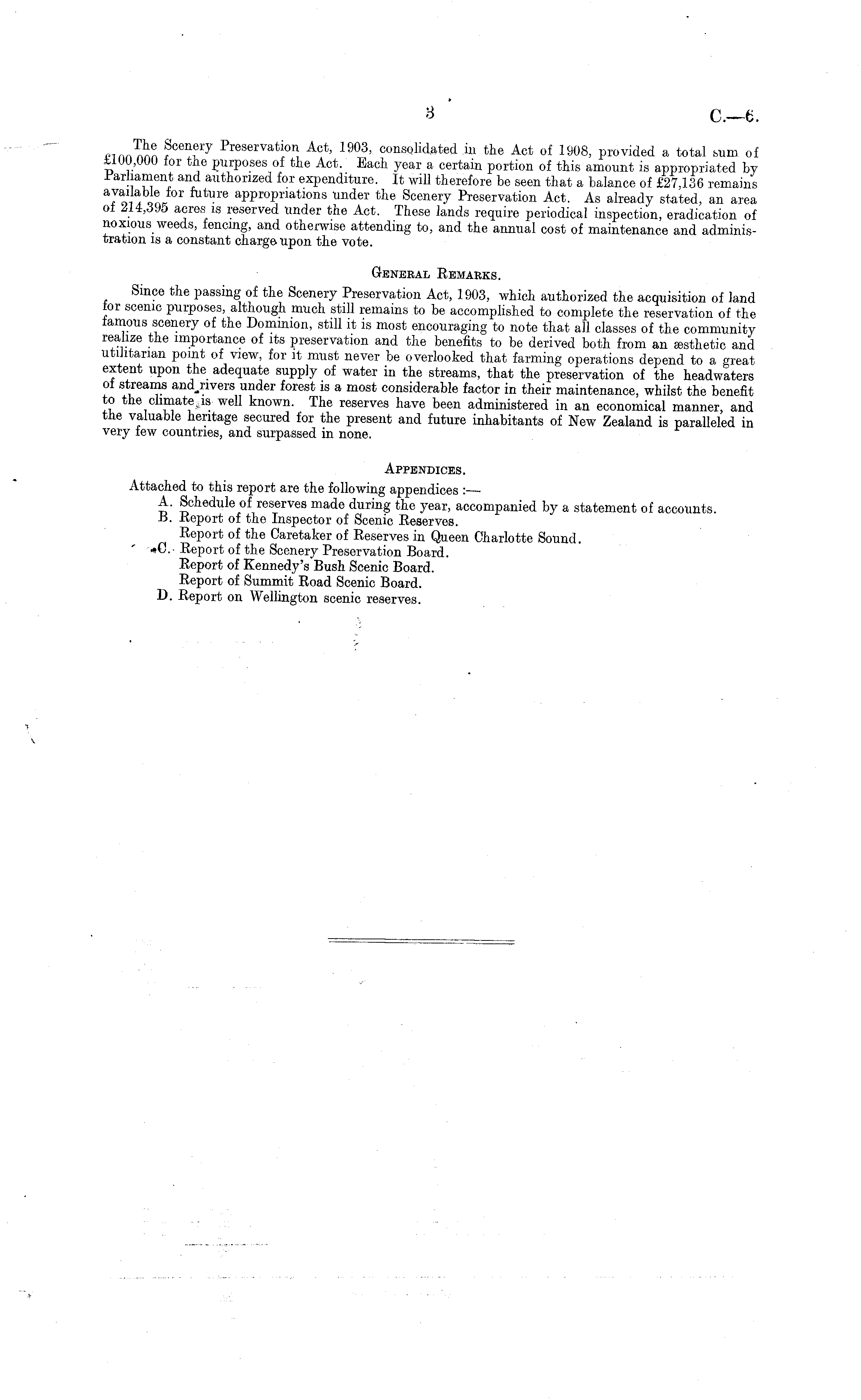 emnnnn ?°T 7 Preservat ! on Act > 1903 , consolidated in the Act of 1908, provided a total sum of £100,000 tor the purposes of the Act. Each year a certain portion of this amount is appropriated bv Parliament and authorized for expenditure. It will therefore be seen that a balance of £27,136 remains a 7o 1 1 a ; oL ' e a PP ro P rlatlonB tmder the Scenery Preservation Act. As already stated, an area of 214,395 acres is reserved under the Act. These lands require periodical inspection, eradication of noxious weeds, fencing, and otherwise attending to, and the annual cost of maintenance and administration is a constant charge upon the vote. General Remarks. Since the passing of the Scenery Preservation Act, 1903, which authorized the acquisition of land tor scenic purposes, although much still remains to be accomplished to complete the reservation of the famous scenery of the Dominion, still it is most encouraging to note that all classes of the community realize the importance of its preservation and the benefits to be derived both from an sesthetic and utilitarian point of view, for it must never be overlooked that farming operations depend to a great extent upon the adequate supply of water in the streams, that the preservation of the headwaters or streams and.nvers under forest is a most considerable factor in their maintenance, whilst the benefit to the climate is well known. The reserves have been administered in an economical manner, and the valuable heritage secured for the present and future inhabitants of New Zealand is paralleled in very few countries, and surpassed in none. Appendices. Attached to this report are the following appendices :— A. Schedule of reserves made during the year, accompanied by a statement of accounts. B. Report of the Inspector of Scenic Reserves. Report of the Caretaker of Reserves in Queen Charlotte Sound. -#C.. Report of the Scenery Preservation Board. Report of Kennedy's Bush Scenic Board. Report of Summit Road Scenic Board. D. Report on Wellington scenic reserves.