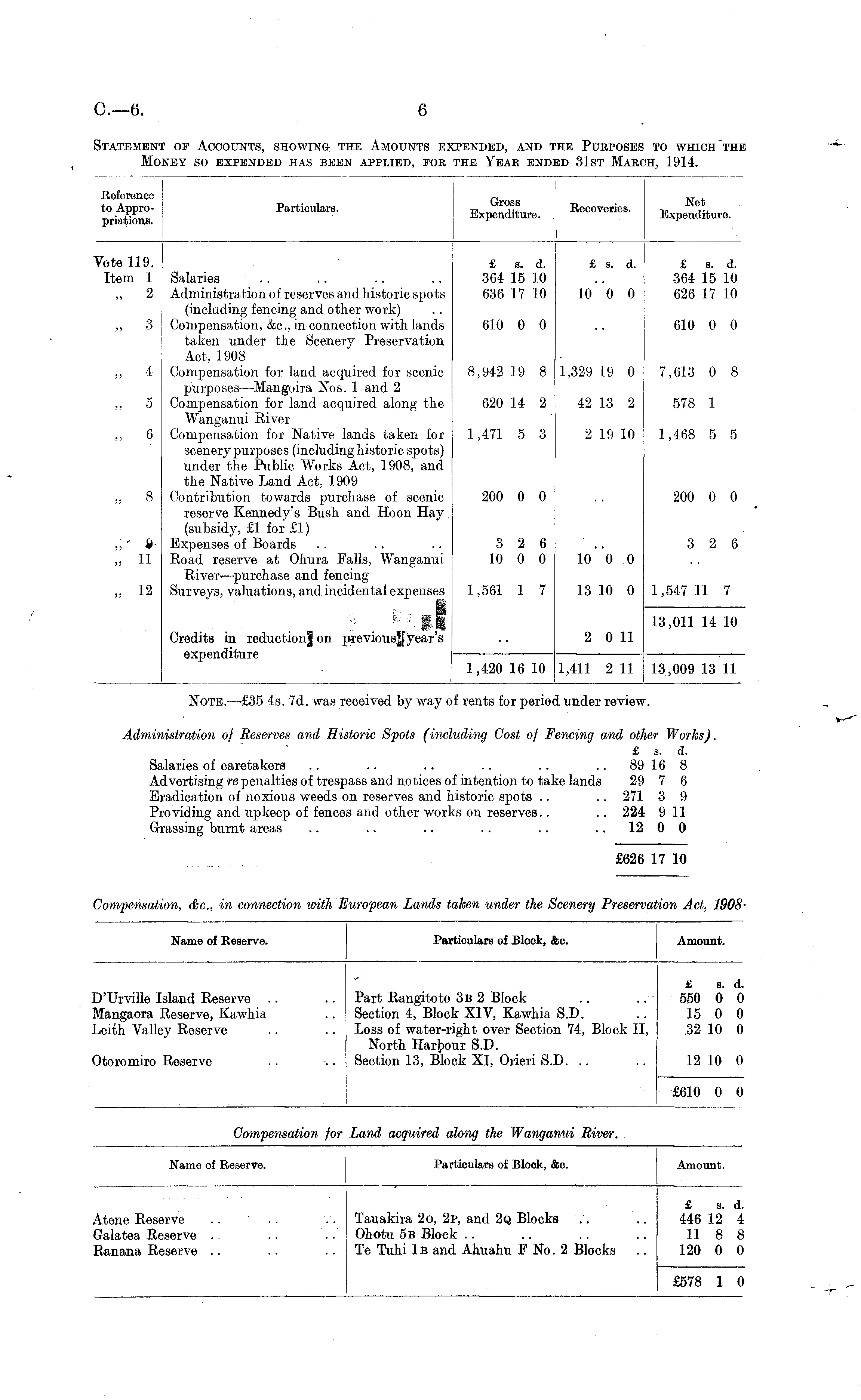 Reference to Appropriations. Particulars. Gross Expenditure. Recoveries. Net Expenditure. r ote 119. Item 1 „ 2 Salaries Administration of reserves and historic spots (including fencing and other work) Compensation, &c, in connection with lands taken under the Scenery Preservation Act, 1908 Compensation for land acquired for scenic purposes —Mangoira Nos. 1 and 2 Compensation for land acquired along the Wanganui River Compensation for Native lands taken for scenery purposes (including historic spots) under the Public Works Act, 1908, and the Native Land Act, 1909 Contribution towards purchase of scenic reserve Kennedy's Bush and Hoon Hay (subsidy, £1 for £1) Expenses of Boards Road reserve at Ohura Falls, Wanganui River—purchase and fencing Surveys, valuations, and incidental expenses Credits in reduction! on previous|[year's expenditure £ s. d. 364 15 10 636 17 10 £ s. d. £ s. d. 364 15 10 626 17 10 10 0 0 » 3 610 0 0 610 0 0 „ 4 8,942 19 8 1,329 19 0 7,613 0 8 „ 5 620 14 2 42 13 2 578 1 ., 6 1,471 5 3 2 19 10 1,468 5 5 » 8 200 0 0 200 0 0 „ 9 ., 11 3 2 6 10 0 0 3 2 6 10 0 0 „ 12 1,561 1 7 13 10 0 1,547 11 7 2 0 11 13,011 14 10 1,420 16 10 1,411 2 11 13,009 13 11 Note. —£35 4s. 7d. was received by way pf rents for perio< under re vie -