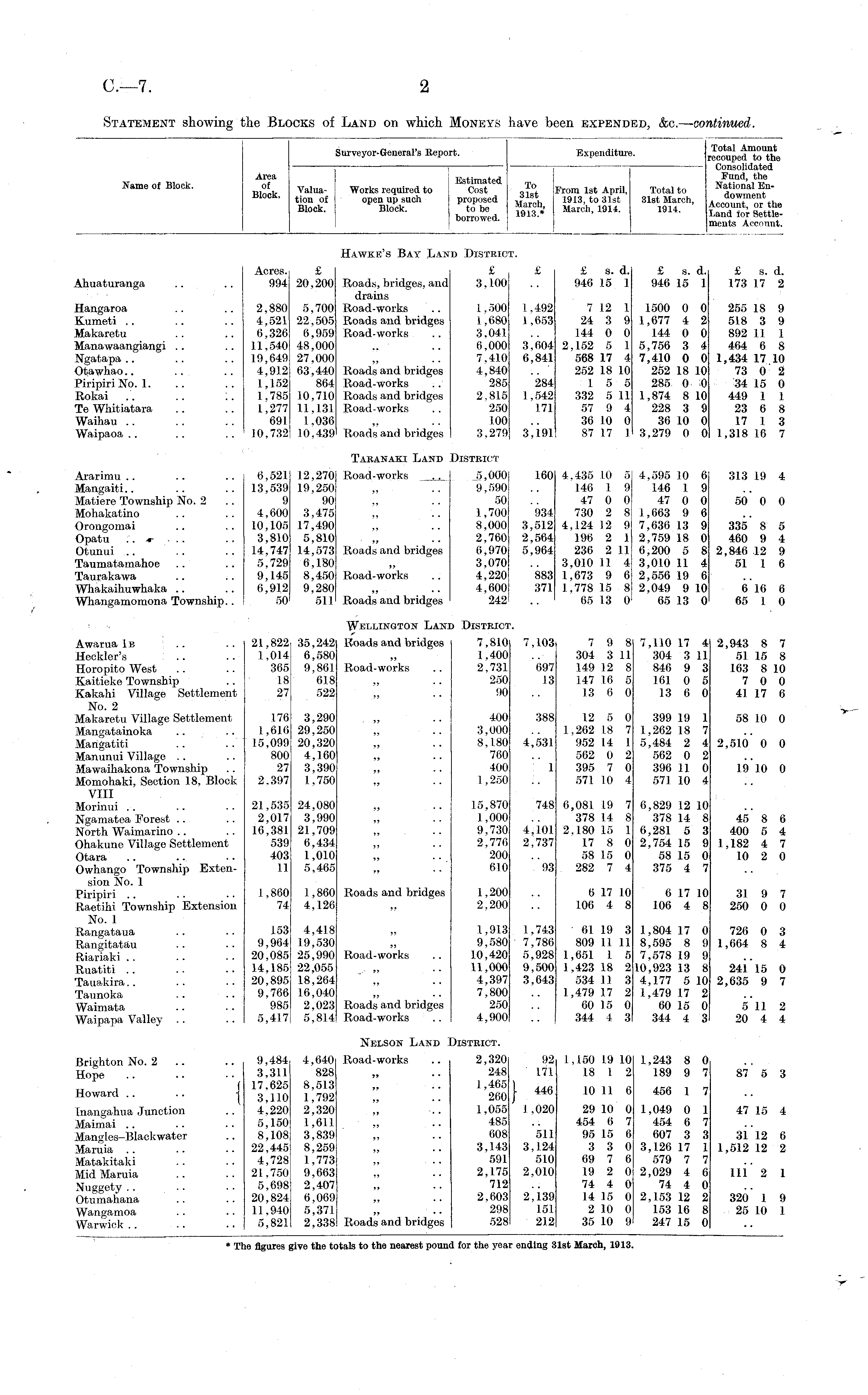 Name of Block. Area of Block, Valuation of Block. Surveyor-General's Report. Works required to open up such Block. Estimated Cost proposed to be borrowed. To ot.i From 1st April. March 1913 > t0 Sl8t 1913 * March . 191 *- Expenditi Total Amount recouped to the Consolidated Fund, the National Endowment Account, or the Land for Settlements Account. Total to 31st March, 1914. Hawkh's Bay Lan D District r. Acres. £ 994 20,200 2,880 5,700 4,521 22,505 6,326 6,959 11,540 48,000 19,649 27,000 4,912 63,440 1,152 864 1,785 10,710 1,277 11.131 691 1,036 10,732 10.439 Roads, bridges, and drains Road-works Roads and bridges Road-works Roads and bridges Road-works Roads and bridges Road-works Roads and bridges £ 3,100 £ £ £ s. d. 946 15 1 £ s. d. 946 15 1 £ s. d. 173 17 2 Ahuaturanga Hangaroa Kumeti Makaretu Manawaangiangi Ngatapa Otawhao PiripiriNo. 1. Rokai .. .. 1. Te Whitiatara Waihau Waipaoa 1.500 1,680 3,041 6,000 7,410 4,840 285 2,815 250 100 3.279 1,492 I . 653 3,604 6,841 284 1,542 171 3J91 1,492 I . 653 3,604 6,841 284 1,542 171 7 12 1 24 3 9 144 0 0 2,152 5 1 568 17 4 252 18 10 1 5 5 332 5 II 57 9 4 36 10 0 87 17 1 1500 0 0 1,677 4 2 144 0 0 5,756 3 4 7,410 0 0 252 18 10 285 0 0 1,874 8 10 228 3 9 36 10 0 3,279 0 0 255 18 9 518 3 9 892 II 1 464 6 8 1,434 17 10 73 0 2 34 15 0 449 1 1 23 6 8 17 1 3 1,318 16 7 3,191 Ararimu .. Mangaiti Matiere Township No. 2 Mohakatino Orongomai Opatu Otunui Taumatamahoe Taurakawa Whakaihuwhaka Whangamomona Township.. Taranaki Land District 160 934 3,512 2,564 5,964 883 371 4,435 10 5 146 I 9 47 0 0 730 2 8 4,124 12 9 196 2 1 236 2 11 3,010 11 4 1,673 9 6 1,778 15 8 65 13 0 4,595 10 6 146 1 9 47 0 0 1,663 9 6 7,636 13 9 2,759 18 0 6,200 5 8 3,010 11 4 2,556 19 6 2,049 9 10 65 13 0 313 19 4 50 0 0 335 8 5 460 9 4 2,846 12 9 51 1 6 6 16 6 65 1 0 6,521 12,270 13,539 19,250 9 90 4,600 3,475 10,105 17,490 3,810 5,810 14,747 14,573 5,729 6,180 9,145 8,450 6,912 9,280 50 511 Road-works __^_ Roads and bridges Road-works Roads and bridges 5,000 9,590 50 1,700 8,000 2,760 6,970 3,070 4,220 4,600 242 Awarua 1b Heckler's Koropito West Kaitieko Township Kakahi Village Settlement No. 2 Makaretu Village Settlement Mangatainoka Mangatiti Manunui Village Mawaihakona Township Momohaki, Section 18, Block VIII Morinui Ngamatea Forest North Waimarino Ohakune Village Settlement Otara Owhango Township Extension No. 1 Piripiri Raetihi Township Extension No. 1 Rangataua Rangitatau Riariaki Ruatiti Tauakira Taunoka .. Waimata Waipapa Valley 21,822 35,242 1 ,014 6,580 365 9,861 18 618 27 522 Wellington Lani Roads and bridges Road-works d District 7,810 1,400 2,731 250 90 7,103 697 13 7 9 8 304 3 11 149 12 8 147 16 5 13 6 0 7,110 17 4 304 3 11 846 9 3 161 0 5 13 6 0 2,943 8 7 51 15 8 163 8 10 7 0 0 41 17 6 176 3,290 1,616 29,250 15,099 20,320 800 4,160 27 3,390 2,397 1,750 400 3,000 8,180 760 400 1,250 388 4,531 1 12 5 0 1,262 18 7 952 14 I 562 0 2 395 7 0 571 10 4 399 19 1 1,262 18 7 5,484 2 4 562 0 2 396 11 0 571 10 4 58 10 0 2,510 0 0 19 10 0 21,535 24,080 2,017 3,990 16,381 21,709 539 6,434 403 1,010 11 5,465 15,870 1,000 9,730 2,776 200 610 748 4J01 2,737 93 6,081 19 7 378 14 8 2.180 15 1 17 8 0 58 15 0 282 7 4 6,829 12 10 378 14 8 6,281 5 3 2,754 15 9 58 15 0 375 4 7 45 8 6 400 5 4 1,182 4 7 10 2 0 1,860 1,860 74 4,126 Roads and bridges 1,200 2,200 6 17 10 106 4 8 6 17 10 106 4 8 31 9 7 250 0 0 153 4,418 9,964 19,530 20,085 25,990 14,185 22,055 20,895 18,264 9,766 16,040 985 2,023 5,417 5,814 Road-works Roads and bridges Road-works 1,913 9,580 10,420 11,000 4,397 7,800 250 4,900 1,743 7,786 5,928 9,500 3,643 61 19 3 809 11 11 1,651 1 5 1,423 18 2 534 11 3 1,479 17 2 60 15 0 344 4 3 1,804 17 0 8,595 8 9 7,578 19 9 10,923 13 8 4,177 5 10 1,479 17 2 60 15 0 344 4 3 726 0 3 1,664 8 4 24i 15 0 2,635 9 7 5 11 2 20 4 4 Nelson Land ] District. 92 171 1,1.50 19 10 18 1 2 ' 1,243 8 0 ! 189 9 7 87 5 3 Brighton No. 2 .. Hope Howard .. .. -j 9,484 4,640 3,311 828 17,625 8,513 3,110 1,792 4,220 2,320 5,150 1,611 8,108 3,839 22,445 8,259 4,728 1,773 21,750 9,663 5,698 2,407 20,824 6,069 11,940 5,371 5,821 2,338 4,640 828 8,513 1,792 2,320 1,611 3,839 8,259 1,773 9,663 2,407 6,069 5,371 2,338 Road-works Roads and bridges 2,320 248 1,465 260 1,055 485 608 3,143 591 2,175 712 2,603 298 528 | 446 10 11 6 456 1 7 Inangahua Junction Maimai .. Mangles-Blackwater Maruia Matakitaki Mid Maruia Nuggety .. ... Otumahana Wangamoa Warwick I ,020 511 3,124 510 2,010 2,139 151 212 29 10 0 454 6 7 95 15 6 3 3 0 69 7 6 19 2 0 74 4 0 14 15 0 2 10 0 35 10 9 i 1,049 0 1 454 6 7 607 3 3 < 3,126 17 1 579 7 7 2,029 4 6 74 4 0 2,153 12 2 153 16 8 247 15 0 47 15 4 31 12 6 1,512 12 2 111 2 1 320 1 9 25 10 1 * The figures give the totals to the nearest pound for the year ending 31st March, 1913.
