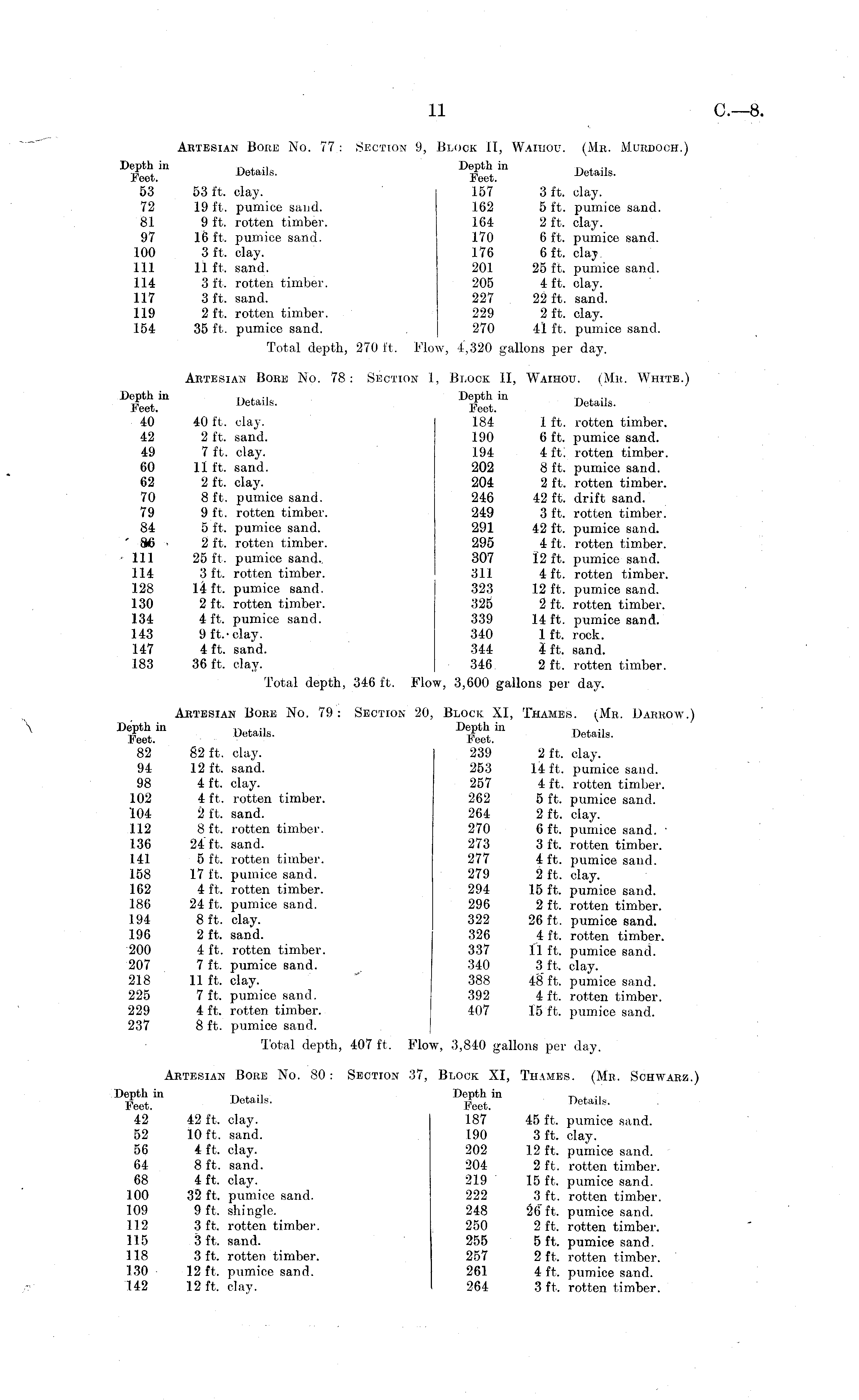 Total depth, 407 ft. Flow, 3,840 gallons per day. Artesian Bore No. 80: Section 37, Block XI, Thames. (Mr. Schwahz.)