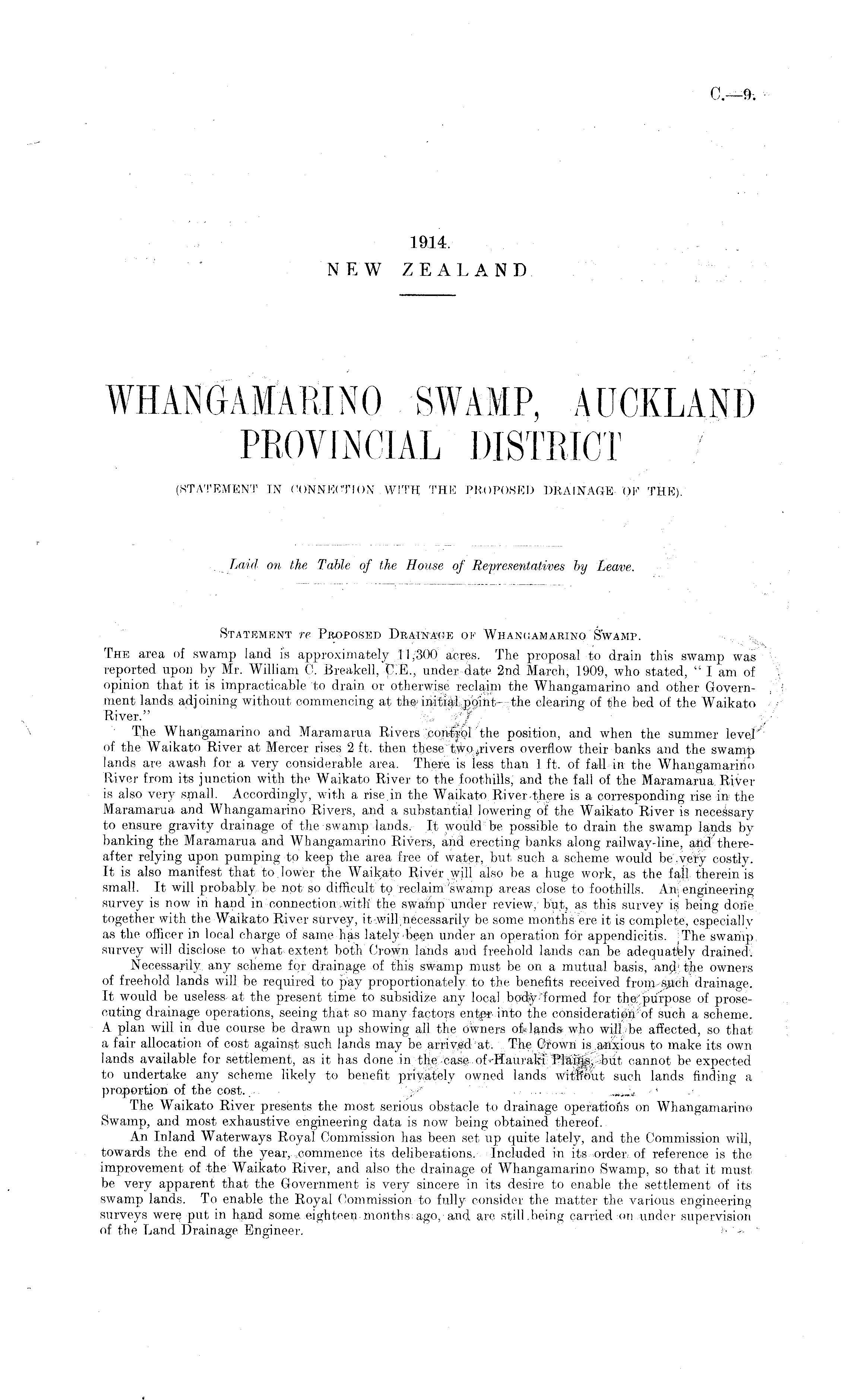 Statement re Proposed Drainage of Whangamarino" Swamp. The area of swamp land is approximately 11/300 acres. The proposal to drain this swamp was reported upon by Mr. William C. Breakell, C.E., under date 2nd March, 1909, who stated, " I am of opinion that it is impracticable to drain or otherwise reclaim the Whangamarino and other Government lands adjoining without commencing at the*initial point- the clearing of the bed of the Waikato River." The Whangamarino and Maramarua Rivers ;.con#ol the position, and when the summer level of the Waikato River at Mercer rises 2 ft. then these two .rivers overflow their banks and the swamp lands are awash for a very considerable area. There is less than 1 ft. of fall in the Whangamarino River from its junction with the Waikato River to the foothills, and the fall of the Maramarua. River is also very small. Accordingly, with a rise, in the Waikato River .there is a corresponding rise in the Maramarua and Whangamarino Rivers, and a substantial lowering of the Waikato River is necessary to ensure gravity drainage of the swamp lands. It would "be possible to drain the swamp lands by banking the Maramarua and Whangamarino Rivers, and erecting banks along railway-line, and'thereafter relying upon pumping to keep the area free of water, but such a scheme would be .very costly. It is also manifest that to.lower the Waikato River will also be a huge work, as the fall therein is small. It will probably be not so difficult to reclaim swamp areas close to foothills. An, engineeringsurvey is now in hand in connection.:.with the swamp under review, but, as this survey is being done together with the Waikato River survey, it-wUl;necessarily be some months ere it is complete, especially as the officer in local charge of same has lately'been under an operation for appendicitis. ;The swamp survey will disclose to what extent both Crown lands and freehold lands can be adequately drained; Necessarily, any scheme for drainage of this swamp must be on a mutual basis, and'the owners of freehold lands will be required to pay proportionately to the benefits received frorn-sjich drainage. It would be useless at the present time to subsidize any local body-formed for the:'.purpose of prosecuting drainage operations, seeing that so many factors ente-r into the consideratipii'of such a scheme. A plan will in due course be drawn up showing all the owners oftland-a who will be affected, so that a fair allocation of cost against such lands may be arriyedat. The Crown is anxious to make its own lands available for settlement, as it has done in the case of-Hauraki PlaihjS, but cannot be expected to undertake any scheme likely to benefit privately owned lands witSo'ut such lands finding a proportion of the cost. ; „..,.., The Waikato River presents the most serious obstacle to drainage operations on Whangamarino Swamp, and most exhaustive engineering data is now being obtained thereof. An Inland Waterways Royal Commission has been set up quite lately, and the Commission will, towards the end of the year,, commence its deliberations. Included in its order, of reference is the improvement of the Waikato River, and also the drainage of Whangamarino Swamp, so that it must be very apparent that the Government is very sincere in its desire to enable the settlement of its swamp lands. To enable the Royal Commission to fully consider the matter the various engineering surveys were put in hand some eighteen months ago, and are still.being carried on under supervision of the Land Drainage, Engineer.