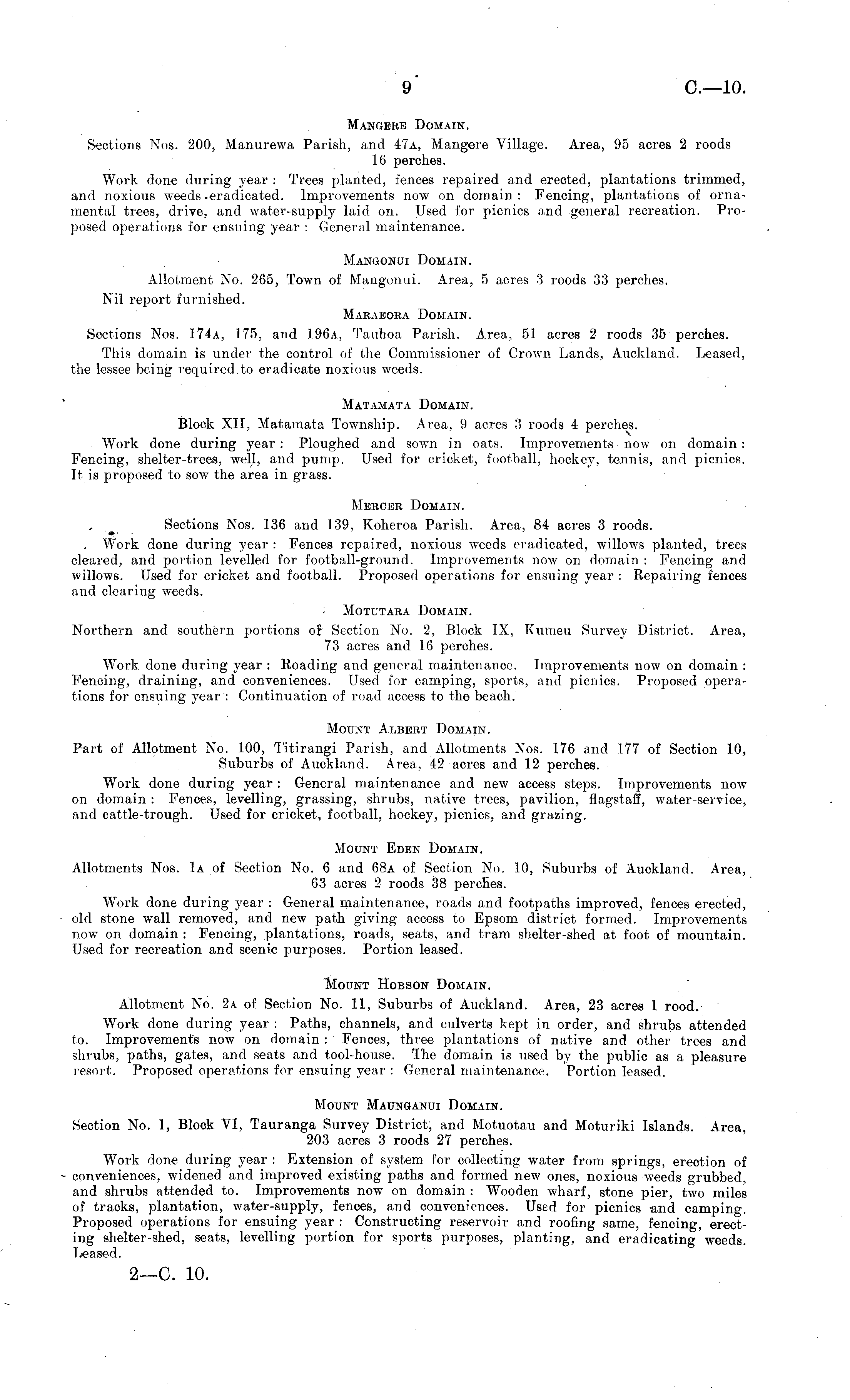 Mangere Domain. Sections Nos. 200, Manurewa Parish, and 47a, Mangere Village. Area, 95 acres 2 roods 16 perches. Work done during year : Trees planted, fences repaired and erected, plantations trimmed, and noxious weeds-eradicated. Improvements now on domain: Fencing, plantations of ornamental trees, drive, and water-supply laid on. Used for picnics and general recreation. Proposed operations for ensuing year : General maintenance. Mangonui Domain. Allotment No. 265, Town of Mangonui. Area, 5 acres 3 roods 33 perches. Nil report furnished. Maraeora Domain. Sections Nos. 174 a, 175, and 196 a, Tauhoa Parish. Area, 51 acres 2 roods 35 perches. This domain is under the control of the Commissioner of Crown Lands, Auckland. Leased, the lessee being required to eradicate noxious weeds. Matamata Domain. Block XII, Matamata Township. Area, 9 acres 3 roods 4 perches. Work done during year: Ploughed and sown in oats. Improvements now on domain: Fencing, shelter-trees, well, and pump. Used for cricket, football, hockey, tennis, and picnics. It is proposed to sow the area in grass. Mercer Domain. Sections Nos. 136 and 139, Koheroa Parish. Area, 84 acres 3 roods. Work done during year : Fences repaired, noxious weeds eradicated, willows planted, trees cleared, and portion levelled for football-ground. Improvements now on domain : Fencing and willows. Used for cricket and football. Proposed operations for ensuing year : Repairing fences and clearing weeds. Motutara Domain. Northern and southern portions of Section No. 2, Block IX, Kumeu Survey District. Area, 73 acres and 16 perches. Work done during year : Roading and general maintenance. Improvements now on domain : Fencing, draining, and conveniences. Used for camping, sports, and picnics. Proposed operations for ensuing year : Continuation of road access to the beach. Mount Albert Domain. Part of Allotment No. 100, Titirangi Parish, and Allotments Nos. 176 and 177 of Section 10, Suburbs of Auckland. Area, 42 acres and 12 perches. Work done during year : General maintenance and new access steps. Improvements now on domain : Fences, levelling, grassing, shrubs, native trees, pavilion, flagstaff, water-service, and cattle-trough. Used for cricket, football, hockey, picnics, and grazing. Mount Eden Domain. Allotments Nos. 1a of Section No. 6 and 68a of Section No. 10, Suburbs of Auckland. Area, 63 acres 2 roods 38 perches. Work done during year : General maintenance, roads and footpaths improved, fences erected, old stone wall removed, and new path giving access to Epsom district formed. Improvements now on domain : Fencing, plantations, roads, seats, and tram shelter-shed at foot of mountain. Used for recreation and scenic purposes. Portion leased. Mount Hobson Domain. Allotment No. 2a of Section No. 11, Suburbs of Auckland. Area, 23 acres 1 rood. Work done during year : Paths, channels, and culverts kept in order, and shrubs attended to. Improvements now on domain : Fences, three plantations of native and other trees and shrubs, paths, gates, and seats and tool-house. Ike domain is used by the public as a pleasure resort. Proposed operations for ensuing year : General maintenance. Portion leased. Mount Maunganui Domain. Section No. 1, Block VI, Tauranga Survey District, and Motuotau and Moturiki Islands. Area, 203 acres 3 roods 27 perches. Work done during year : Extension of system for collecting water from springs, erection of conveniences, widened and improved existing paths and formed new ones, noxious weeds grubbed, and shrubs attended to. Improvements now on domain : Wooden wharf, stone pier, two miles of tracks, plantation, water-supply, fences, and conveniences. Used for picnics and camping. Proposed operations for ensuing year : Constructing reservoir and roofing same, fencing, erecting shelter-shed, seats, levelling portion for sports purposes, planting, and eradicating weeds. Leased.