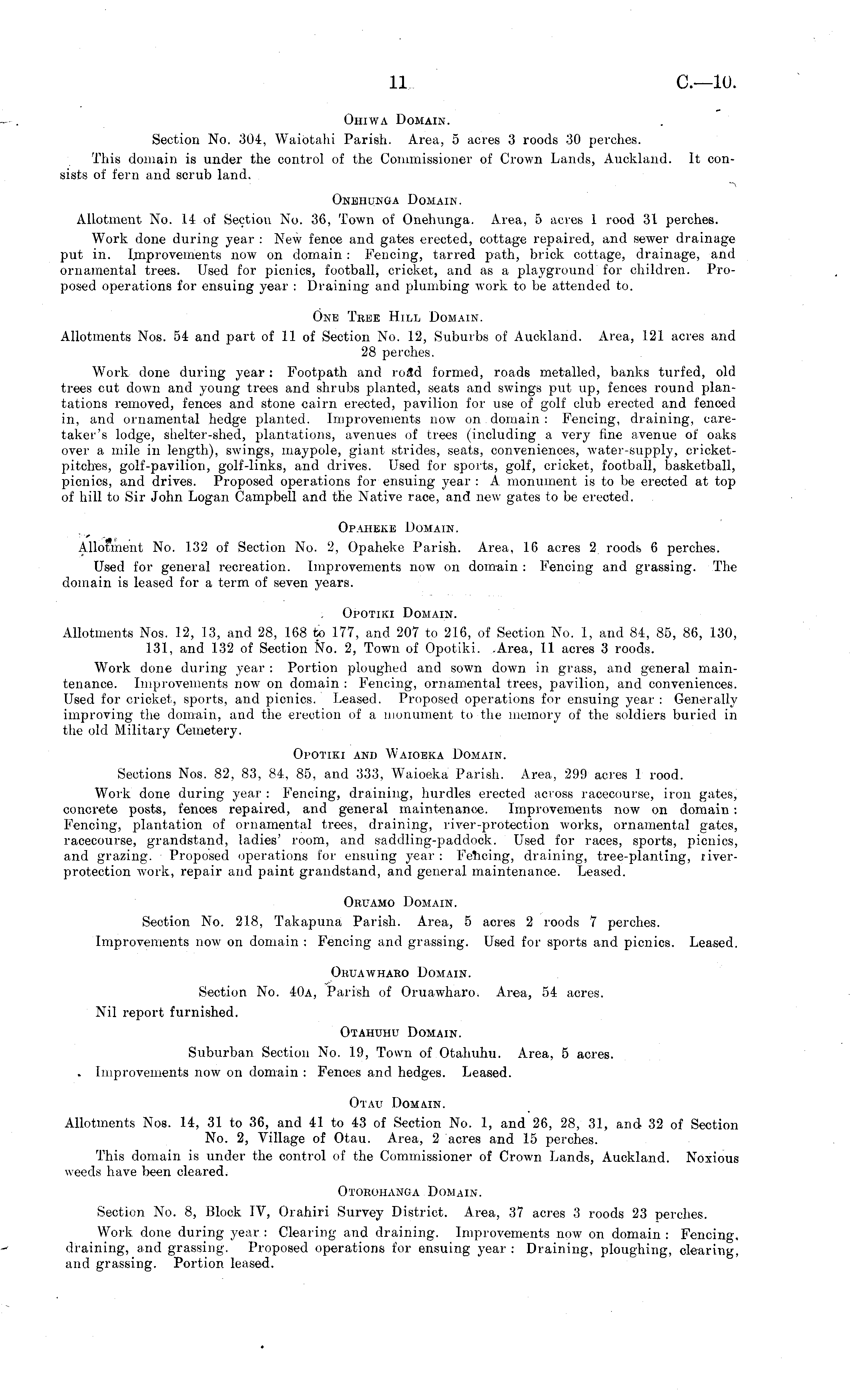 Ohiwa Domain. Section No. 304, Waiotahi Parish. Area, 5 acres 3 roods 30 perches. This domain is under the control of the Commissioner of Crown Lands, Auckland. It consists of fern and scrub land. -\ Onehunga Domain. Allotment No. 14 of Section No. 36, Town of Onehunga. Area, 5 acres 1 rood 31 perches. Work done during year : New fence and gates erected, cottage repaired, and sewer drainage put in. Improvements now on domain : Fencing, tarred path, brick cottage, drainage, and ornamental trees. Used for picnics, football, cricket, and as a playground for children. Proposed operations for ensuing year : Draining and plumbing work to be attended to. One Tree Hill Domain. Allotments Nos. 54 and part of 11 of Section No. 12, Suburbs of Auckland. Area, 121 acres and 28 perches. Work done during year: Footpath and road formed, roads metalled, banks turfed, old trees cut down and young trees and shrubs planted, seats and swings put up, fences round plantations removed, fences and stone cairn erected, pavilion, for use of golf club erected and fenced in, and ornamental hedge planted. Improvements now on domain : Fencing, draining, caretaker's lodge, shelter-shed, plantations, avenues of trees (including a very fine avenue of oaks over a mile in length), swings, maypole, giant strides, seats, conveniences, water-supply, cricketpitches, golf-pavilion, golf-links, and drives. Used for sports, golf, cricket, football, basketball, picnics, and drives. Proposed operations for ensuing year : A monument is to be erected at top of hill to Sir John Logan Campbell and the Native race, and new gates to be erected. Opaheke Domain. Allotment No. 132 of Section No. 2, Opaheke Parish. Area, 16 acres 2 roods 6 perches. Used for general recreation. Improvements now on domain : Fencing and grassing. The domain is leased for a term of seven years. Opotiki Domain. Allotments Nos. 12, 13, and 28, 168 to 177, and 207 to 216, of Section No. 1, and 84, 85, 86, 130, 131, and 132 of Section No. 2, Town of Opotiki. .Area, II acres 3 roods. Work done during year : Portion ploughed and sown down in grass, and general maintenance. Improvements now on domain : Fencing, ornamental trees, pavilion, and conveniences. Used for cricket, sports, and picnics. Leased. Proposed operations for ensuing year : Generally improving the domain, and the erection of a monument to the memory of the soldiers buried in the old Military Cemetery. Opotiki and Waioeka Domain. Sections Nos. 82, 83, 84, 85, and 333, Waioeka Parish. Area, 299 acres 1 rood. Work done during year : Fencing, draining, hurdles erected across racecourse, iron gates, concrete posts, fences repaired, and general maintenance. Improvements now on domain : Fencing, plantation of ornamental trees, draining, river-protection works, ornamental gates, racecourse, grandstand, ladies' room, and saddling-paddock. Used for races, sports, picnics, and grazing. Proposed operations for ensuing year : Fencing, draining, tree-planting, tiverprotection work, repair and paint grandstand, and general maintenance. Leased. Oruamo Domain. Section No. 218, Takapuna Parish. Area, 5 acres 2 roods 7 perches. Improvements now on domain : Fencing and grassing. Used for sports and picnics. Leased. Oruawharo Domain. Section No. 40a, Parish of Oruawharo. Area, 54 acres. Nil report furnished. Otahuhu Domain. Suburban Section No. 19, Town of Otahuhu. Area, 5 acres. . Improvements now on domain : Fences and hedges. Leased. Otau Domain. Allotments Nos. 14, 31 to 36, and 41 to 43 of Section No. 1, and 26, 28, 31, and 32 of Section No. 2, Village of Otau. Area, 2 acres and 15 perches. This domain is under the control of the Commissioner of Crown Lands, Auckland. Noxious weeds have been cleared. Otorohanga Domain. Section No. 8, Block IV, Orahiri Survey District. Area, 37 acres 3 roods 23 perches. Work done during year : Clearing and draining. Improvements now on domain : Fencing, draining, and grassing. Proposed operations for ensuing year : Draining, ploughing, clearing, and grassing. Portion leased.
