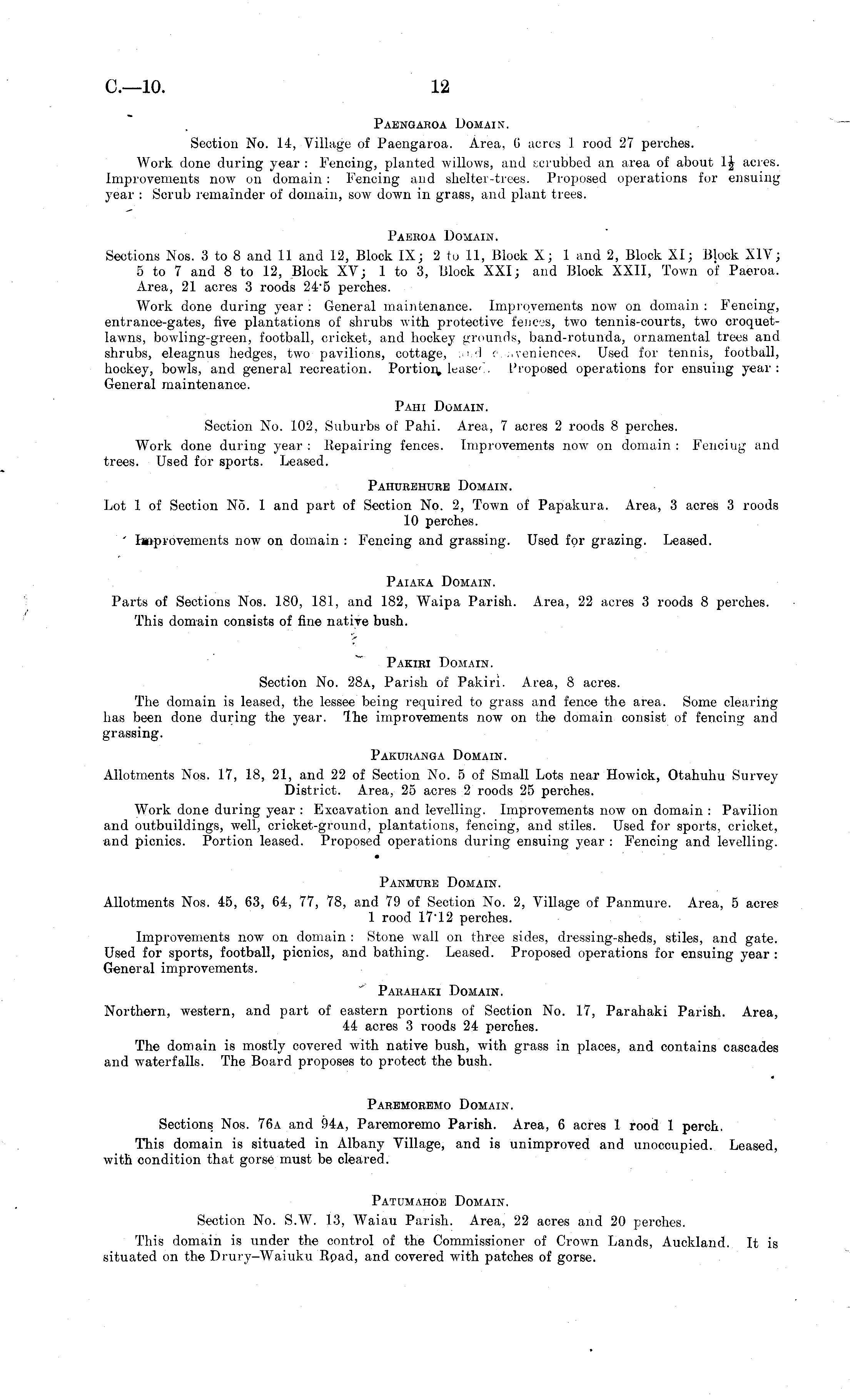 Paengaroa Domain". Section No. 14, Village of Paengaroa. Area, 6 acres 1 rood 27 perches. Work done during year : Fencing, planted willows, and scrubbed an area of about 1J acres. Improvements now on domain : Fencing and shelter-trees. Proposed operations for ensuing year : Scrub remainder of domain, sow down in grass, and plant trees. Paeroa Domain. Sections Nos. 3 to 8 and 11 and 12, Block IX; 2 to 11, Block X; 1 and 2, Block XI; Block XIV; 5 to 7 and 8 to 12, Block XV; 1 to 3, Block XXI; and Block XXII, Town of Paeroa. Area, 21 acres 3 roods 245 perches. Work done during year : General maintenance. Improvements now on domain : Fencing, entrance-gates, five plantations of shrubs with protective fences, two tennis-courts, two croquetlawns, bowling-green, football, cricket, and hockey grounds, band-rotunda, ornamental trees and shrubs, eleagnus hedges, two pavilions, cottage, :>> d <■ ..veniences. Used for tennis, football, hockey, bowls, and general recreation. Portion, lease'". Proposed operations for ensuing year: General maintenance. Pahi Domain. Section No. 102, Suburbs of Pahi. Area, 7 acres 2 roods 8 perches. Work done during year : Repairing fences. Improvements now on domain : Fencing and trees. Used for sports. Leased. Pahurehure Domain. Lot 1 of Section No. 1 and part of Section No. 2, Town of Papakura. Area, 3 acres 3 roods 10 perches. Improvements now on domain : Fencing and grassing. Used for grazing. Leased. Paiaka Domain. Parts of Sections Nos. 180, 181, and 182, Waipa Parish. Area, 22 acres 3 roods 8 perches. This domain consists of fine native bush. Pakiri Domain. Section No. 28a, Parish of Pakiri. Area, 8 acres. The domain is leased, the lessee being required to grass and fence the area. Some clearing has been done during the year, lhe improvements now on the domain consist of fencing and grassing. Pakuranga Domain. Allotments Nos. 17, 18, 21, and 22 of Section No. 5 of Small Lots near Howick, Otahuhu Survey District. Area, 25 acres 2 roods 25 perches. Work done during year : Excavation and levelling. Improvements now on domain : Pavilion and outbuildings, well, cricket-ground, plantations, fencing, and stiles. Used for sports, cricket, and picnics. Portion leased. Proposed operations during ensuing year : Fencing and levelling. Panmure Domain. Allotments Nos. 45, 63, 64, 77, 78, and 79 of Section No. 2, Village of Panmure. Area, 5 acres 1 rood 17"12 perches. Improvements now on domain : Stone wall on three sides, dressing-sheds, stiles, and gate. Used for sports, football, picnics, and bathing. Leased. Proposed operations for ensuing year : General improvements. Parahaki Domain. Northern, western, and part of eastern portions of Section No. 17, Parahaki Parish. Area, 44 acres 3 roods 24 perches. The domain is mostly covered with native bush, with grass in places, and contains cascades and waterfalls. The Board proposes to protect the bush. Paremoremo Domain. Sections Nos. 76a and 94a, Paremoremo Parish. Area, 6 acres 1 rood 1 perch. This domain is situated in Albany Village, and is unimproved and unoccupied. Leased, with condition that gorse must be cleared. Patumahoe Domain. Section No. S.W. 13, Waiau Parish. Area, 22 acres and 20 perches. This domain is under the control of the Commissioner of Crown Lands, Auckland. It is situated on the Drury-Waiuku Rpad, and covered with patches of gorse.
