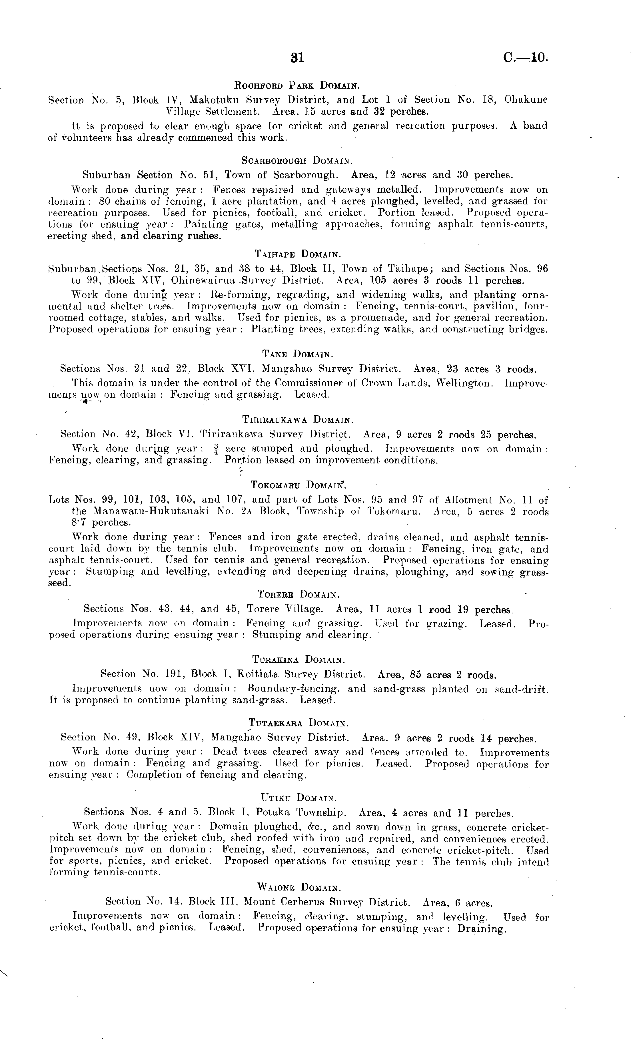 Rochford Park Domain. Section No. 5, Block IV, Makotuku Survey District, and Lot 1 of Section No. 18, Obakune Village Settlement. Area, 15 acres and 32 perches. It is proposed to clear enough space for cricket and general recreation purposes. A band of volunteers has already commenced this work. Scarborough Domain. Suburban Section No. 51, Town of Scarborough. Area, 12 acres and 30 perches. Work done during year : Fences repaired and gateways metalled. Improvements now on domain : 80 chains of fencing, 1 acre plantation, and 4 acres ploughed, levelled, and grassed for recreation purposes. Used for picnics, football, and cricket. Portion leased. Proposed operations for ensuing year : Painting gates, metalling approaches, forming asphalt tennis-courts, erecting shed, and clearing rushes. Taihape Domain. Suburban Sections Nos. 21, 35, and 38 to 44, Block 11, Town of Taihape; and Sections Nos. 96 to 99, Block XIV, Ohinewairua .Survey District. Area, 105 acres 3 roods 11 perches. Work done during year : Re-forming, regrading, and widening walks, and planting ornamental and shelter trees. Improvements now on domain : Fencing, tennis-court, pavilion, fourroomed cottage, stables, and walks. Used for picnics, as a promenade, and for general recreation. Proposed operations for ensuing year : Planting trees, extending walks, and constructing bridges. Tane Domain. Sections Nos. 21 and 22, Block XVI, Mangahao Survey District. Area, 23 acres 3 roods. This domain is under the control of the Commissioner of Crown Lands, Wellington. Improvements now on domain : Fencing and grassing. Leased. TIRIRAUKAWA DOMAIN. Section No. 42, Block VI, Tiriraukawa Survey District. Area, 9 acres 2 roods 25 perches. Work done during year : § acre stumped and ploughed. Improvements now on domain : Fencing, clearing, and grassing. Portion leased on improvement conditions. Tokomaru Domain. Lots Nos. 99, 101, 103, 105, and 107, and part of Lots Nos. 95 and 97 of Allotment No. 11 of the Manawatu-Hukutauaki No. 2a Block, Township of Tokomaru. Area, 5 'acres 2 roods 8"7 perches. Work done during year : Fences and iron gate erected, drains cleaned, and asphalt tenniscourt laid down by the tennis club. Improvements now on domain : Fencing, iron gate, and asphalt tennis-court. Used for tennis and general recreation. Proposed operations for ensuing year : Stumping and levelling, extending and deepening drains, ploughing, and sowing grassseed. Torere Domain. Sections Nos. 43, 44. and 45, Torere Village. Area, II acres 1 rood 19 perches. Improvements now on domain : Fencing and grassing. Used for grazing. Leased. Proposed operations during ensuing year : Stumping and clearing. Turakina Domain. Section No. 191, Block I, Koitiata Survey District. Area, 85 acres 2 roods. Improvements now on domain : Boundary-fencing, and sand-grass planted on sand-drift. It is proposed to continue planting sand-grass. Leased. Tutaekara Domain. Section No. 49, Block XIV, Mangahao Survey District, Area, 9 acres 2 roods 14 perches. Work done during year : Dead trees cleared away and fences attended to. Improvements now on domain : Fencing and grassing. Used for picnics. Leased. Proposed operations for ensuing year : Completion of fencing and clearing. Utiku Domain. Sections Nos. 4 and 5, Block I, Potaka Township. Area, 4 acres and 11 perches. Work done during year : Domain ploughed, &c, and sown down in grass, concrete cricketpitch set down by the cricket club, shed roofed with iron and repaired, and conveniences erected. Improvements now on domain : Fencing, shed, conveniences, and concrete cricket-pitch. Used for sports, picnics, and cricket. Proposed operations for ensuing year : The tennis club intend forming tennis-courts. Waione Domain. Section No. 14, Block Til, Mount Cerberus Survey District. Area, 6 acres. Improvements now on domain : Fencing, clearing, stumping, and levelling. Used for cricket, football, and picnics. Leased. Proposed operations for ensuing year : Draining.