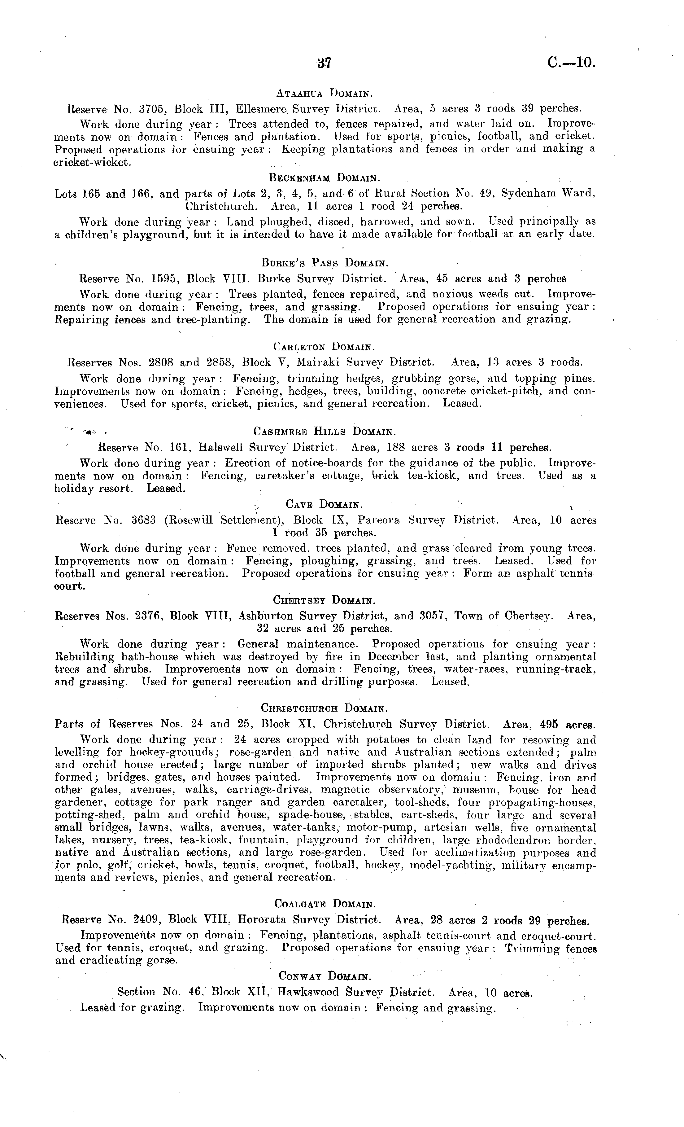 Ataahua Domain. Reserve No. 3705, Block 111, Ellesmere Survey District. Area, 5 acres 3 roods 39 perches. Work done during year : Trees attended to, fences repaired, and water laid on. Improvements now on domain : Fences and plantation. Used for sports, picnics, football, and cricket. Proposed operations for ensuing year : Keeping plantations and fences in order and making a cricket-wicket. Beckenham Domain. Lots 165 and 166, and parts of Lots 2, 3, 4, 5, and 6 of Rural Section No. 49, Sydenham Ward, Christchurch. Area, 11 acres 1 rood 24 perches. Work done during year : Land ploughed, disced, harrowed, and sown. Used principally as a children's playground, but it is intended to have it made available for football at an early date. Burkes Pass Domain. Reserve No. 1595, Block VIII, Burke Survey District. Area, 45 acres and 3 perches Work done during year : Trees planted, fences repaired, and noxious weeds cut. Improvements now on domain : Fencing, trees, and grassing. Proposed operations for ensuing year : Repairing fences and tree-planting. The domain is used for general recreation and grazing. Carleton Domain. Reserves Nos. 2808 and 2858, Block V, Mairaki Survey District. Area, 13 acres 3 roods. Work done during j 7 ear : Fencing, trimming hedges, grubbing gorse, and topping pines. Improvements now on domain : Fencing, hedges, trees, building, concrete cricket-pitch, and conveniences. Used for sports, cricket, picnics, and general recreation. Leased. Cashmere Hills Domain. Reserve No. 161. Halsw 7 ell Survey District. Area, 188 acres 3 roods 11 perches. Work done during year : Erection of notice-boards for the guidance of the public. Improvements now on domain : Fencing, caretaker's cottage, brick tea-kiosk, and trees. Used as a holiday resort. Leased. Cave Domain. % Reserve No. 3683 (Rosewill Settlement), Block IX, Pareora Survey District. Area, 10 acres 1 rood 35 perches. Work done during year : Fence removed, trees planted, and grass cleared from young trees. Improvements now on domain : Fencing, ploughing, grassing, and trees. Leased. Used for football and general recreation. Proposed operations for ensuing year : Form an asphalt tenniscourt. Chertsey Domain. Reserves Nos. 2376, Block VIII, Ashburton Survey District, and 3057, Town of Chertsey. Area, 32 acres and 25 perches. Work done during year : General maintenance. Proposed operations for ensuing year : Rebuilding bath-house which was destroyed by fire in December last, and planting ornamental trees and shrubs. Improvements now on domain : Fencing, trees, water-races, running-track, and grassing. Used for general recreation and drilling purposes. Leased. Christchurch Domain. Parts of Reserves Nos. 24 and 25, Block XI, Christchurch Survey District. Area, 495 acres. Work done during year : 24 acres cropped w 7 ith potatoes to clean land for resowing and levelling for hockey-grounds; rose-garden and native and Australian sections extended; palm and orchid house erected; large number of imported shrubs planted; new walks and drives formed; bridges, gates, and houses painted. Improvements now on domain : Fencing, iron and other gates, avenues, walks, carriage-drives, magnetic observatory, museum, house for head gardener, cottage for park ranger and garden caretaker, tool-sheds, four propagating-houses, potting-shed, palm and orchid house, spade-house, stables, cart-sheds, four large and several small bridges, lawns, walks, avenues, water-tanks, motor-pump, artesian wells, five ornamental lakes, nursery, trees, tea-kiosk, fountain, playground for children, large rhododendron border, native and Australian sections, and large rose-garden. Used for acclimatization purposes and for polo, golf, cricket, bowls, tennis, croquet, football, hockey, model-yachting, military encampments and reviews, picnics, and general recreation. Coalgate Domain. Reserve No. 2409, Block VIII, Hororata Survey District. Area, 28 acres 2 roods 29 perches. Improvements now on domain : Fencing, plantations, asphalt tennis-court and croquet-court. Used for tennis, croquet, and grazing. Proposed operations for ensuing year : Trimming fences and eradicating gorse. Conway Domain. Section No. 46, Block XII, Hawkswood Survey District. Area, 10 acres. Leased for grazing. Improvements now on domain : Fencing and grassing.