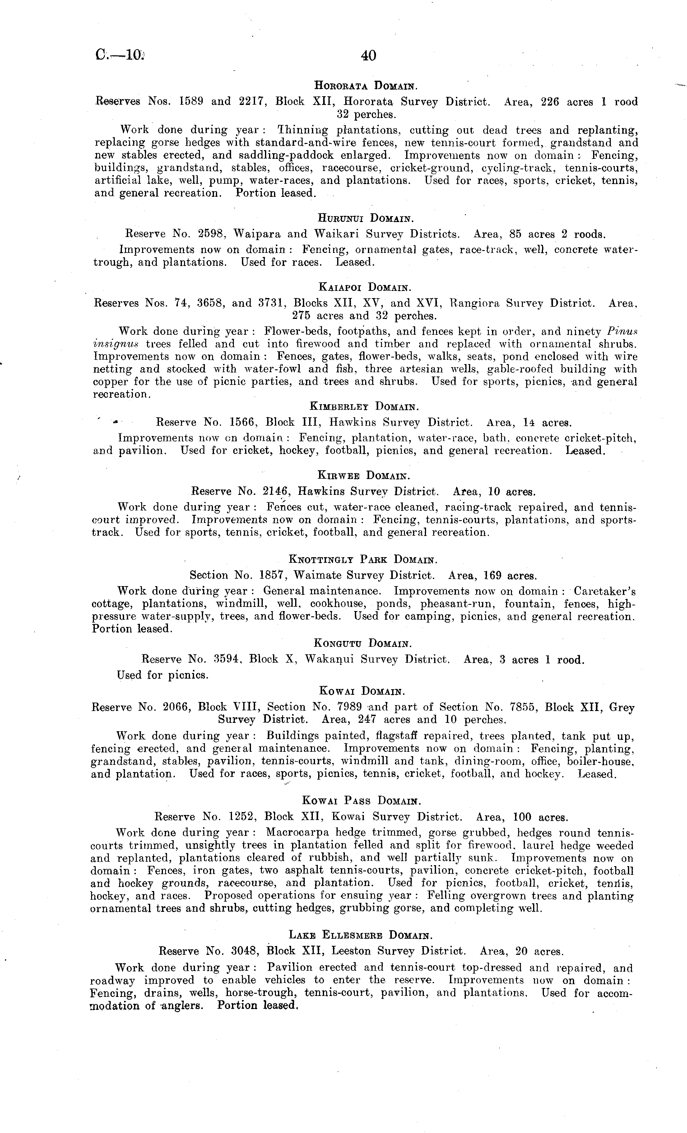 Hororata Domain. Reserves Nos. 1589 and 2217, Block XII, Hororata Survey District. Area, 226 acres 1 rood 32 perches. Work done during year : Thinning plantations, cutting out dead trees and replanting, replacing gorse hedges with standard-and-wire fences, new tennis-court formed, grandstand and new stables erected, and saddling-paddock enlarged. Improvements now on domain : Fencing, buildings, grandstand, stables, offices, racecourse, cricket-ground, cycling-track, tennis-courts, artificial lake, well, pump, water-races, and plantations. Used for races, sports, cricket, tennis, and general recreation. Portion leased. Hurunui Domain. Reserve No. 2598, Waipara and Waikari Survey Districts. Area, 85 acres 2 roods. Improvements now on domain : Fencing, ornamental gates, race-track, well, concrete watertrough, and plantations. Used for races. Leased. Kaiapoi Domain. Reserves Nos. 74, 3658, and 3731, Blocks XII, XV, and XVI, Rangiora Survey District. Area, 275 acres and 32 perches. Work done during year : Flower-beds, footpaths, and fences kept in order, and ninety Finns insignus trees felled and cut into firewood and timber and replaced with ornamental shrubs. Improvements now on domain : Fences, gates, flower-beds, walks, seats, pond enclosed with wire netting and stocked with water-fowl and fish, three artesian wells, gable-roofed building with copper for the use of picnic parties, and trees and shrubs. Used for sports, picnics, and general recreation. Kimberley Domain. Reserve No. 1566, Block 111, Hawkins Survey District. Area, 14 acres. Improvements now on domain : Fencing, plantation, water-race, bath, concrete cricket-pitch, and pavilion. Used for cricket, hockey, football, picnics, and general recreation. Leased. Kirwee Domain. Reserve No. 2146, Hawkins Survey District. Area, 10 acres. Work done during year : Fences cut, water-race cleaned, racing-track repaired, and tenniscourt improved. Improvements now on domain : Fencing, tennis-courts, plantations, and sportstrack. Used for sports, tennis, cricket, football, and general recreation. Knottingly Park Domain. Section No. 1857, Waimate Survey District. Area, 169 acres. Work done during year : General maintenance. Improvements now on domain : Caretaker's cottage, plantations, windmill, well, cookhouse, ponds, pheasant-run, fountain, fences, highpressure w r ater-supply, trees, and flower-beds. Used for camping, picnics, and general recreation. Portion leased. Kongutu Domain. Reserve No. 3594, Block X, Wakanui Survey District, Area, 3 acres 1 rood. Used for picnics. Kowai Domain. Reserve No. 2066, Block VIII, Section No. 7989 and part of Section No. 7855, Block XII, Grey Survey District. Area, 247 acres and 10 perches. Work done during year : Buildings painted, flagstaff repaired, trees planted, tank put up, fencing erected, and general maintenance. Improvements now on domain : Fencing, planting, grandstand, stables, pavilion, tennis-courts, windmill and tank, dining-room, office, boiler-house, and plantation. Used for races, sports, picnics, tennis, cricket, football, and hockey. Leased. Kowai Pass Domain. Reserve No. 1252, Block XII, Kowai Survey District. Area, 100 acres. Work done during year : Macrocarpa hedge trimmed, gorse grubbed, hedges round tenniscourts trimmed, unsightly trees in plantation felled and split for firewood, laurel hedge weeded and replanted, plantations cleared of rubbish, and well partially sunk. Improvements now on domain : Fences, iron gates, two asphalt tennis-courts, pavilion, concrete cricket-pitch, football and hockey grounds, racecourse, and plantation. Used for picnics, football, cricket, tennis, hockey, and races. Proposed operations for ensuing year : Felling overgrown trees and planting ornamental trees and shrubs, cutting hedges, grubbing gorse, and completing well. Lake Ellesmere Domain. Reserve No. 3048, Block XII, Leeston Survey District. Area, 20 acres. Work done during year : Pavilion erected and tennis-court top-dressed and repaired, and roadway improved to enable vehicles to enter the reserve. Improvements now on domain : Fencing, drains, wells, horse-trough, tennis-court, pavilion, and plantations. Used for accommodation of anglers. Portion leased,