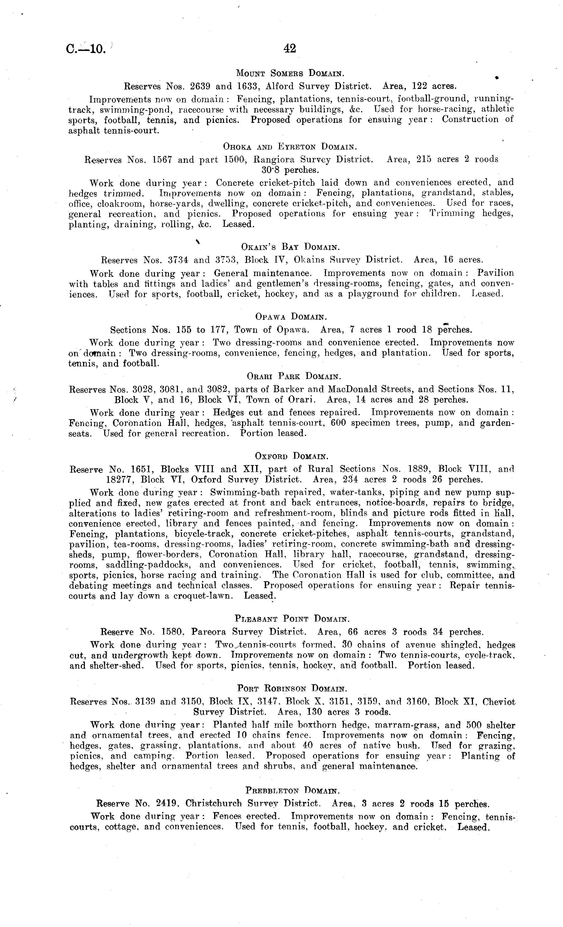 Mount Somers Domain. Reserves Nos. 2639 and 1633, Alford Survey District. Area, 122 acres. Improvements now on domain : Fencing, plantations, tennis-court, football-ground, runningtrack, swimming-pond, racecourse with necessary buildings, &c. Used for horse-racing, athletic sports, football, tennis, and picnics. Proposed operations for ensuing year : Construction of asphalt tennis-court. Ohoka and Eyreton Domain. Reserves Nos. 1567 and part 1500, Rangiora Survey District. Area, 215 acres 2 roods 30"8 perches. Work done during year : Concrete cricket-pitch laid down and conveniences erected, and hedges trimmed. Improvements now on domain : Fencing, plantations, grandstand, stables, office, cloakroom, horse-yards, dwelling, concrete cricket-pitch, and conveniences. Used for races, general recreation, and picnics. Proposed operations for ensuing year : Trimming hedges, planting, draining, rolling, &c. Leased. Okain's Bay Domain. Reserves Nos. 3734 and 3753, Block IV, Okains Survey District, Area, 16 acres. Work done during year : General maintenance. Improvements now on domain : Pavilion with tables and fittings and ladies' and gentlemen's dressing-rooms, fencing, gates, and conveniences. Used for sports, football, cricket, hockey, and as a playground for children. Leased. Opawa Domain. Sections Nos. 155 to 177, Town of Opaw 7 a. Area, 7 acres 1 rood 18 perches. Work done during year : Two dressing-rooms and convenience erected. Improvements now on domain : Two dressing-rooms, convenience, fencing, hedges, and plantation. Used for sports, tennis, and football. Orari Park Domain. Reserves Nos. 3028, 3081, and 3082, parts of Barker and Mac Donald Streets, and Sections Nos. 11, Block V, and 16, Block VI, Town of Orari. Area, 14 acres and 28 perches. Work done during year : Hedges cut and fences repaired. Improvements now on domain : Fencing, Coronation Hall, hedges, "asphalt tennis-court, 600 specimen trees, pump, and gardenseats. Used for general recreation. Portion leased. Oxford Domain. Reserve No. 1651, Blocks VIII and XII, part of Rural Sections Nos. 1889, Block VIII, and 18277, Block VI, Oxford Survey District. Area, 234 acres 2 roods 26 perches. Work done during year : Swimming-bath repaired, water-tanks, piping and new pump supplied and fixed, new gates erected at front and back entrances, notice-boards, repairs to bridge, alterations to ladies' retiring-room and refreshment-room, blinds and picture rods fitted in Kail, convenience erected, library and fences painted, and fencing. Improvements now on domain : Fencing, plantations, bicycle-track, concrete cricket-pitches, asphalt tennis-courts, grandstand, pavilion, tea-rooms, dressing-rooms, ladies' retiring-room, concrete swimming-bath and dressingsheds, pump, flower-borders, Coronation Hall, library hall, racecourse, grandstand, dressingrooms, saddling-paddocks, and conveniences. Used for cricket, football, tennis, swimming,. sports, picnics, horse racing and training. The Coronation Hall is used for club, committee, and debating meetings and technical classes. Proposed operations for ensuing year : Repair tenniscourts and lay down a croquet-lawn. Leased. Pleasant Point Domain. Reserve No. 1580. Pareora Survey District. Area, 66 acres 3 roods 34 perches. Work done during year: Two .tennis-courts formed, 30 chains of avenue shingled, hedges cut, and undergrowth kept down. Improvements now on domain : Two tennis-courts, cycle-track, and shelter-shed. Used for sports, picnics, tennis, hockey, and football. Portion leased. Port Robinson Domain. Reserves Nos. 3139 and 3150, Block IX, 3147. Block X, 3151, 3159, and 3160, Block XI, Cheviot Survey District. Area, 130 acres 3 roods. Work done during year: Planted half mile boxthorn hedge, marram-grass, and 500 shelter and ornamental trees, and erected 10 chains fence. Improvements now on domain : Fencing, hedges, gates, grassing, plantations, and about 40 acres of native bush. Used for grazing, picnics, and camping. Portion leased. Proposed operations for ensuing year : Planting of hedges, shelter and ornamental trees and shrubs, and general maintenance. Prebbleton Domain. Reserve No. 2419, Christchurch Survey District. Area, 3 acres 2 roods 15 perches. Work done during year : Fences erected. Improvements now on domain : Fencing, tenniscourts, cottage, and conveniences. Used for tennis, football, hockey, and cricket. Leased,
