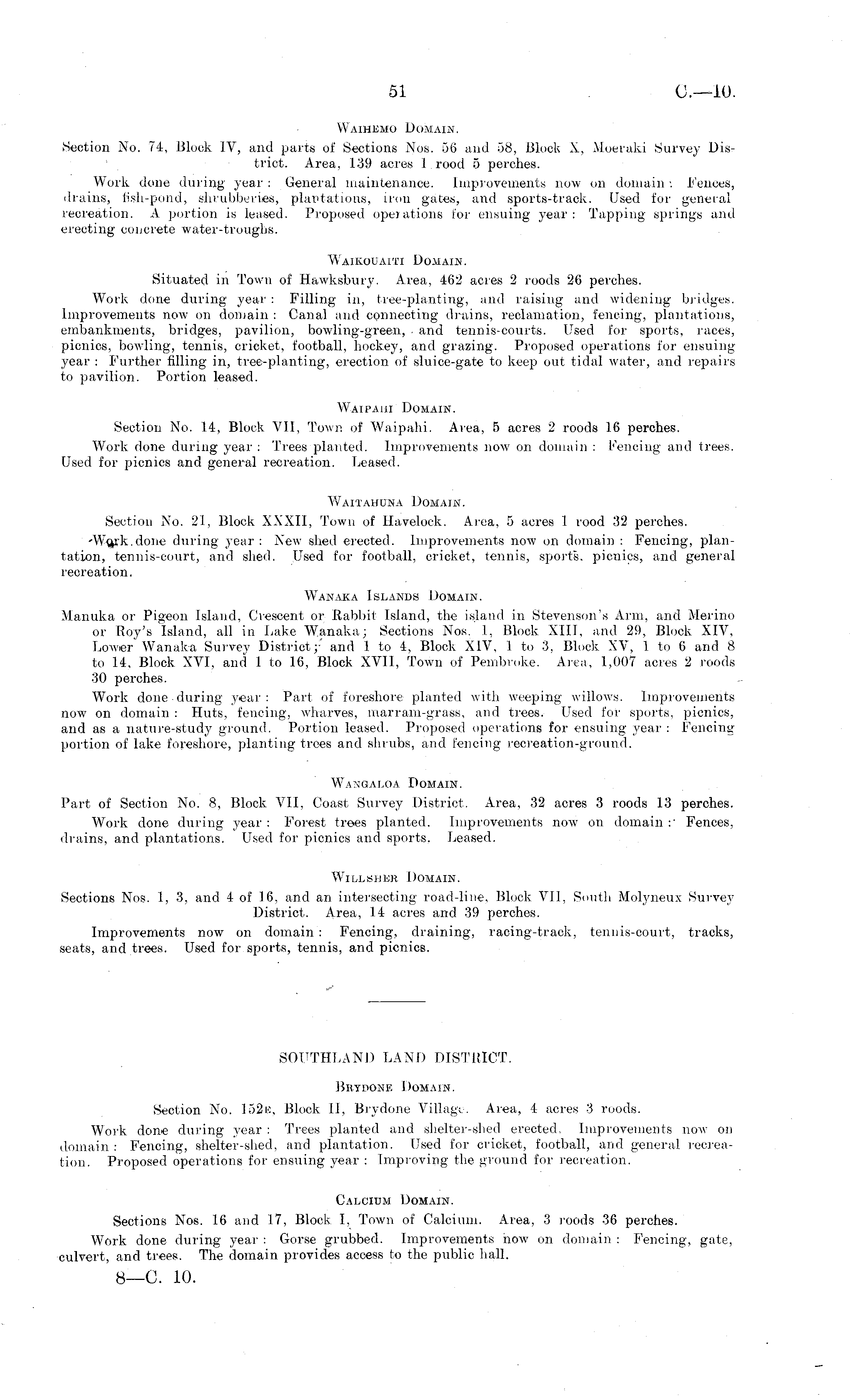SOUTHLAND LAND DISTRICT. Brydone Domain. Section No. 152k, Block 11, Brydone Village. Area, 4 acres 3 roods. Work done during year : Trees planted and shelter-shed erected. Improvements now on domain: Fencing, shelter-shed, and plantation. Used for- cricket, football, and general recreation. Proposed operations for ensuing year : Improving the ground for recreation. Calcium Domain. Sections Nos. 16 and 17, Block I, Town of Calcium. Area, 3 roods 36 perches. Work done during year : Gorse grubbed. Improvements now on domain : Fencing, gate, culvert, and trees. The domain provides access to the public hall.