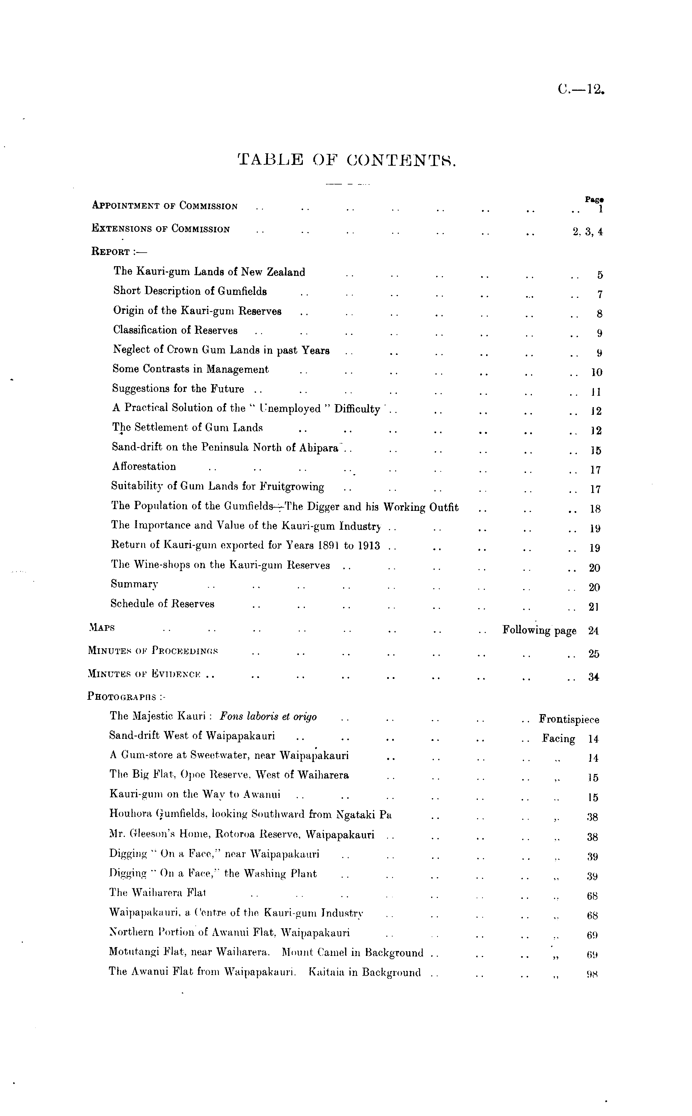 Appointment of Commission Page 1 Extensions or Commission 2, 3, 4 Report :— The Kauri-gum Lands of New Zealand ..5 Short Description of Gumfields .. 7 Origin of the Kauri-gum Reserves .. 8 Classification of Reserves .. 9 Neglect of Crown Gum Lands in past Years .. 9 Some Contrasts in Management ..10 Suggestions for the Future .. .. 11 A Practical Solution of the " Unemployed " Difficulty '.. ..12 The Settlement of Gum Lands .. 12 Sand-drift on the Peninsula North of Ahipara .. 15 Afforestation .. 17 Suitability of Gum Lands for Fruitgrowing ..17 The Population of the Gumfields—The Digger and his Working Outfit .. 18 The Importance and Value of the Kauri-gum Industry ..19 Return of Kauri-gum exported for Years 1891 to 1913 .. 19 The Wine-shops on the Kauri-gum Reserves .. ..20 Summary .. ..20 Schedule of Reserves ..21 Maps Following page 24 Minutes of Proceedings .. 25 Minutes of Evidence .. 34 Photogeaphs:— The Majestic Kauri : Fons laboris et origo .. Frontispiece Sand-drift West of Waipapakauri .. Facing 14 A Gum-store at Sweetwater, near Waipapakauri 14 The Big Flat, Opoe Reserve, West of Waiharera 15 Kauri-gum on the Way to Awanui 15 Houhora Gumfields, looking Southward from Ngataki Pa 38 Mr. Gleeson's Home, Rotoroa Reserve, Waipapakauri .. 38 Digging " On a Face," near Waipapakauri 39 Digging " On a Face," the Washing Plant 39 The Waiharera Flat 68 Waipapakauri, a Centre of the Kauri-gum Industry 68 Northern Portion of Awanui Flat, Waipapakauri 69 Motutangi Flat, near Waiharera. Mount Camel in Background .. 69 The Awanui Flat from Waipapakauri. Kaitaia in Background . . 98